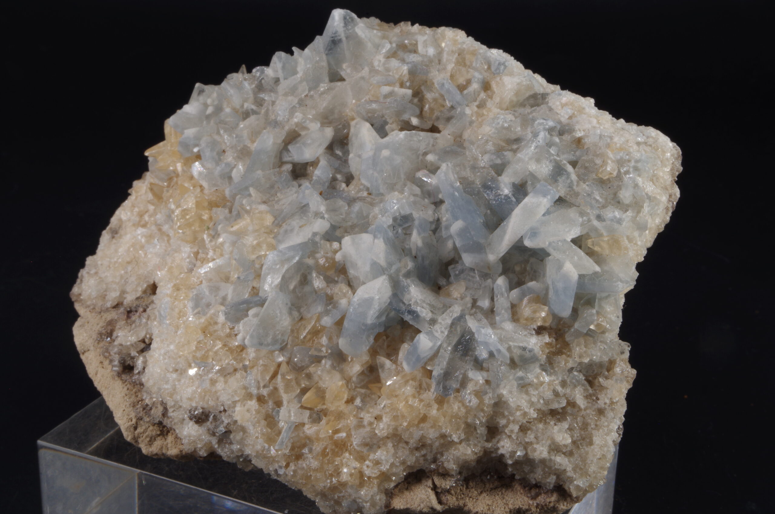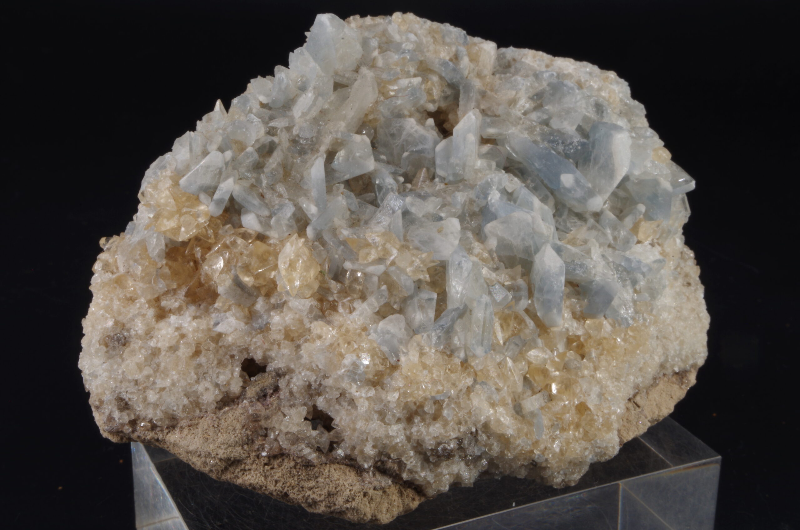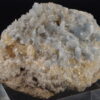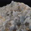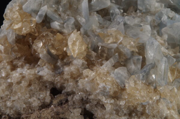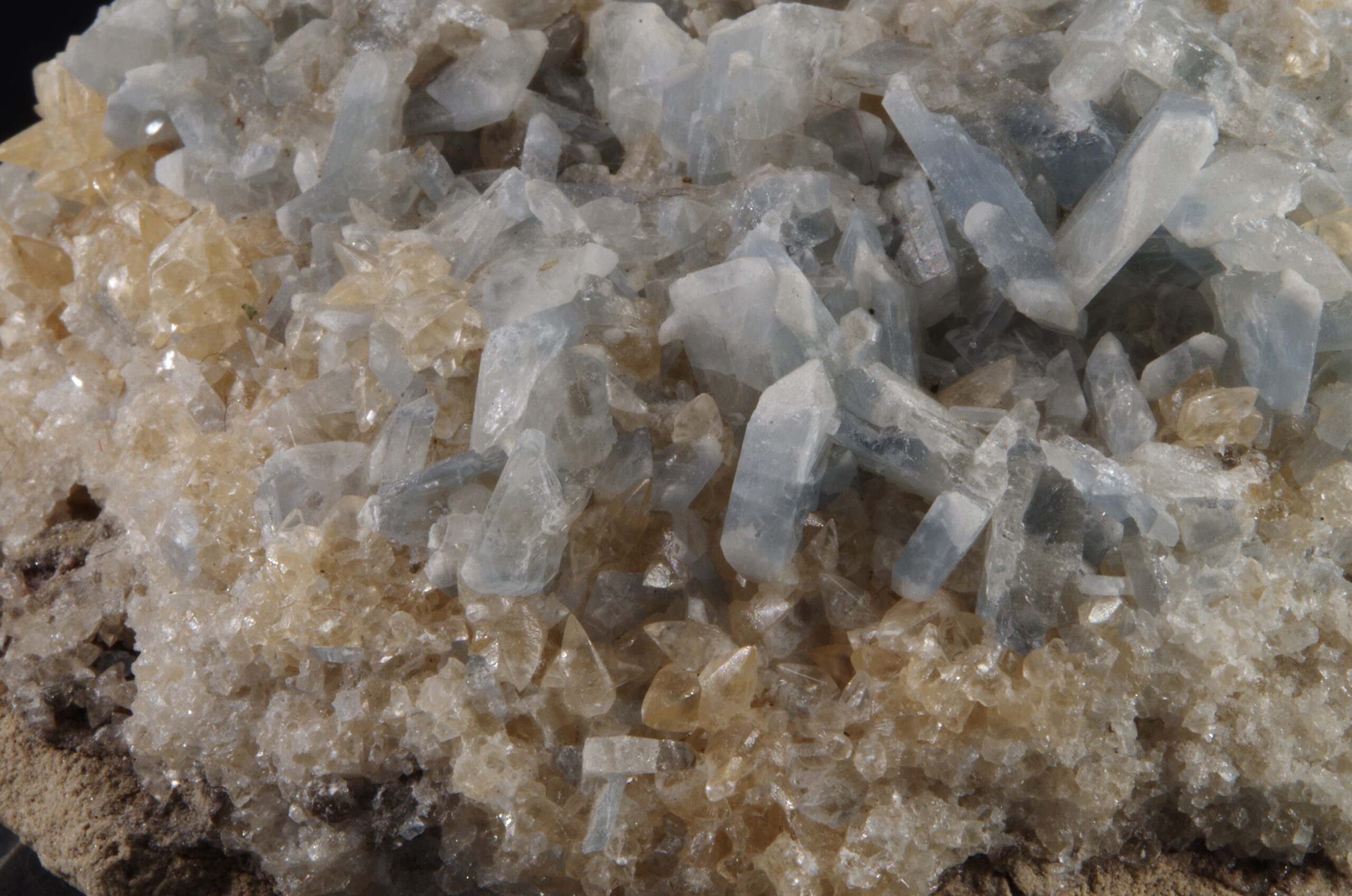 Joli groupe de cristaux de Célestine bleu-gris disposé sur une gangue couverte de petits cristaux de Calcite scalénoédriques dorés.