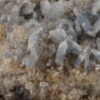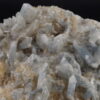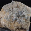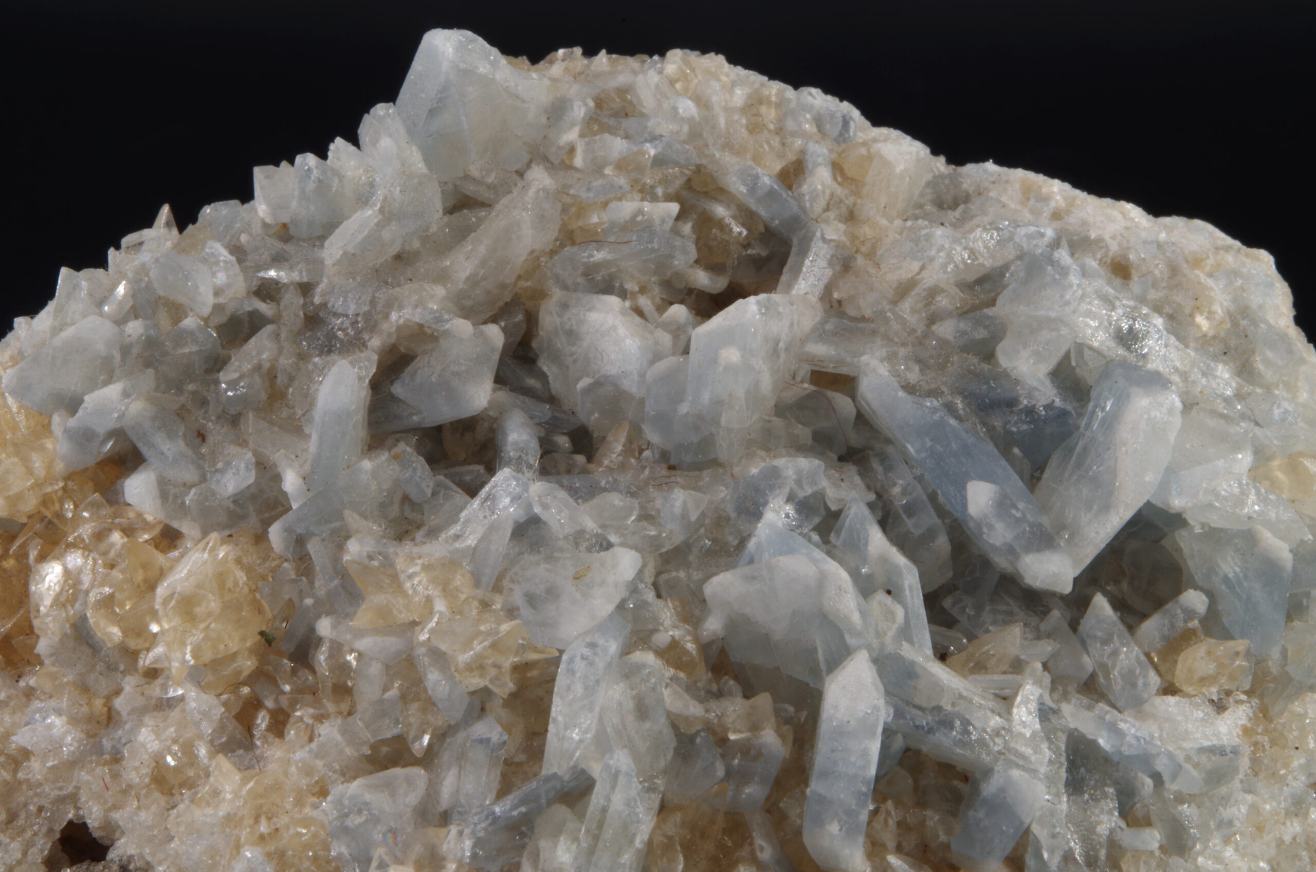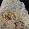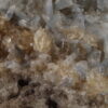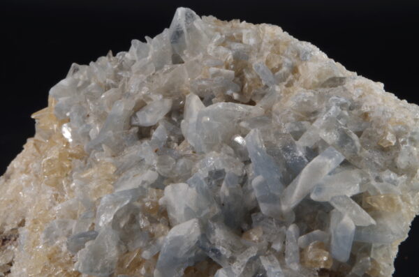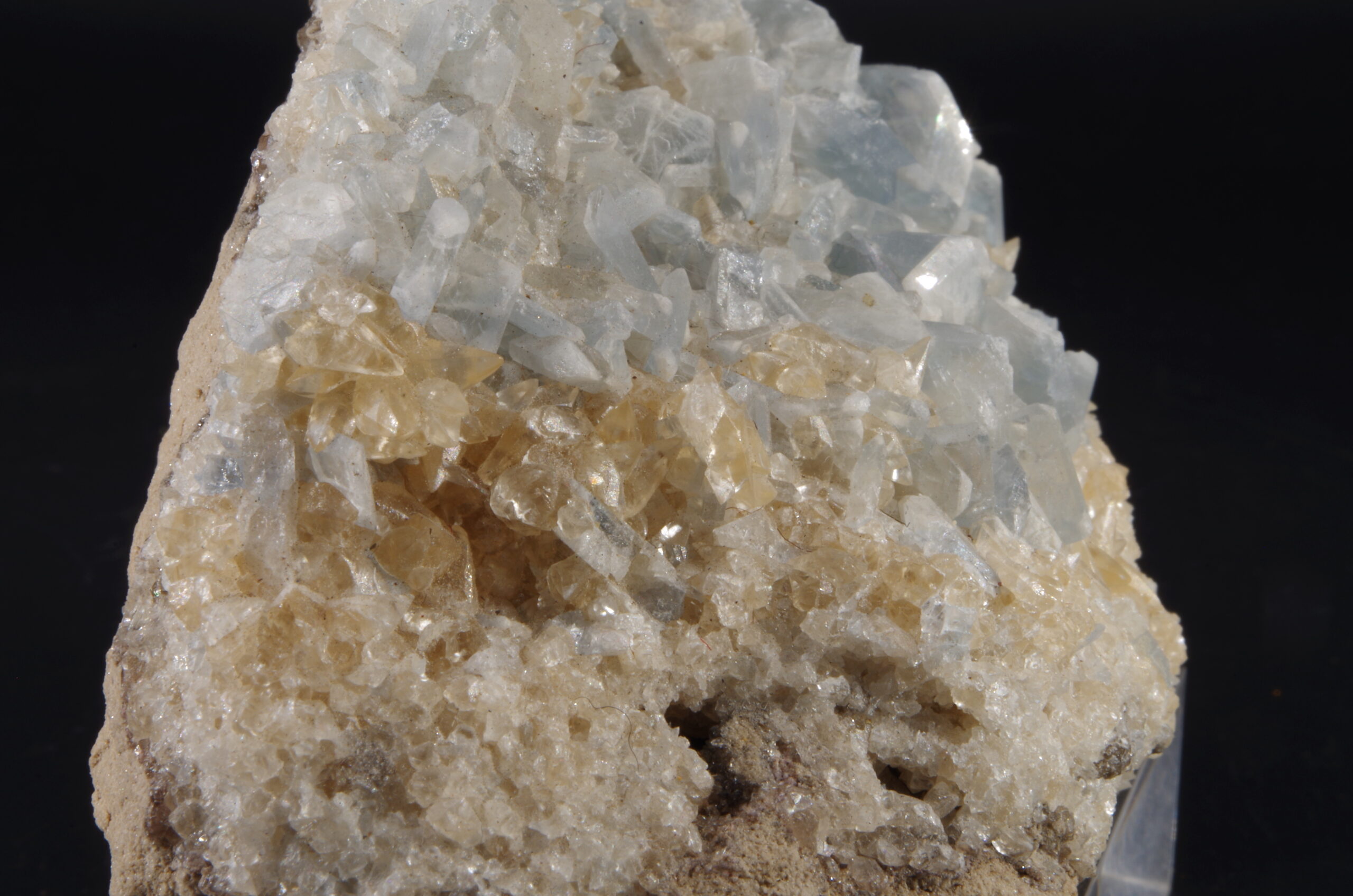 Joli groupe de cristaux de Célestine bleu-gris disposé sur une gangue couverte de petits cristaux de Calcite scalénoédriques dorés.