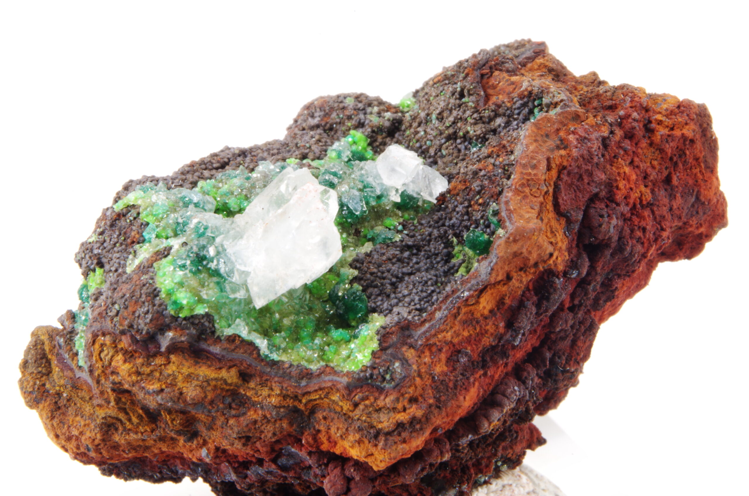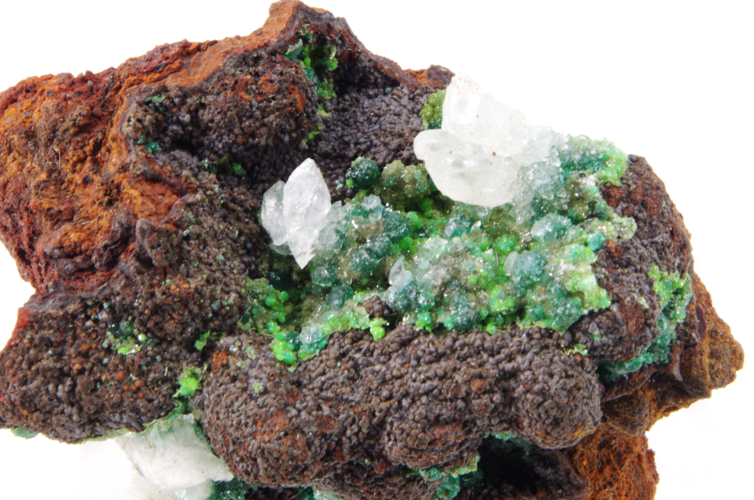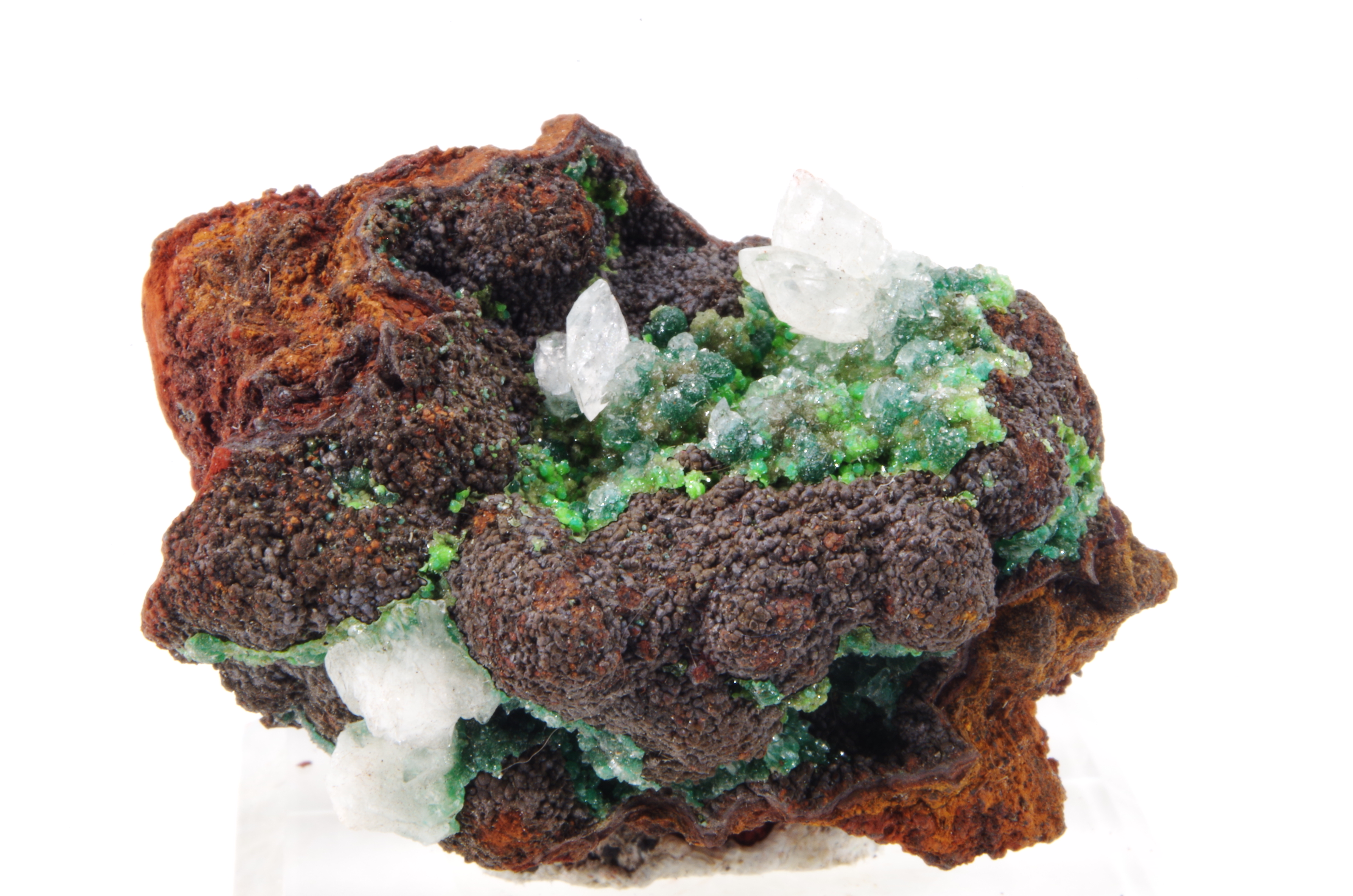 Superbe Conichalcite et Calcite translucide sur matrice en Limonite.