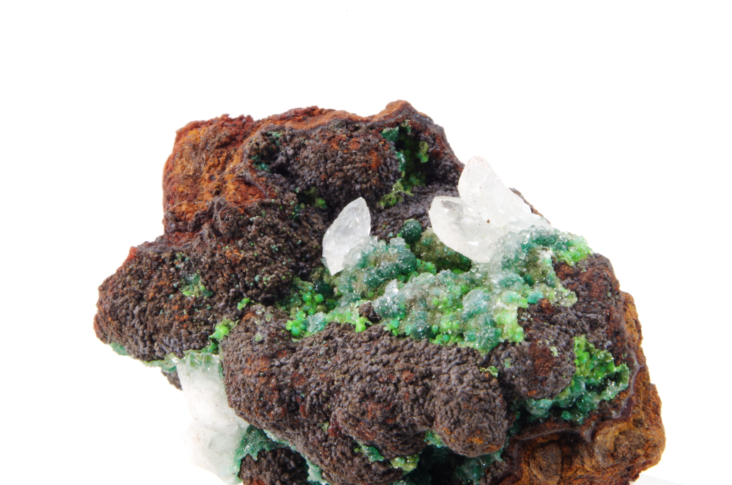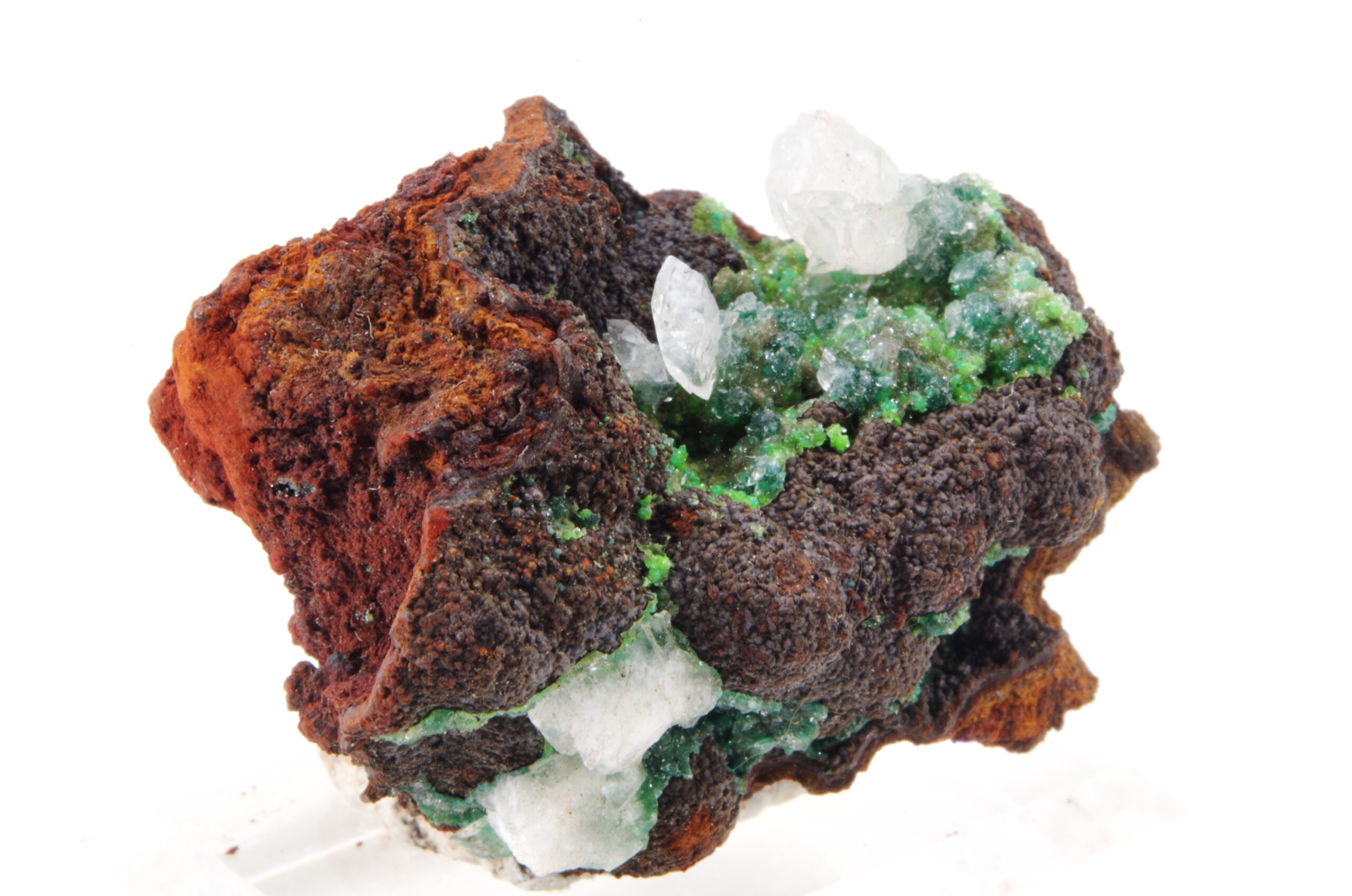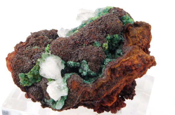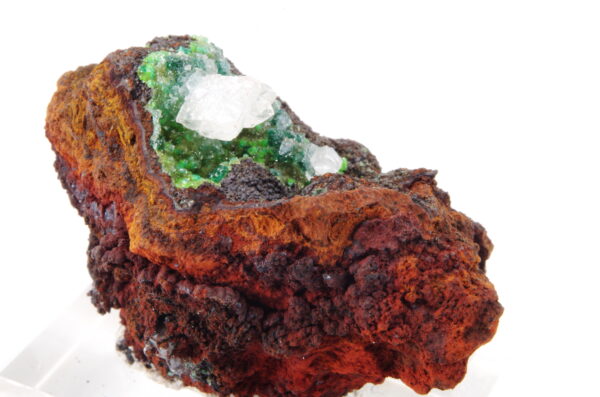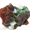 Pièce présentant une double teinte verte de Conichalcite recouverte d’un fine pellicule de Calcite qui apporte une magnifique brillance et les Cristaux de Calcite blancs bien exprimés sur ce spécimen très esthétique.