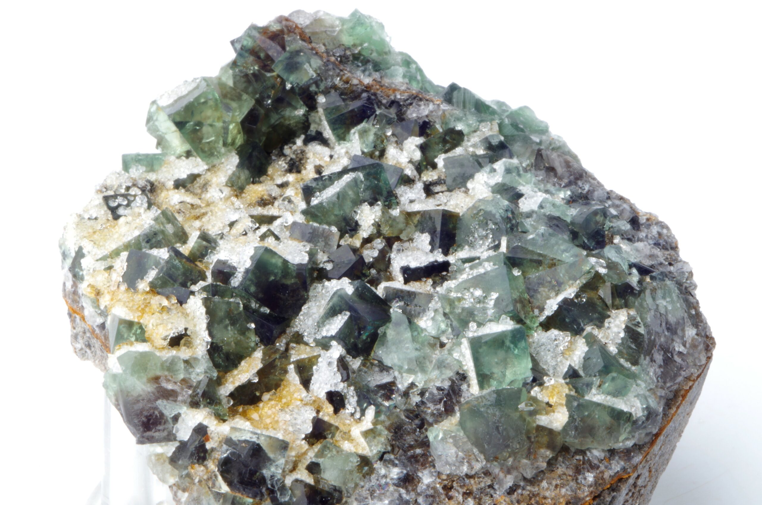 Cristaux cubiques vert émeraude brillants généralement transparents et gemmes encroutés de Quartz blanc laiteux scintillant avec quelques zones jaune/orangé dû à la présence de fer.