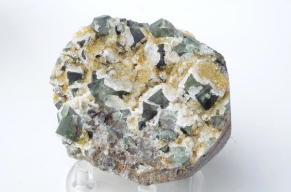 Cristaux cubiques vert émeraude brillants généralement transparents et gemmes encroutés de Quartz blanc laiteux scintillant avec quelques zones jaune/orangé dû à la présence de fer.