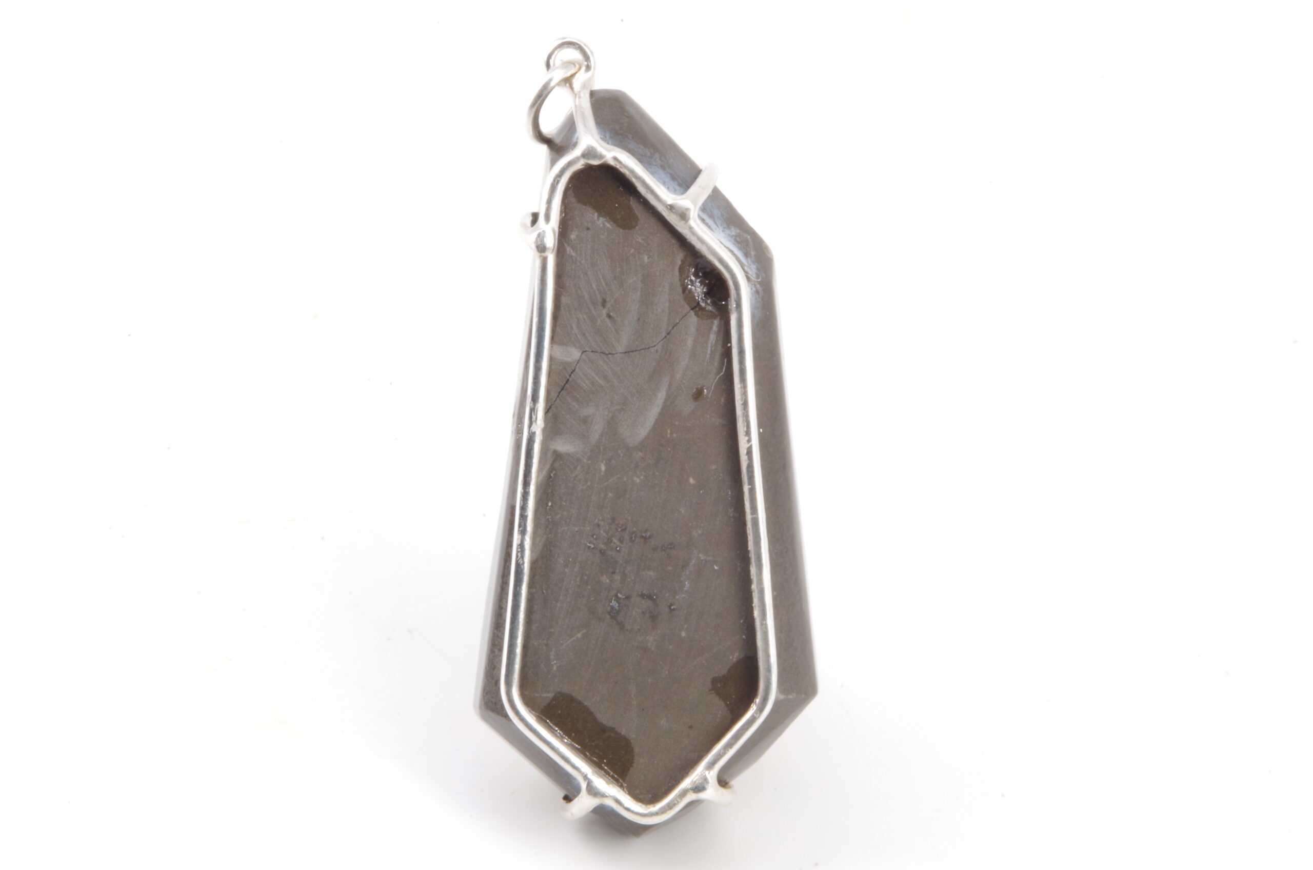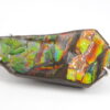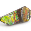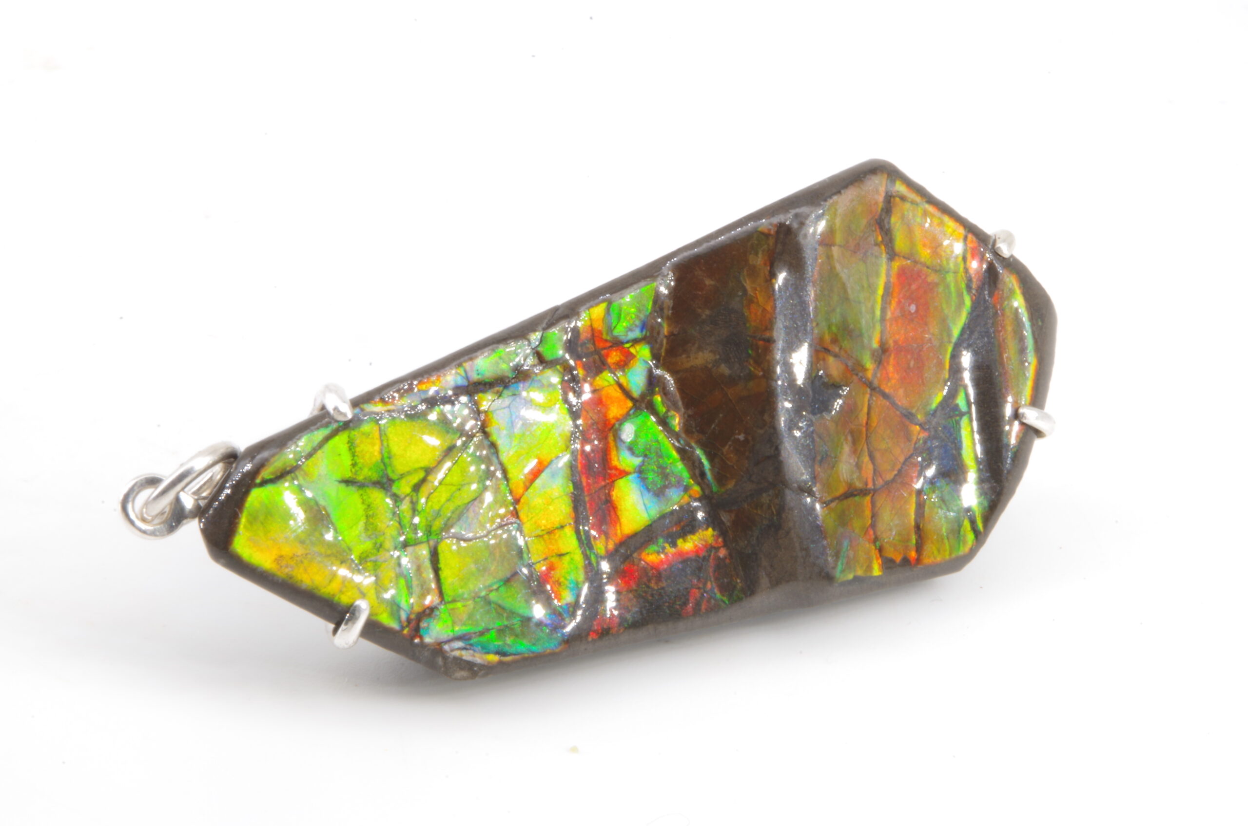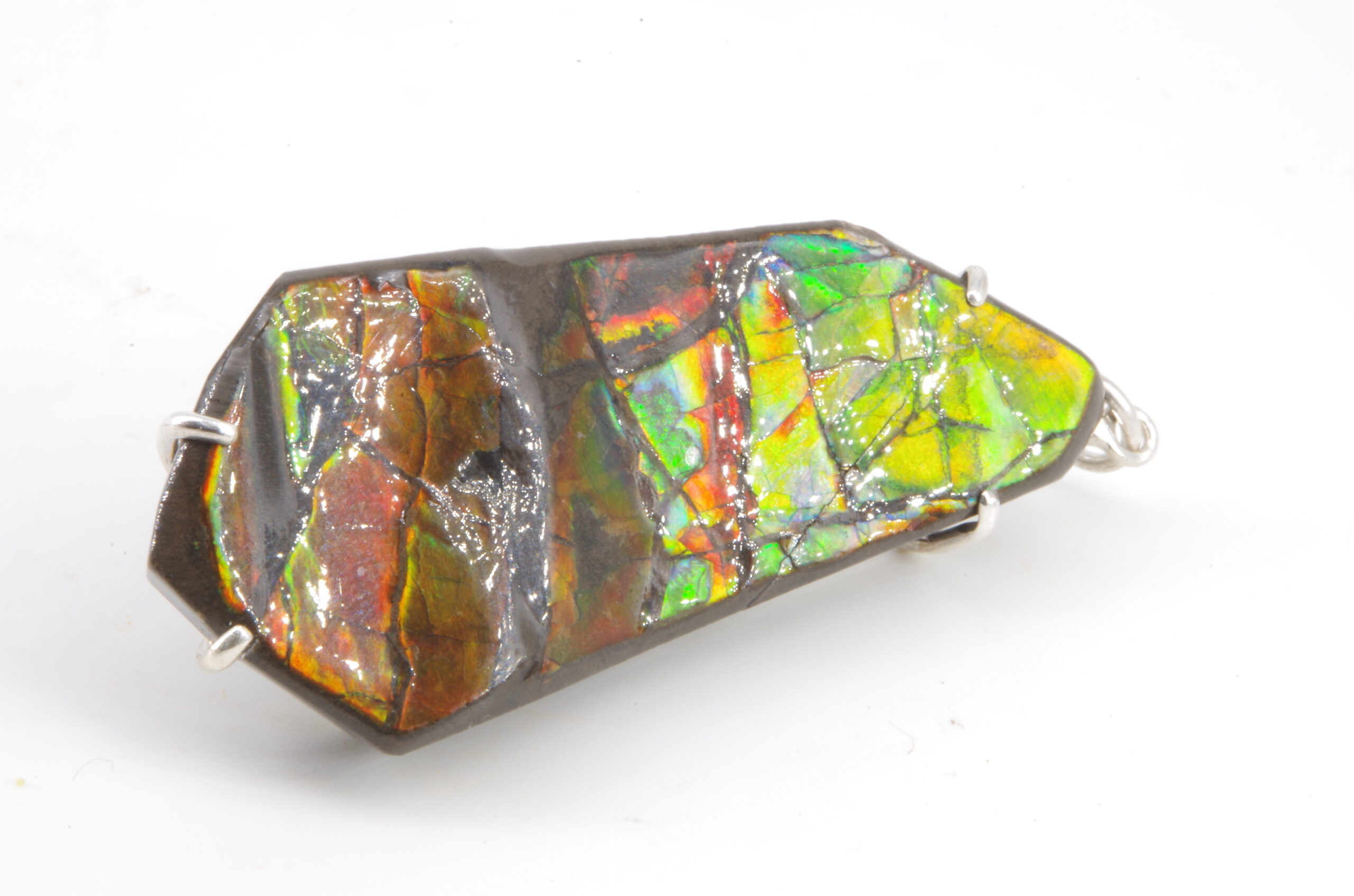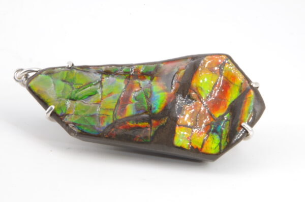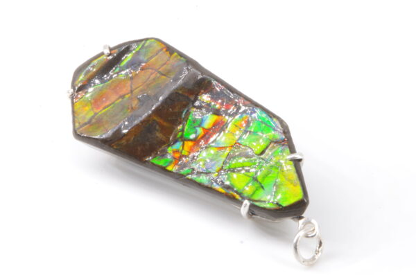 Jolie Ammolite authentique du Canada stabilisée avec une résine époxy serti avec de l’Argent. Réalisation sur mesure par un artisan bijoutier offrant une épouse parfaite de la pièce sans recours au perçage pour une durabilité sans faille et une parfaite préservation du spécimen.