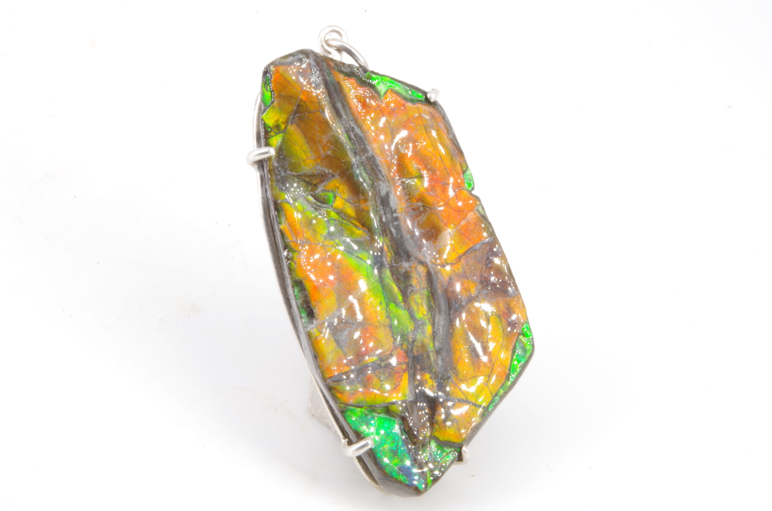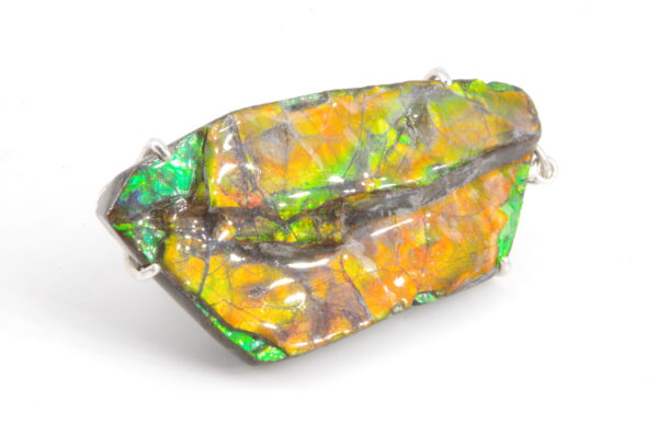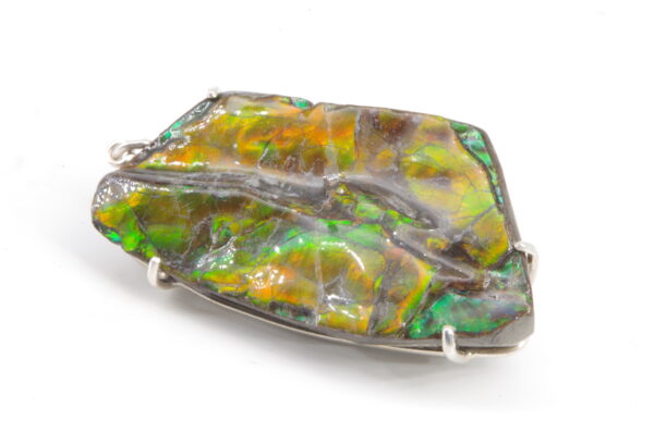 Jolie Ammolite authentique du Canada stabilisée avec une résine époxy serti avec de l’Argent. Réalisation sur mesure par un artisan bijoutier offrant une épouse parfaite de la pièce sans recours au perçage pour une durabilité sans faille et une parfaite préservation du spécimen.