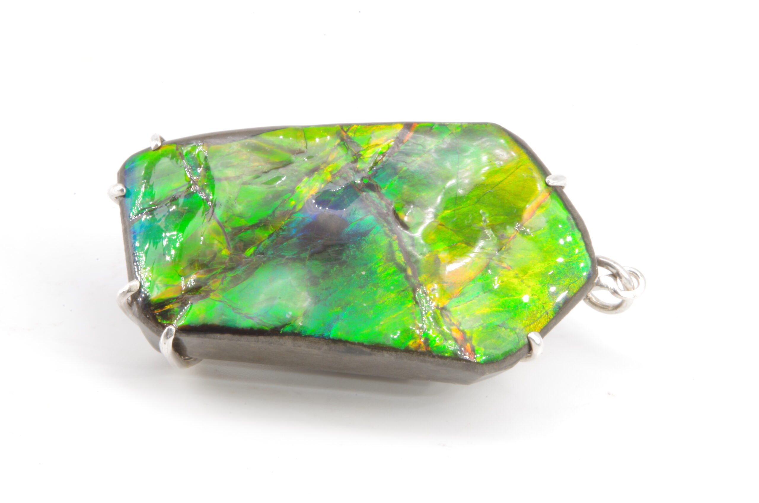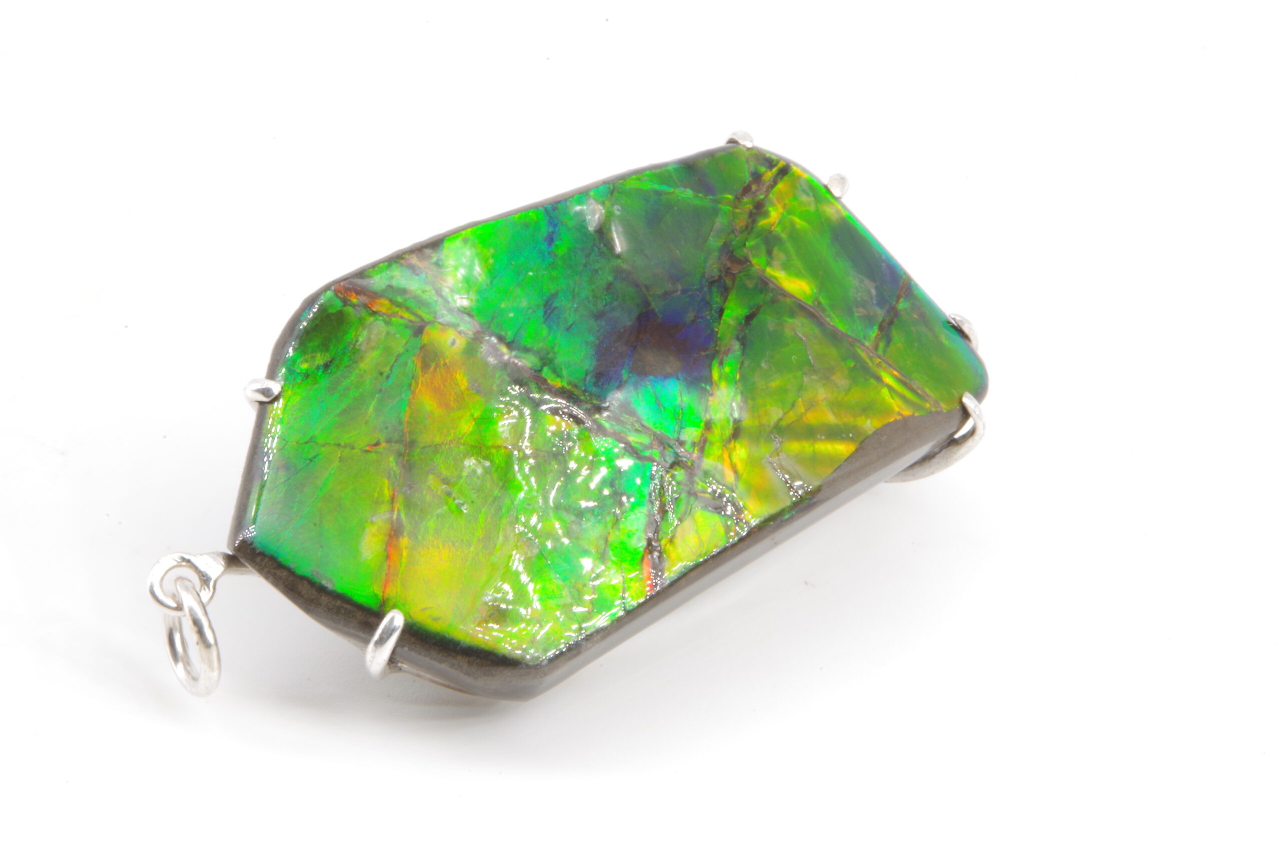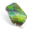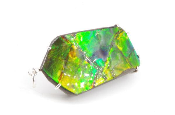 Jolie Ammolite authentique du Canada stabilisée avec une résine époxy serti avec de l’Argent. Réalisation sur mesure par un artisan bijoutier offrant une épouse parfaite de la pièce sans recours au perçage pour une durabilité sans faille et une parfaite préservation du spécimen.