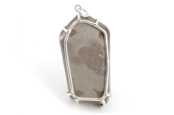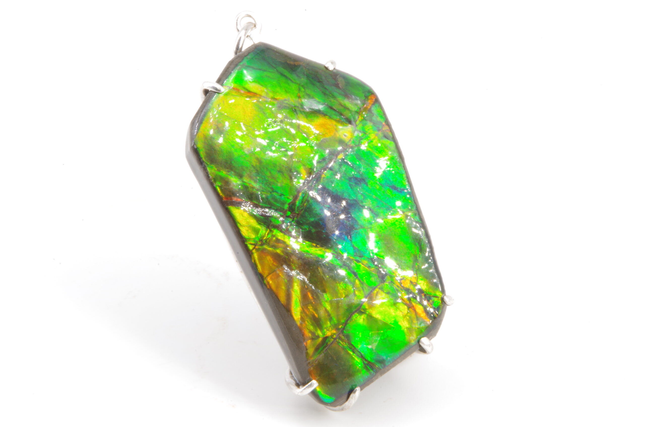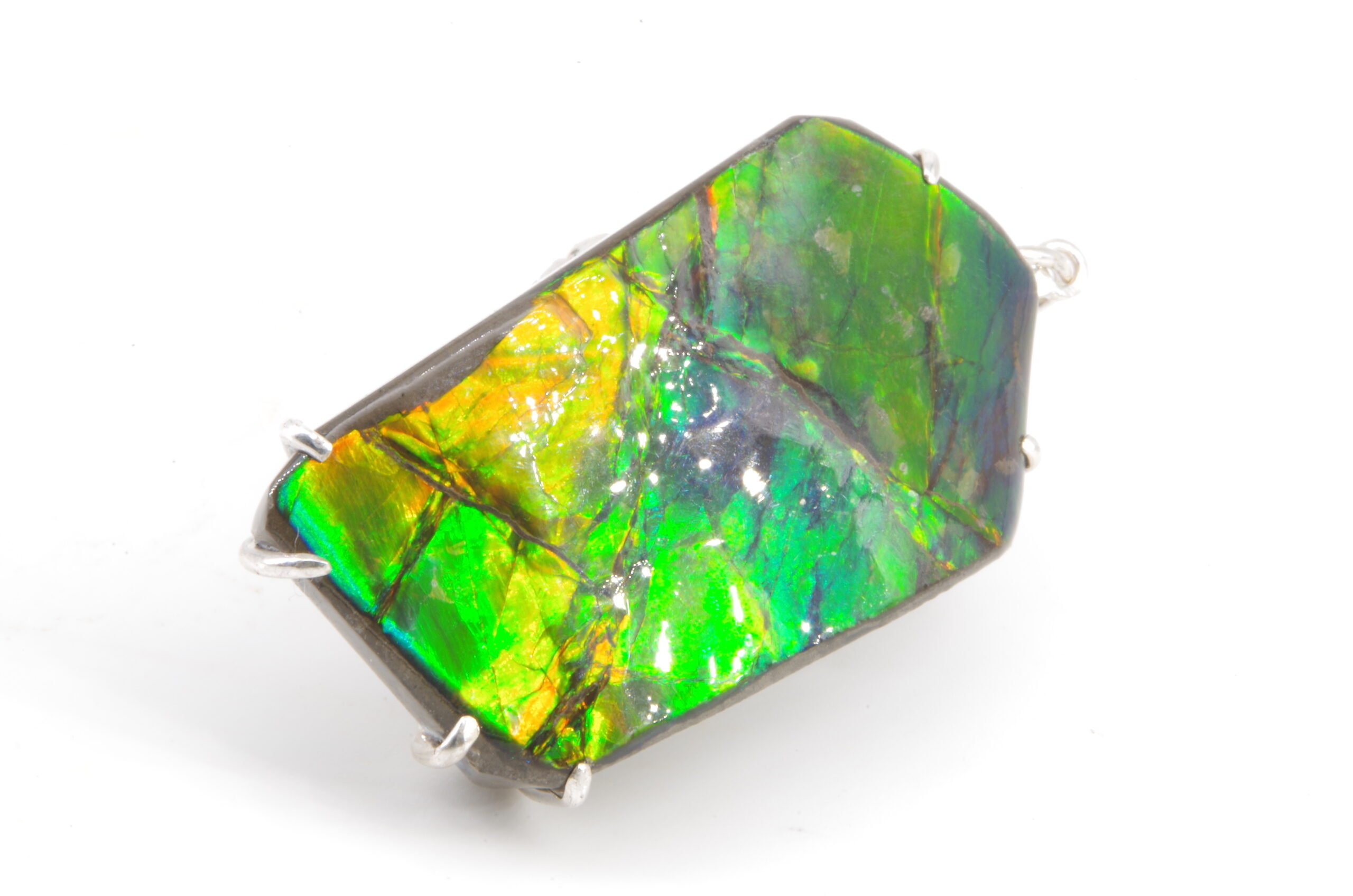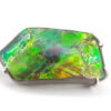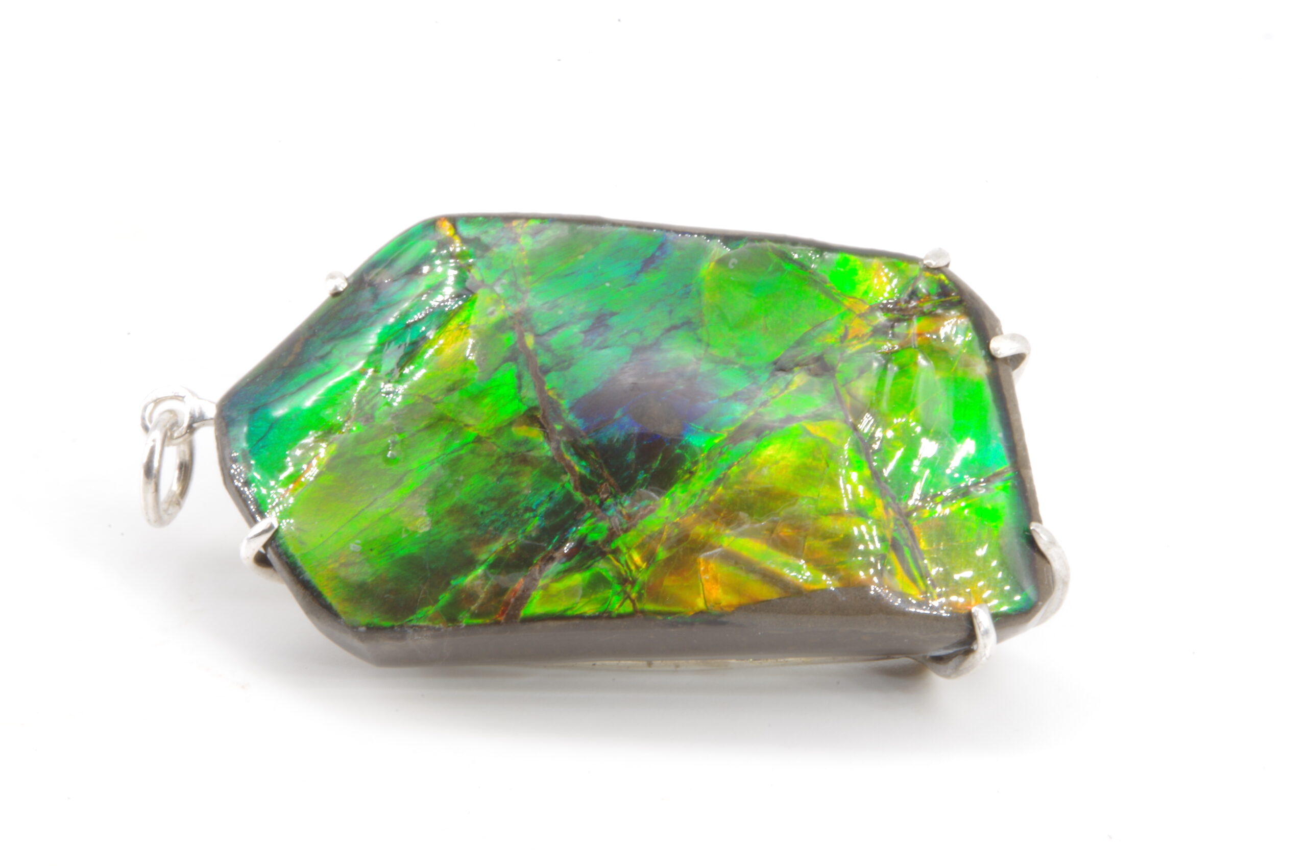 Jolie Ammolite authentique du Canada stabilisée avec une résine époxy serti avec de l’Argent. Réalisation sur mesure par un artisan bijoutier offrant une épouse parfaite de la pièce sans recours au perçage pour une durabilité sans faille et une parfaite préservation du spécimen.