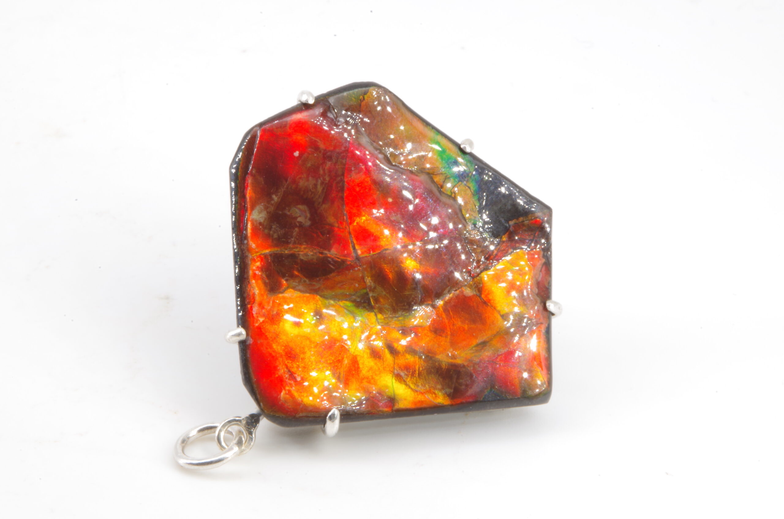 Jolie Ammolite authentique du Canada stabilisée avec une résine époxy serti avec de l’Argent. Réalisation sur mesure par un artisan bijoutier offrant une épouse parfaite de la pièce sans recours au perçage pour une durabilité sans faille et une parfaite préservation du spécimen.