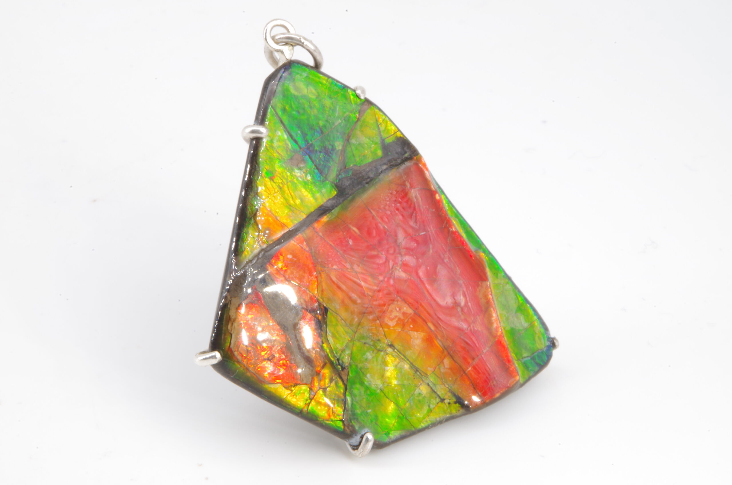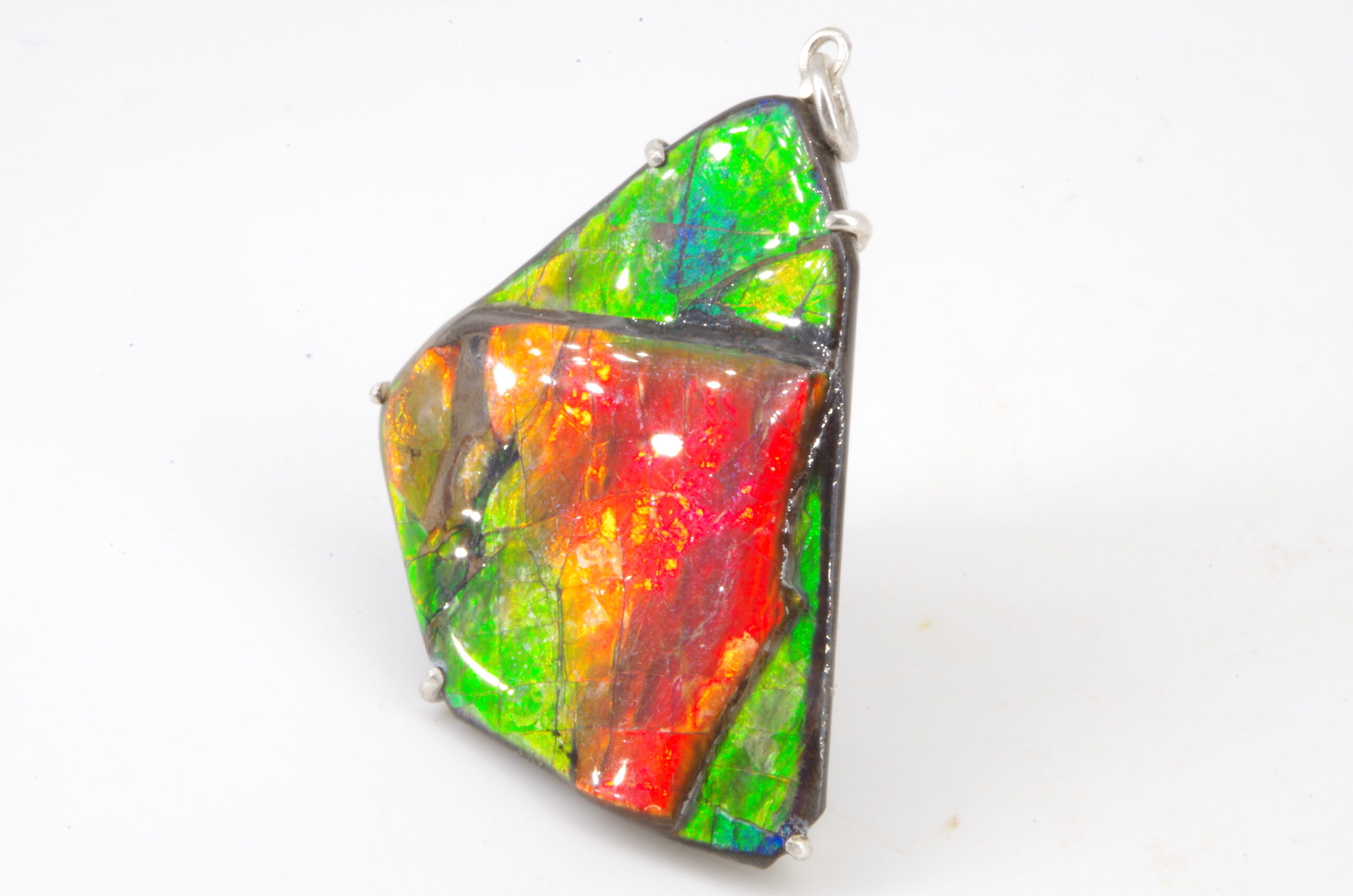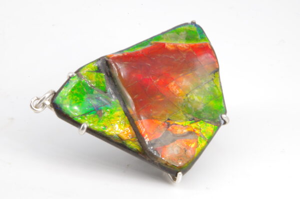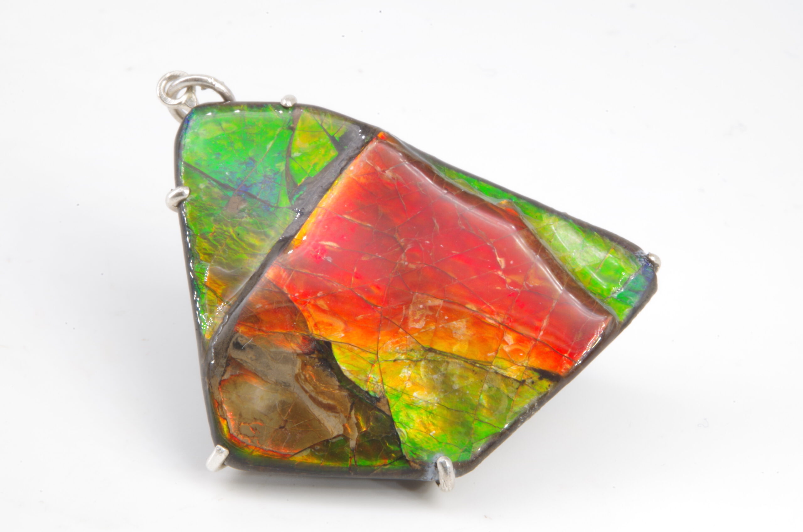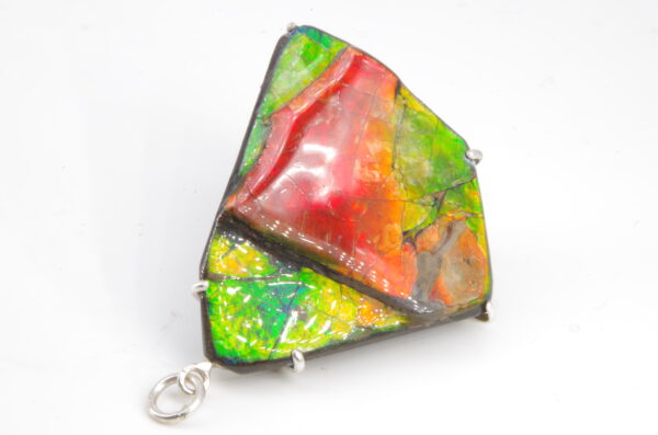 Jolie Ammolite authentique du Canada stabilisée avec une résine époxy serti avec de l’Argent. Réalisation sur mesure par un artisan bijoutier offrant une épouse parfaite de la pièce sans recours au perçage pour une durabilité sans faille et une parfaite préservation du spécimen.