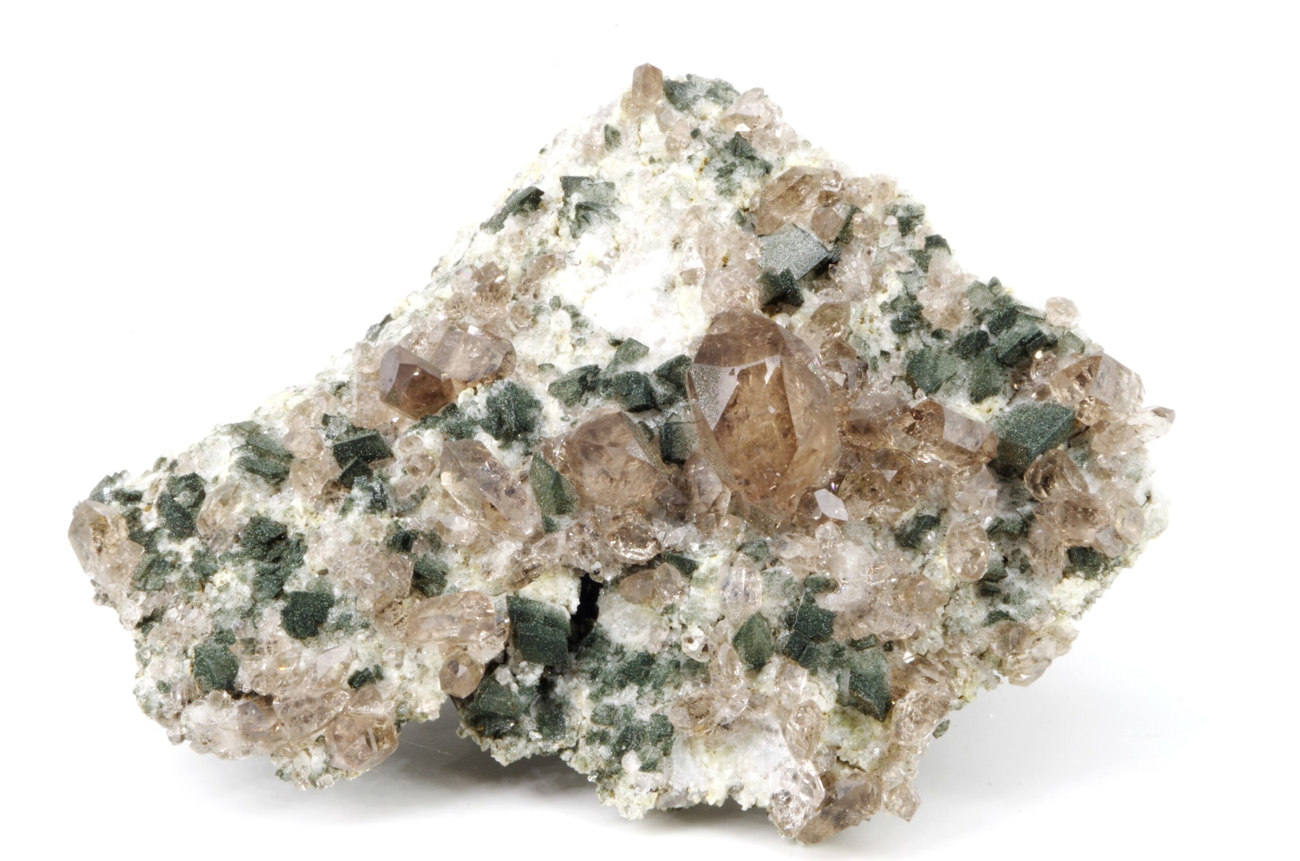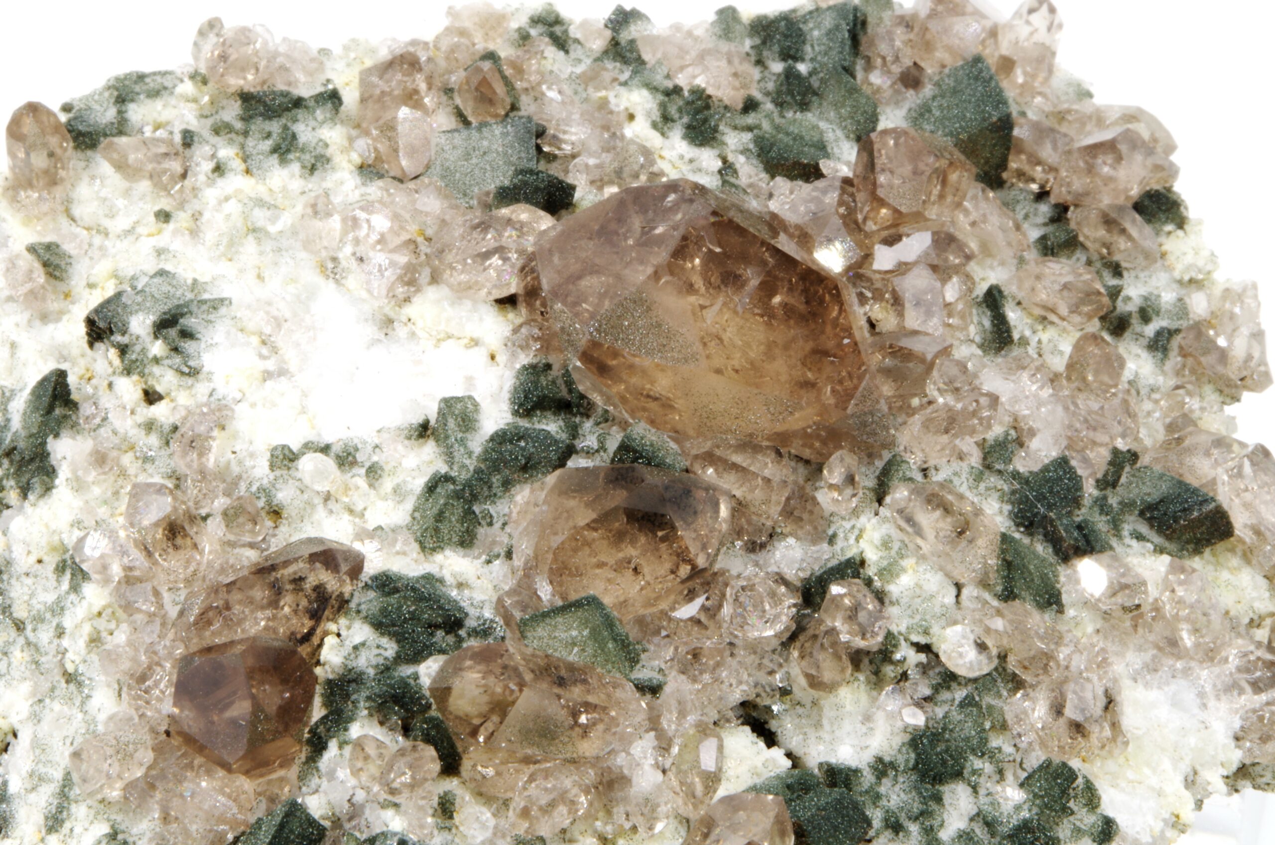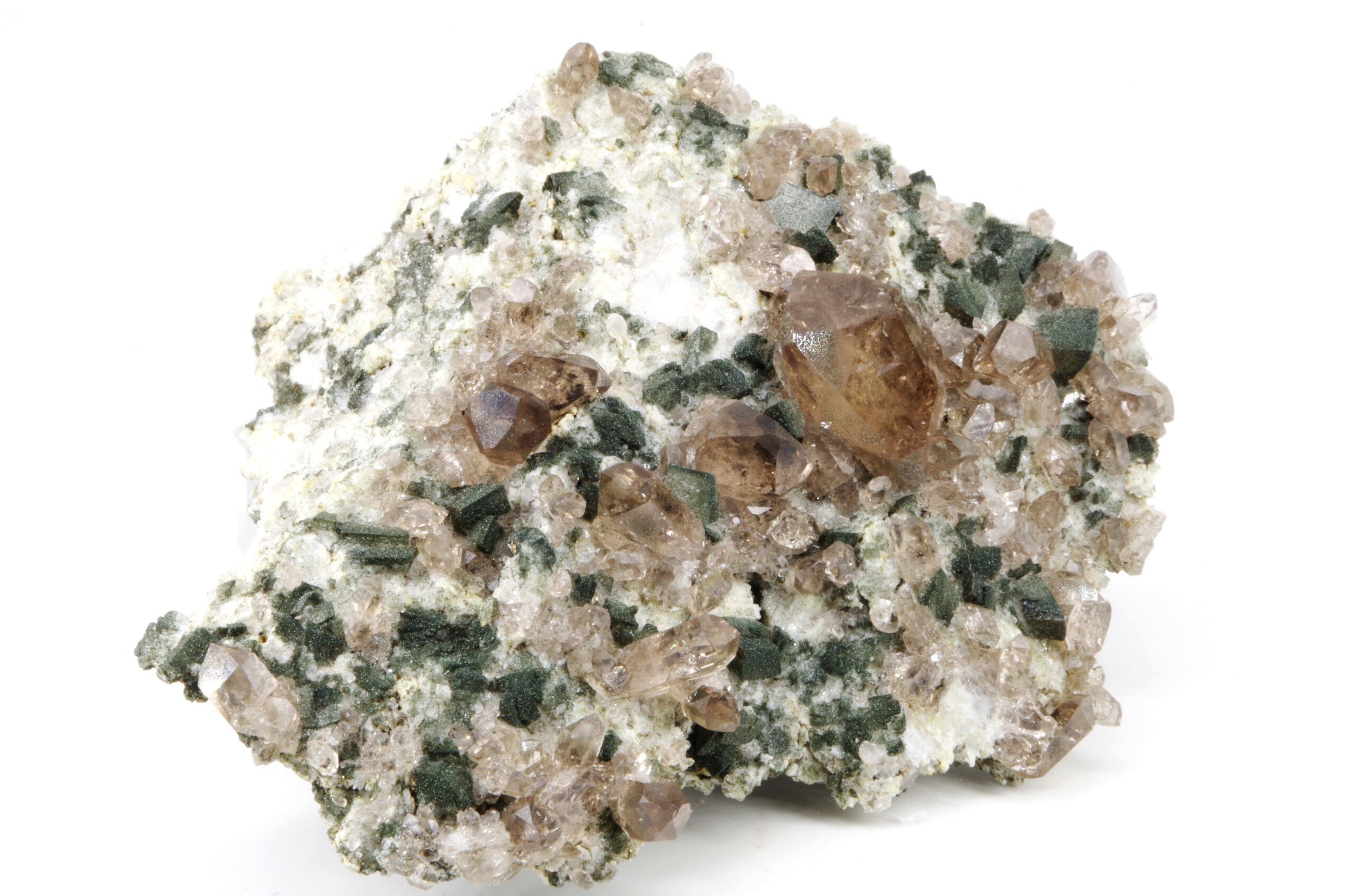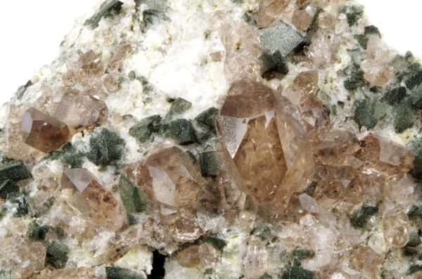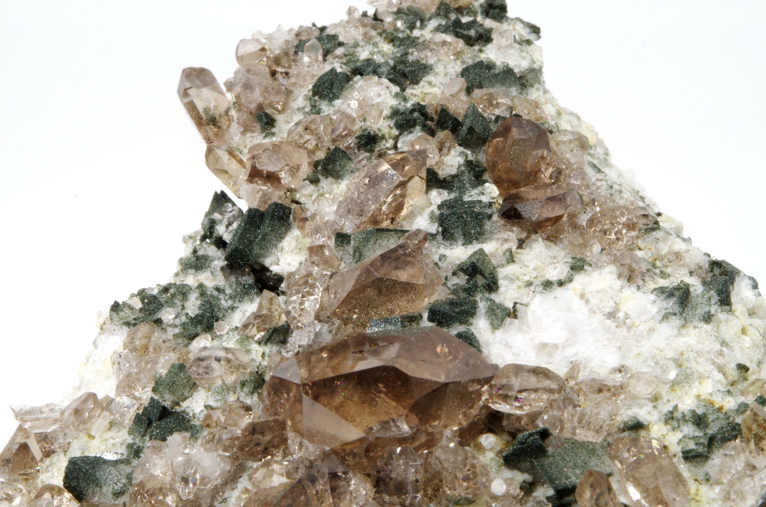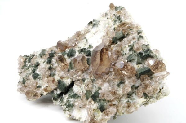 Magnifique combinaison de Quartz fumés translucides complété par des cristaux vert d’Adulaires recouverts de Chlorite.