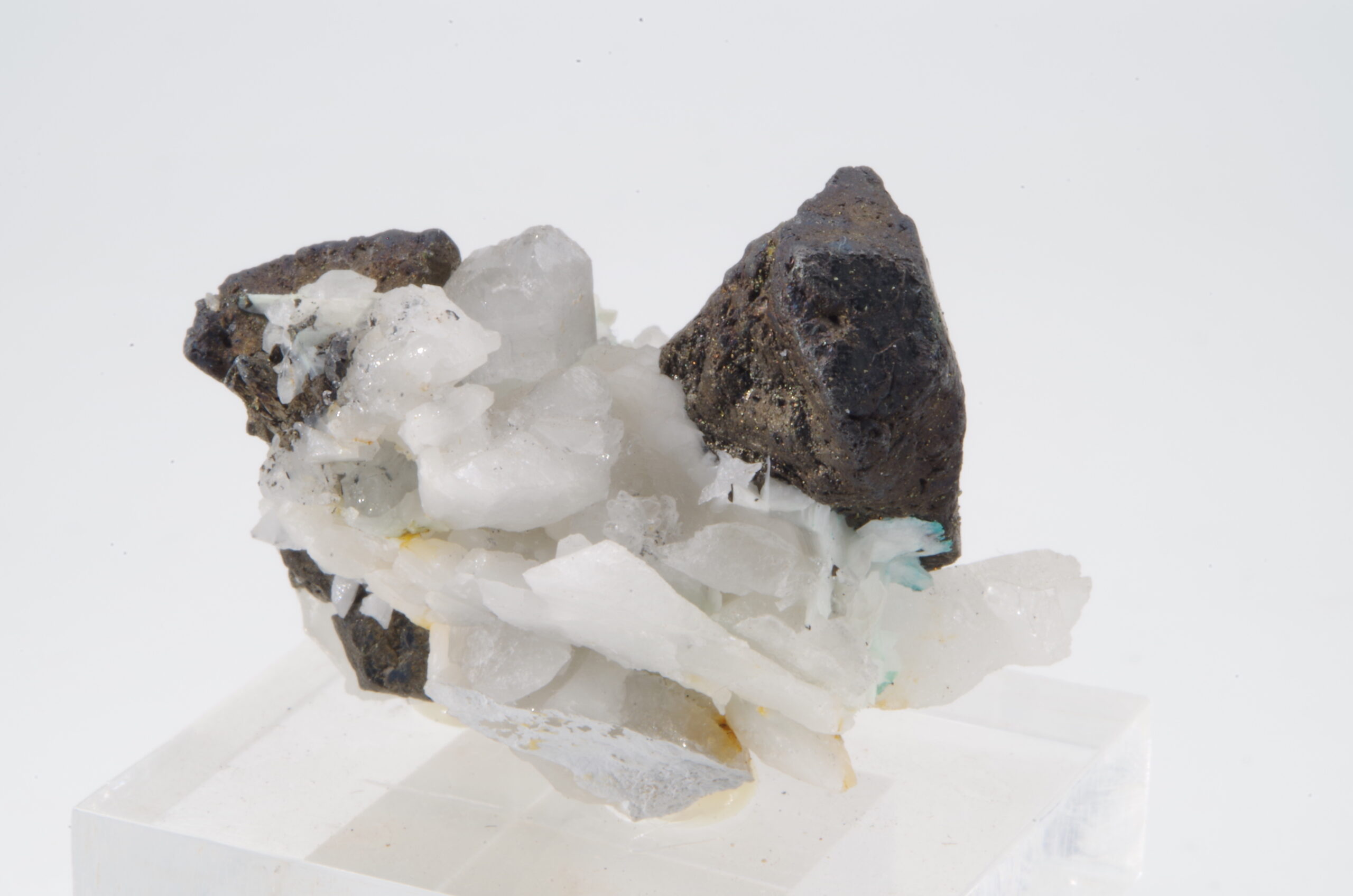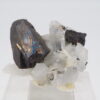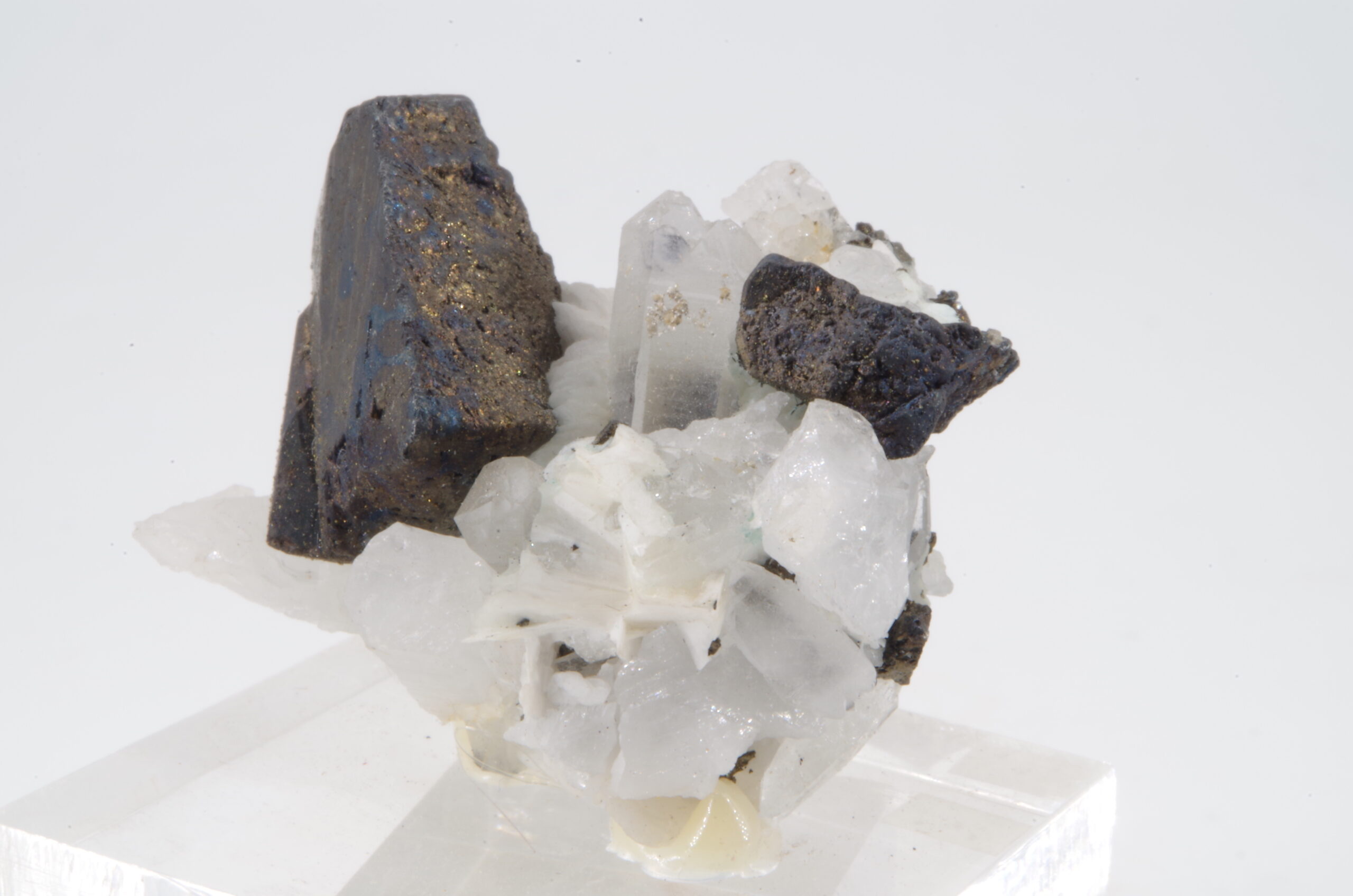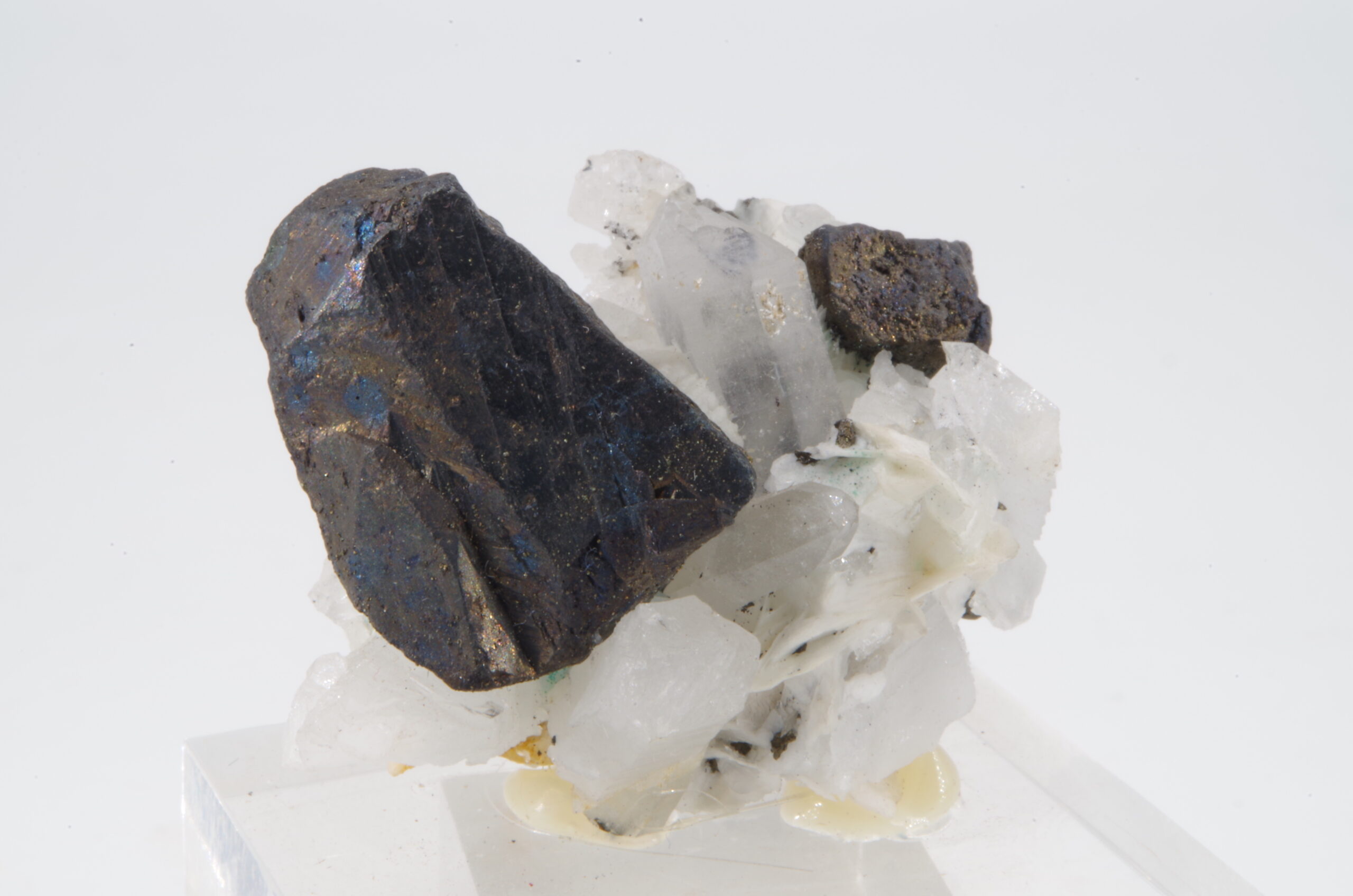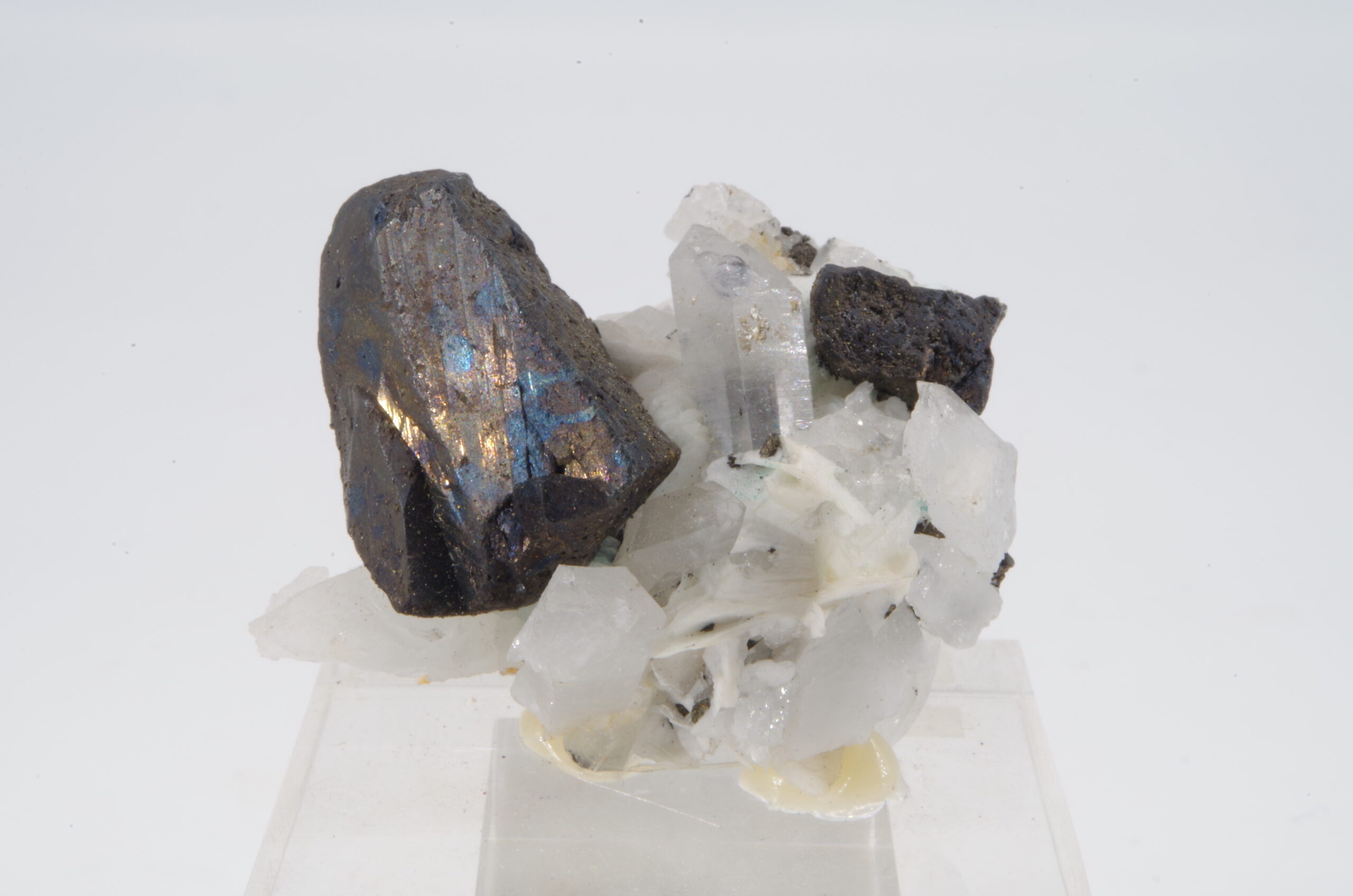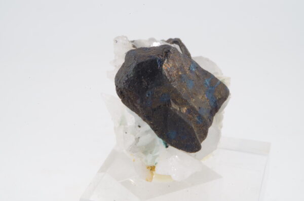 Arsénopyrite aux reflets dorés et bleus présenté sur un amalgame Quartz