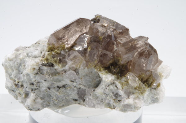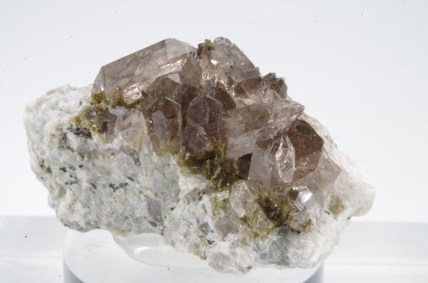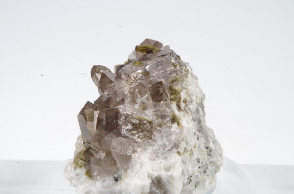 Cristaux de quartz fumés enchevêtrés sur matrice recouverte de quartz blanc parsemée d’Epidote avec quelques inclusions dans les quartz.