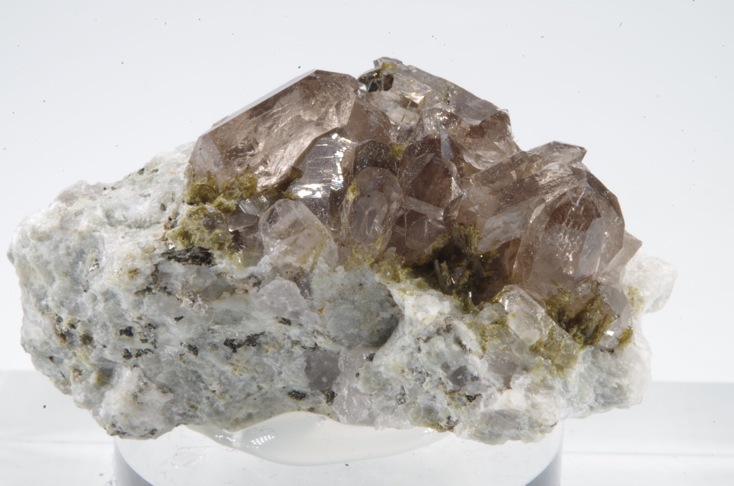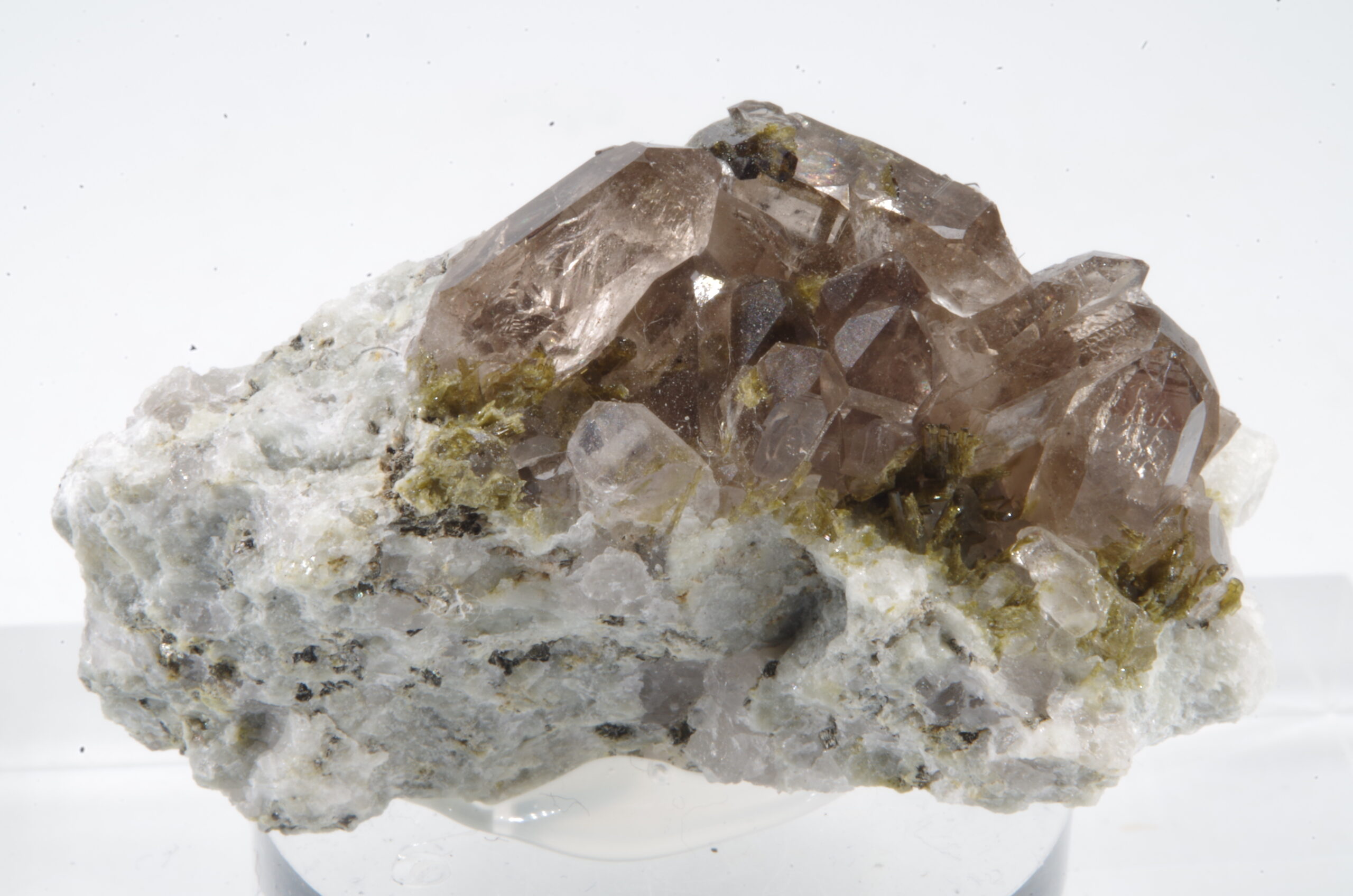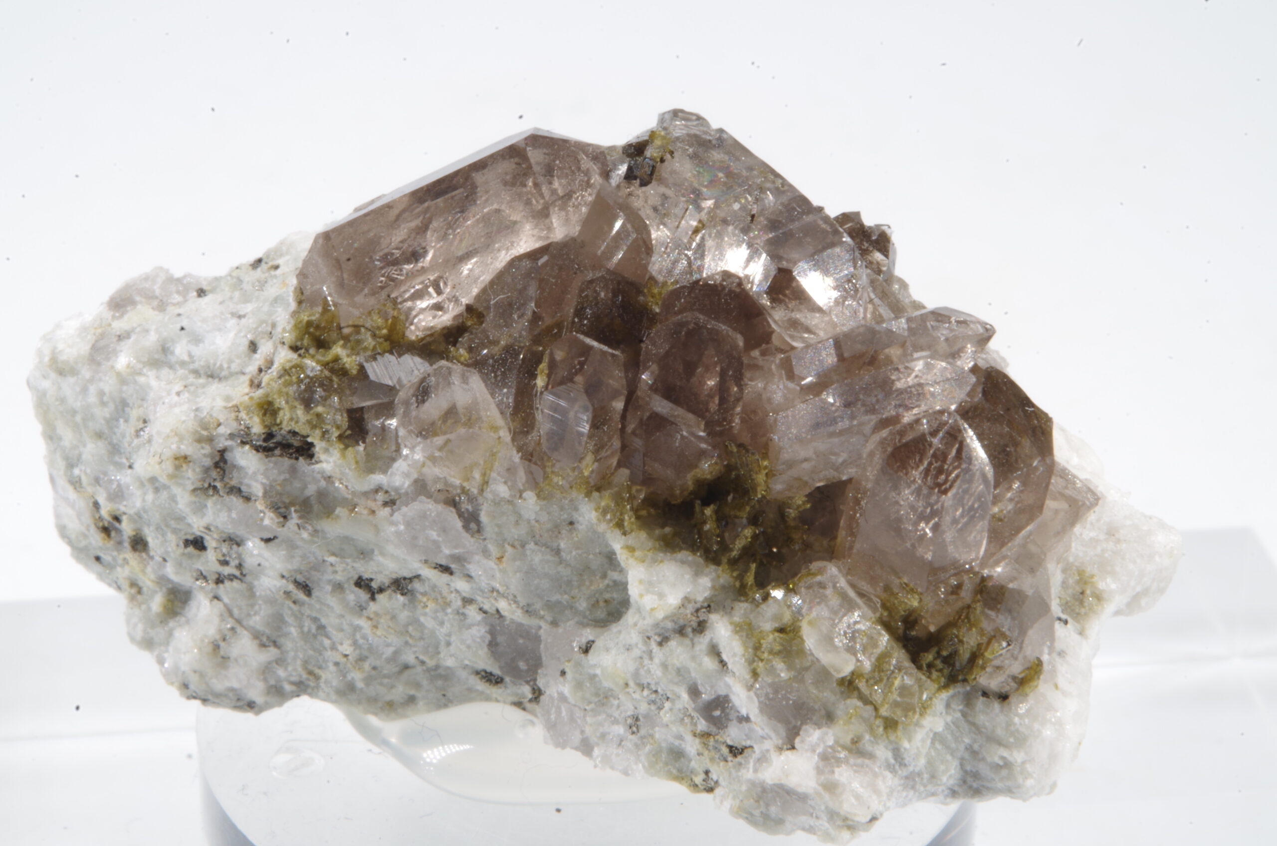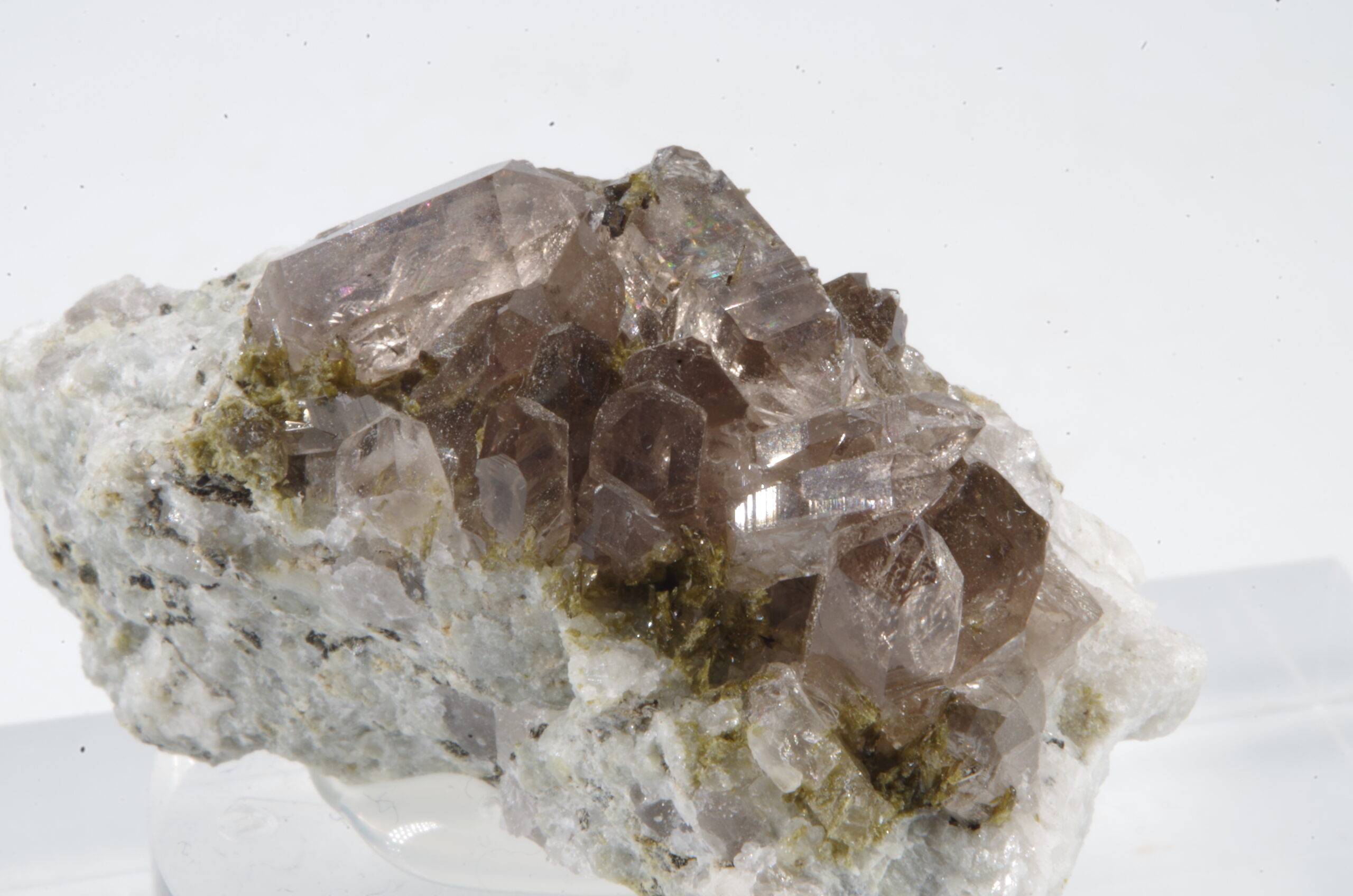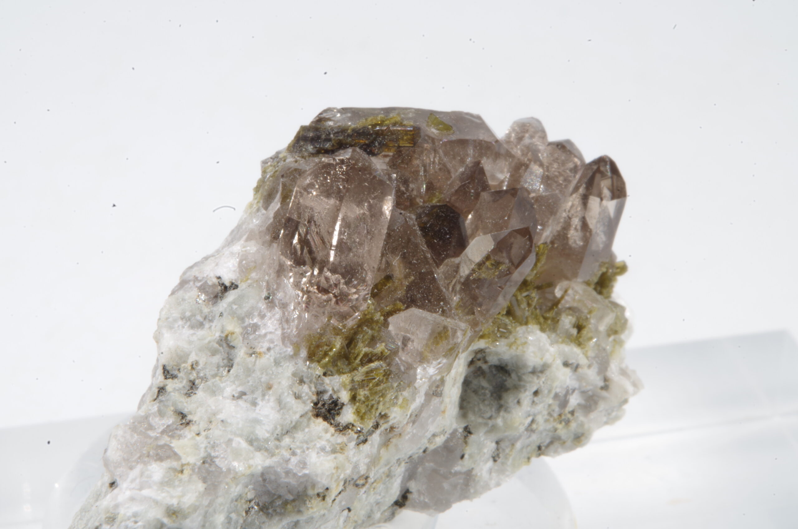 Cristaux de quartz fumés enchevêtrés sur matrice recouverte de quartz blanc parsemée d’Epidote avec quelques inclusions dans les quartz.
