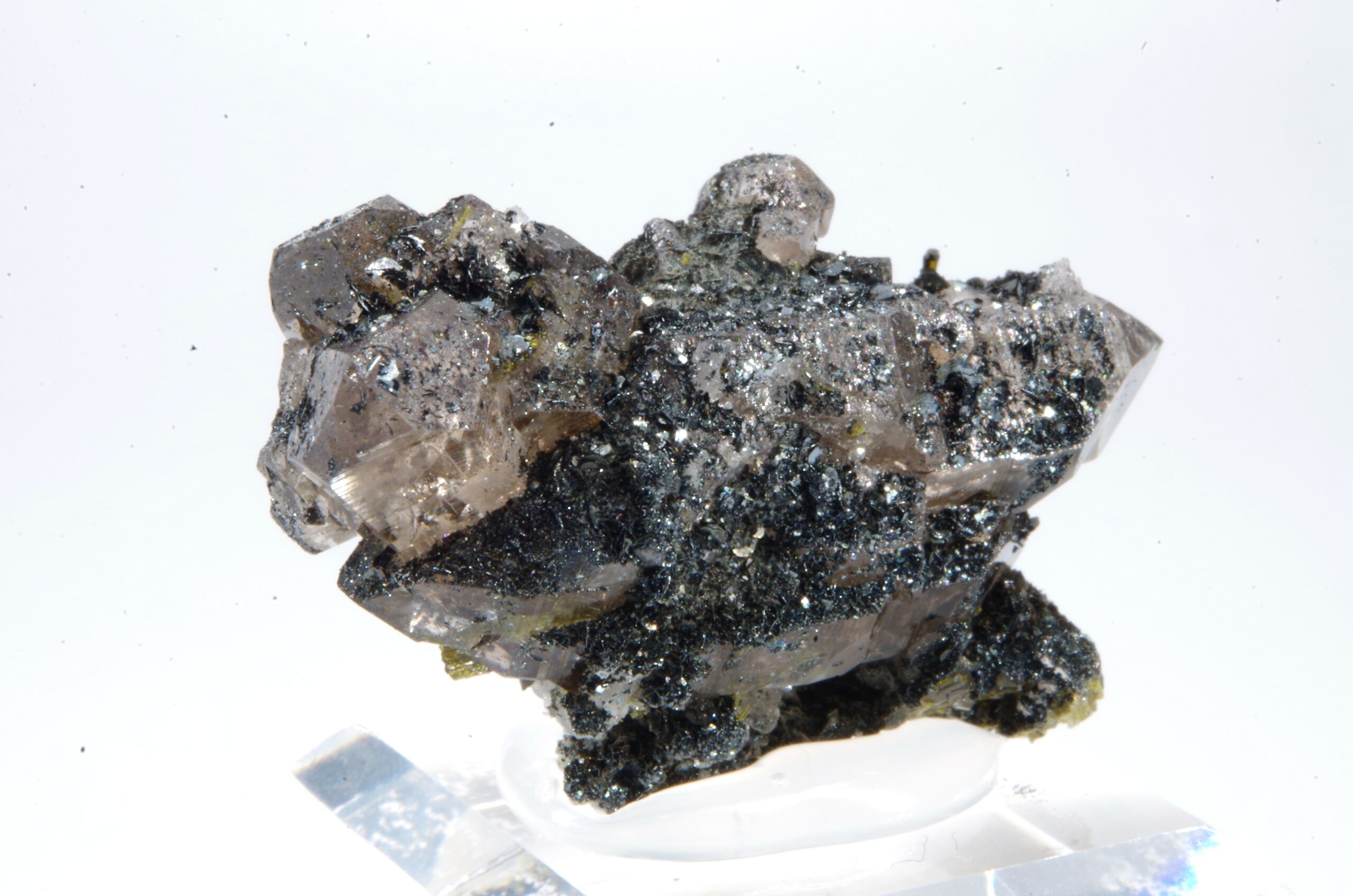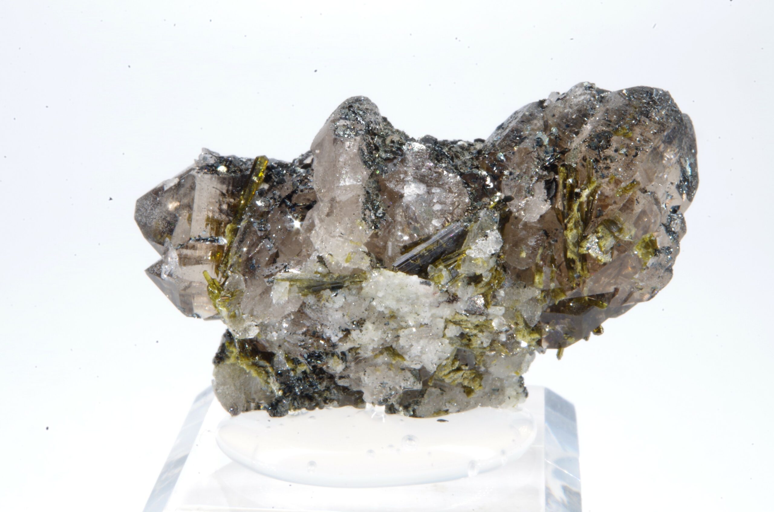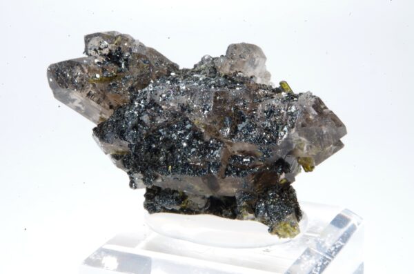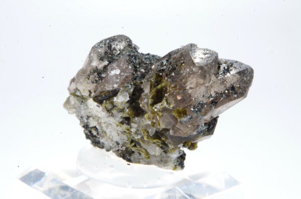 Joli ensemble de Quartz fumé superposés recouvert d’hématite et complété par quelques fin cristaux d’épidote.