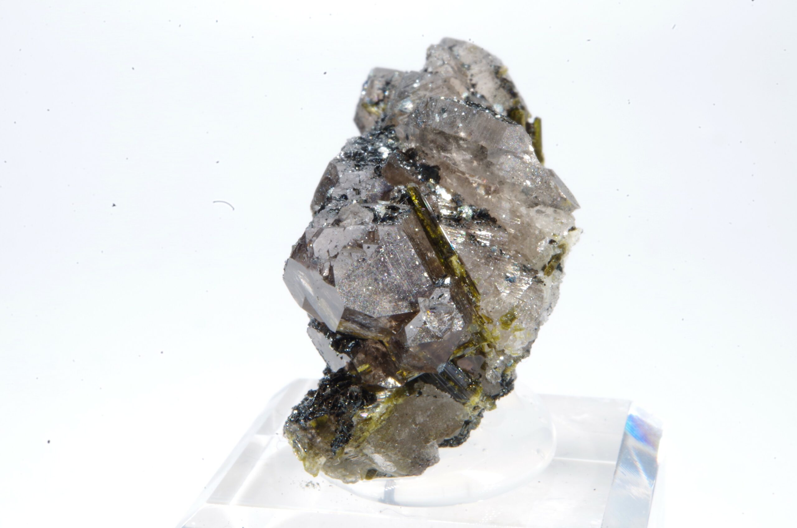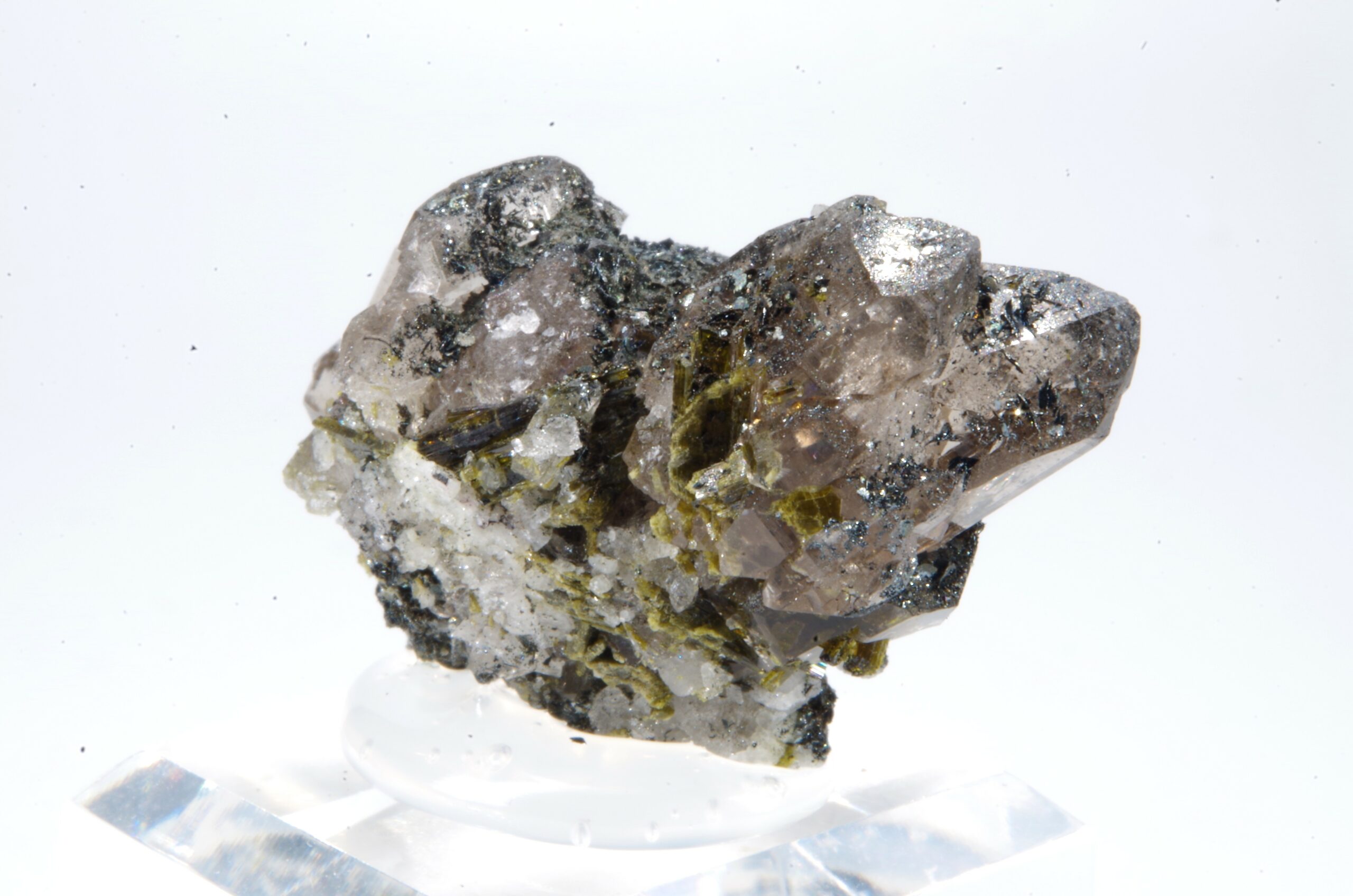 Joli ensemble de Quartz fumé superposés recouvert d’hématite et complété par quelques fin cristaux d’épidote.