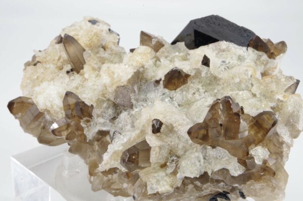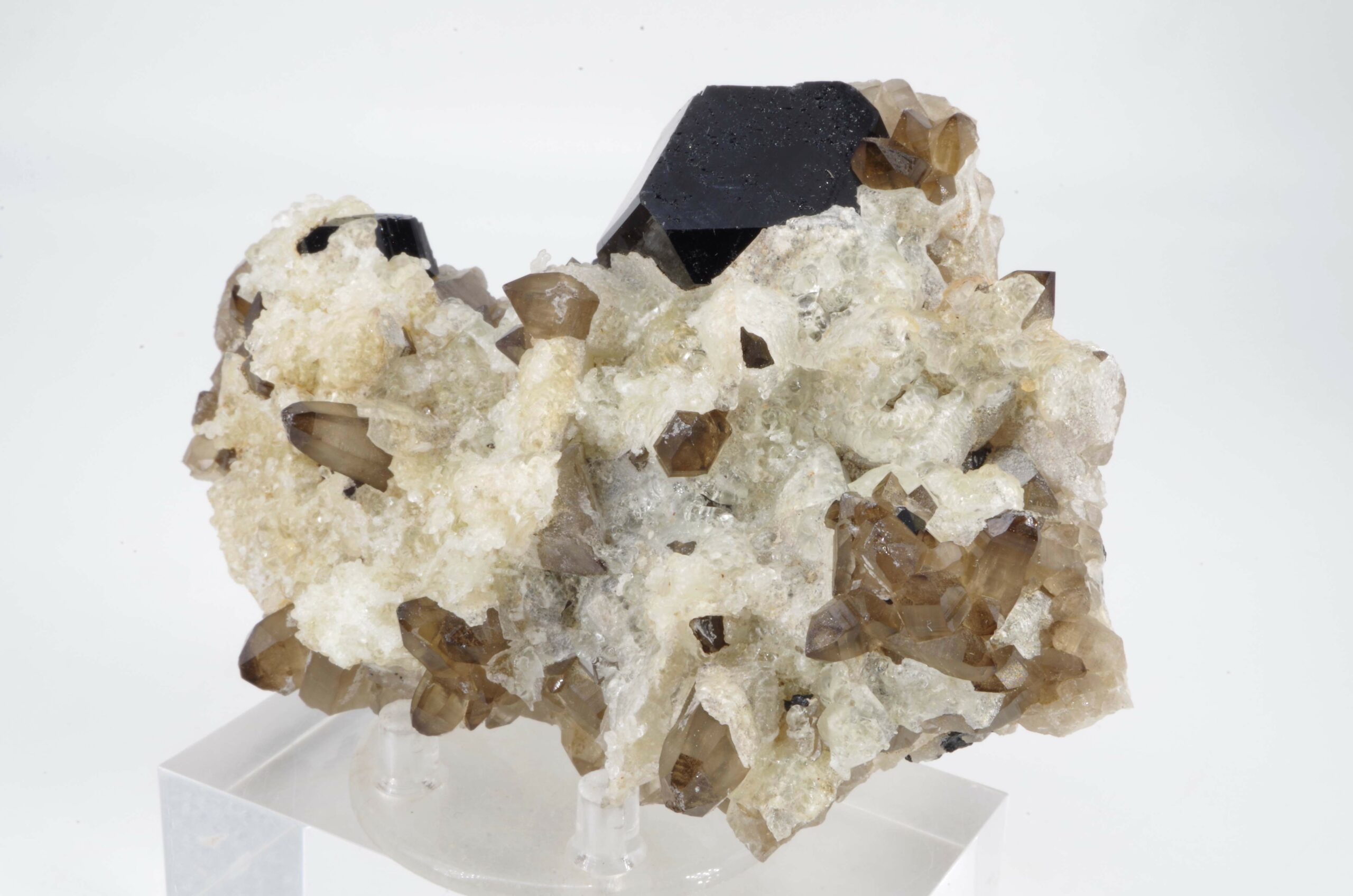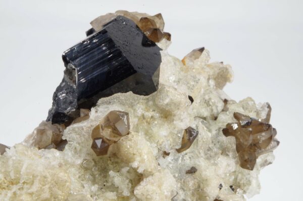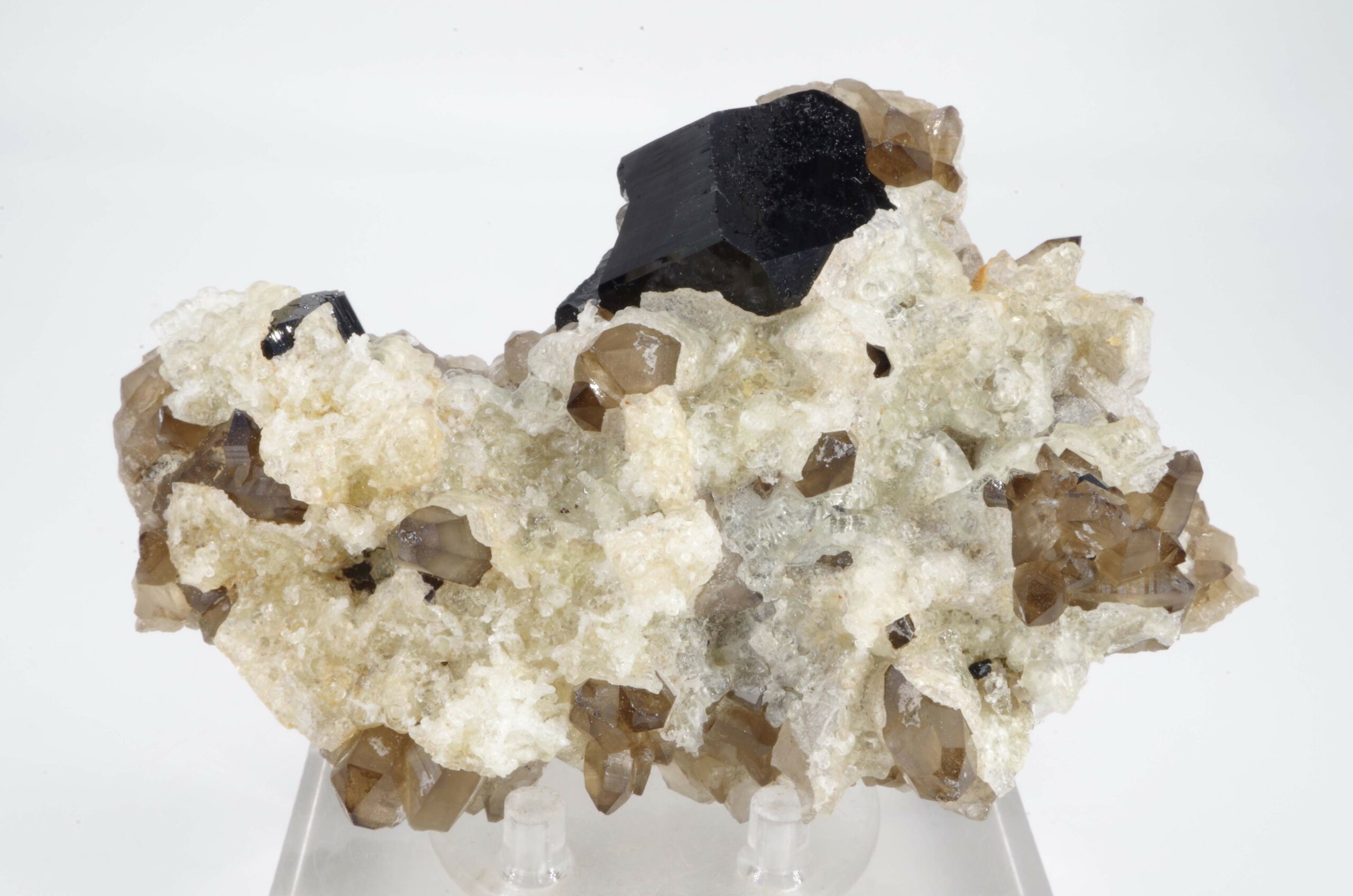 Magnifique ensemble de fines pointes de Quartz légèrement fumés encroutés par de l’Opale hyalite et surmonté par une large cristallisation de Tourmaline noire variété Schorl.