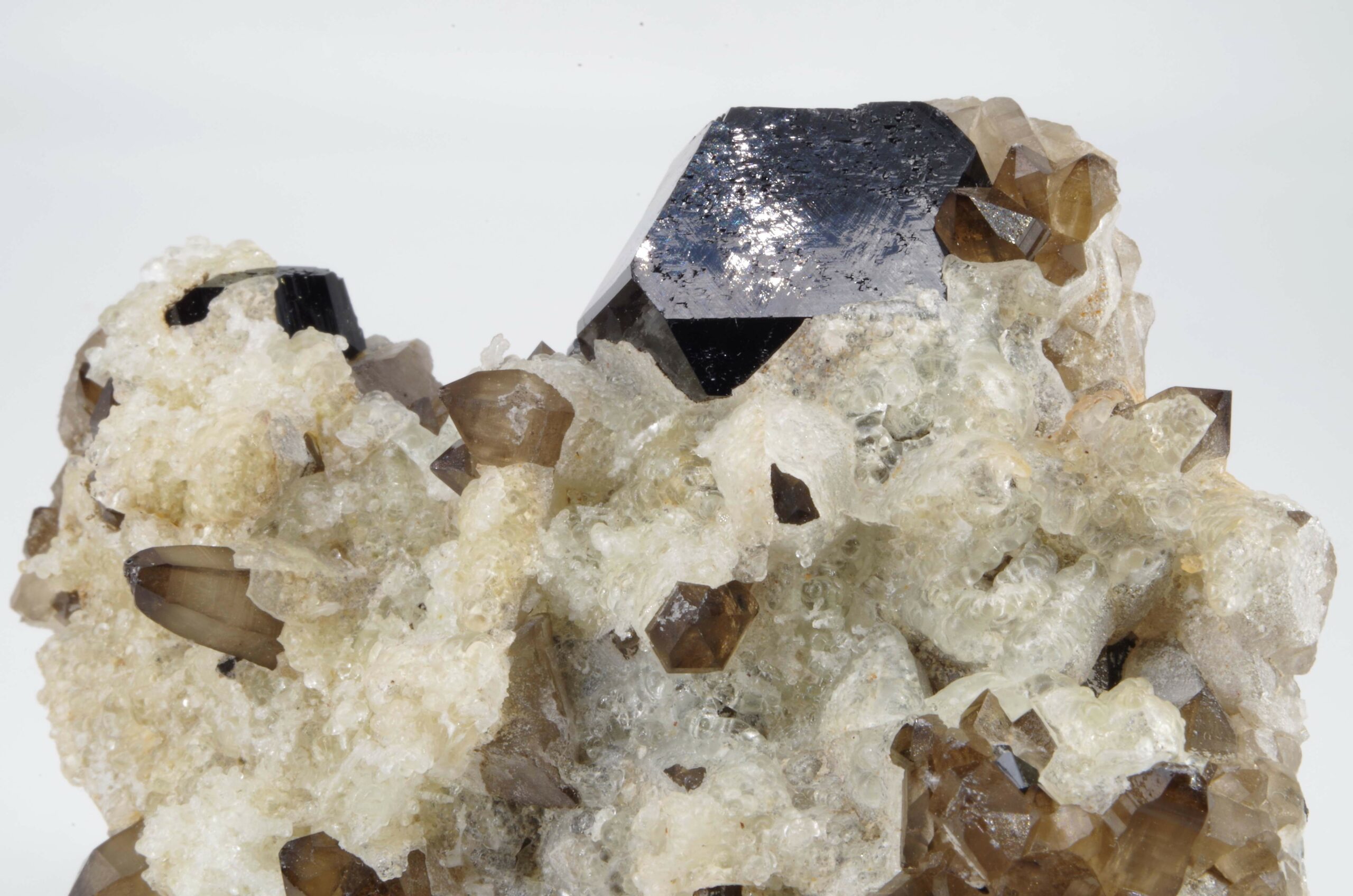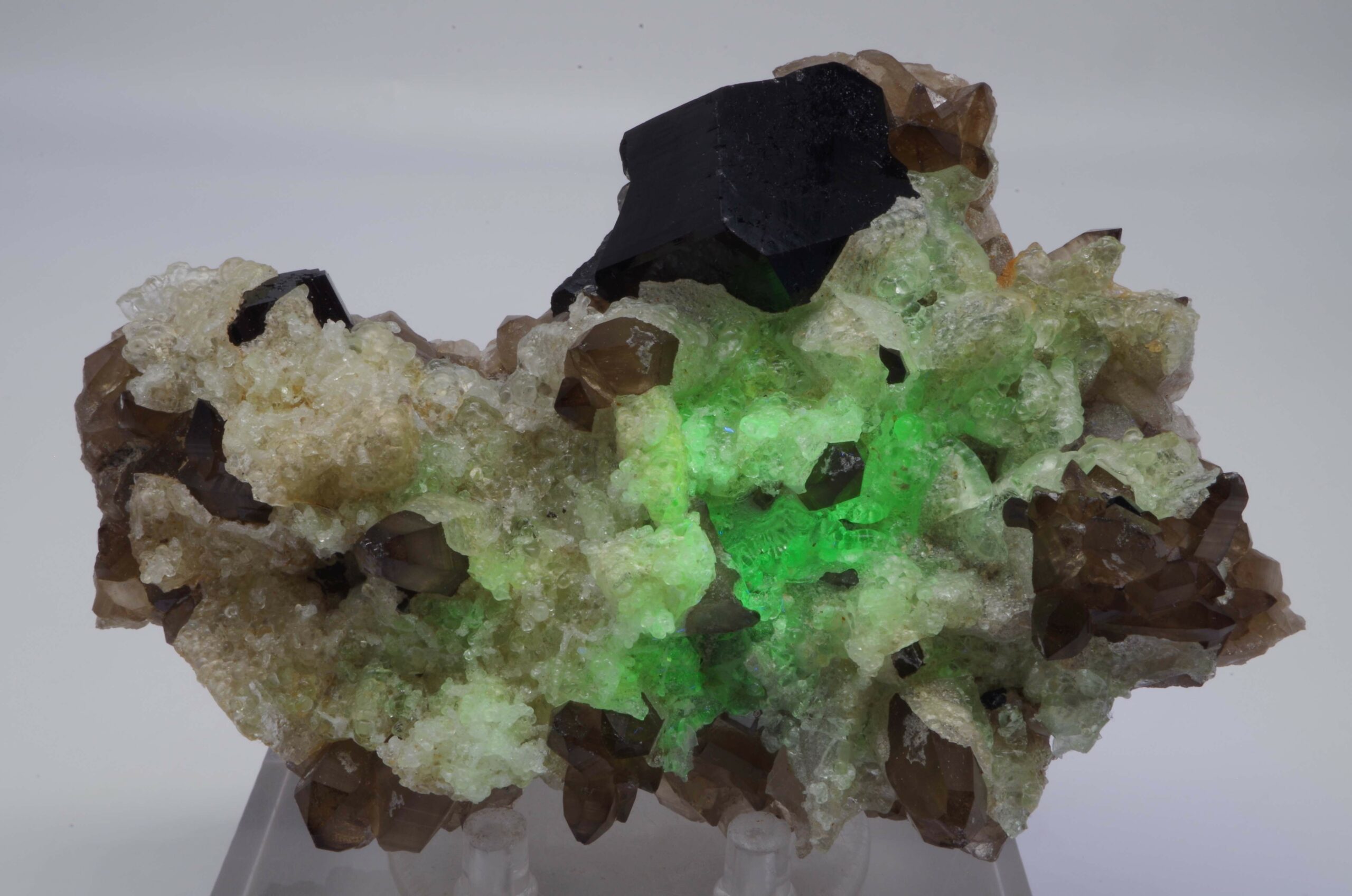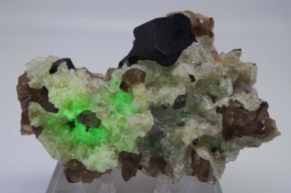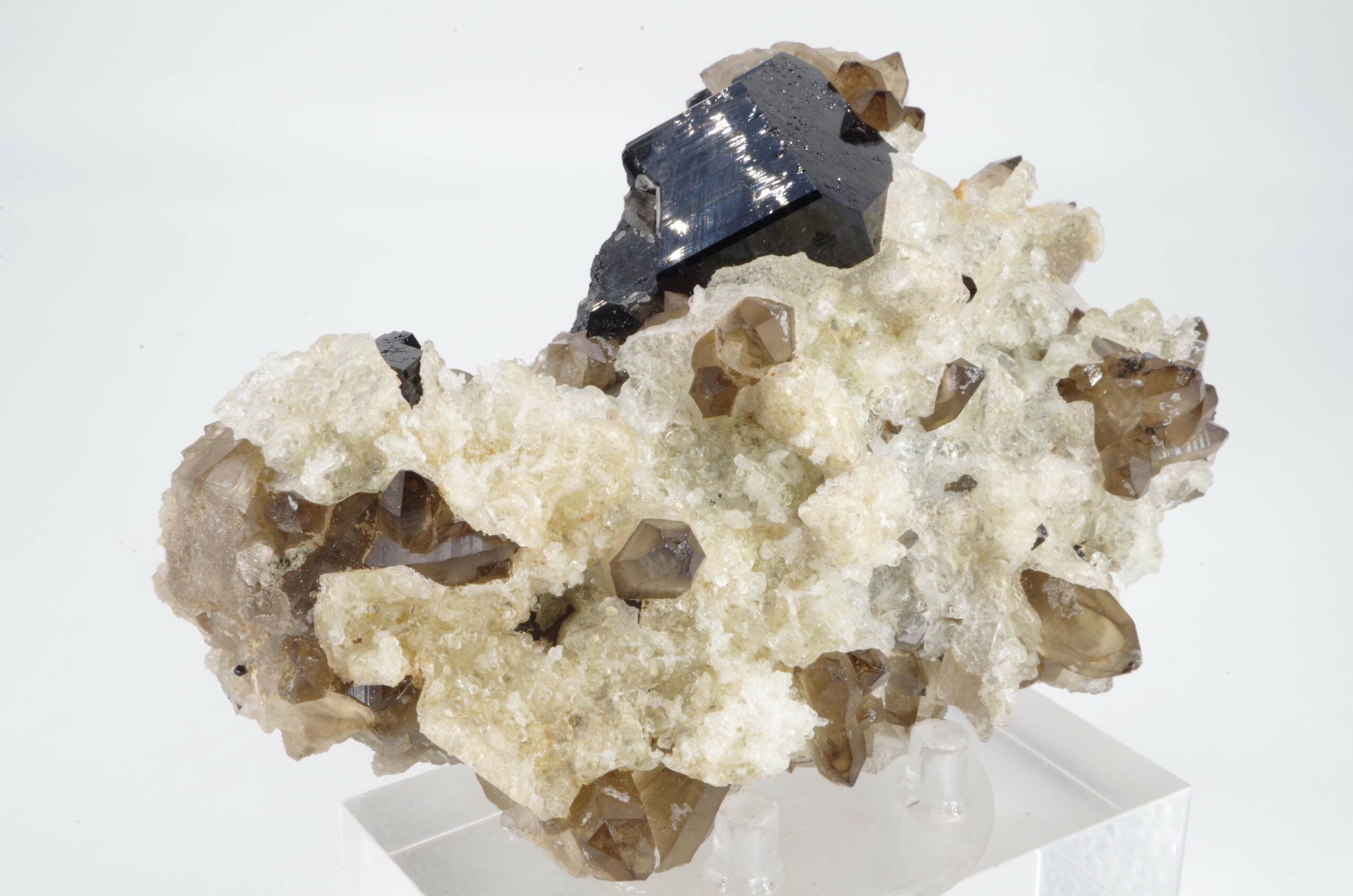 Magnifique ensemble de fines pointes de Quartz légèrement fumés encroutés par de l’Opale hyalite et surmonté par une large cristallisation de Tourmaline noire variété Schorl.
