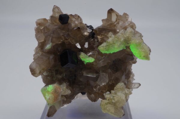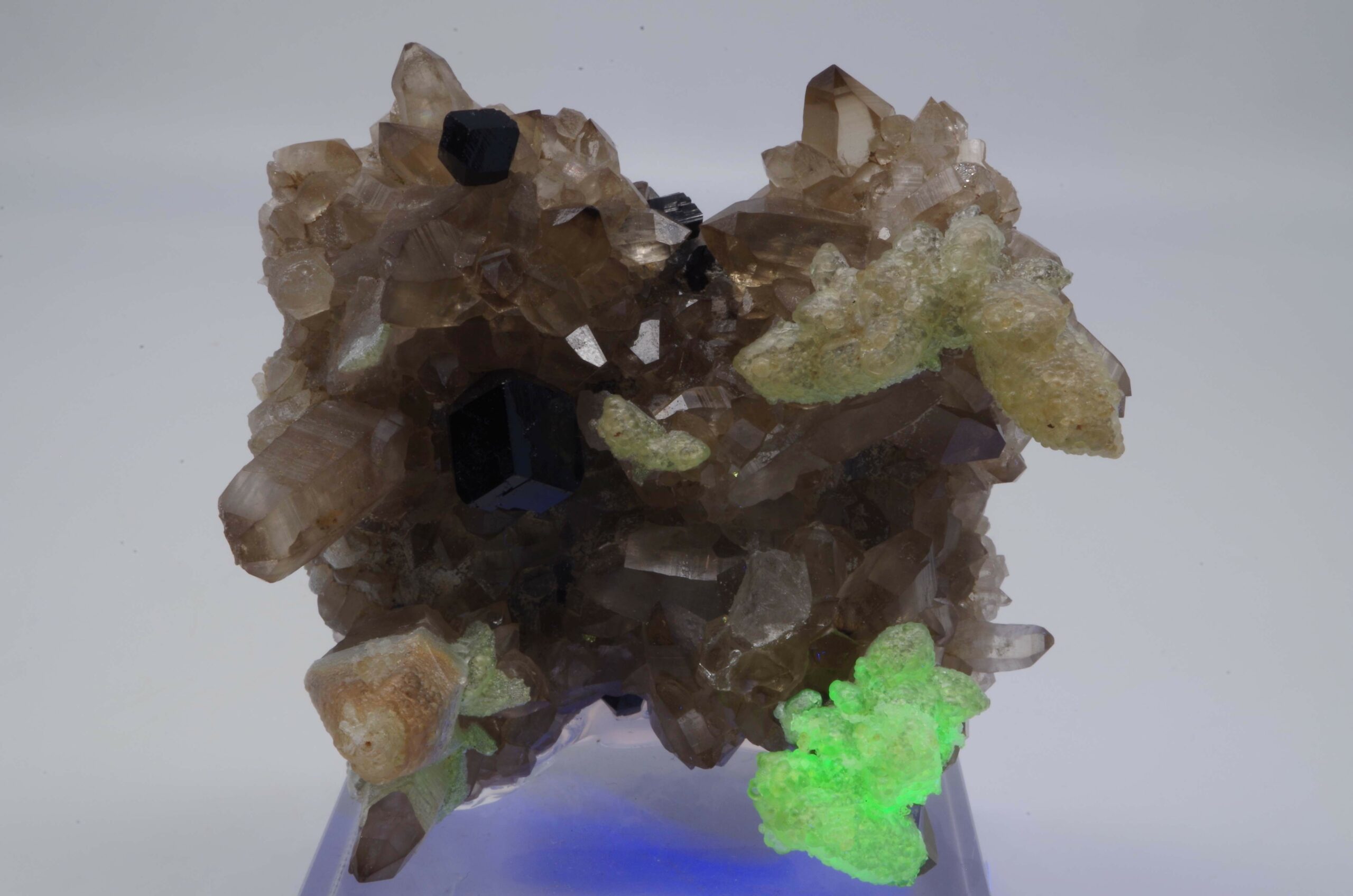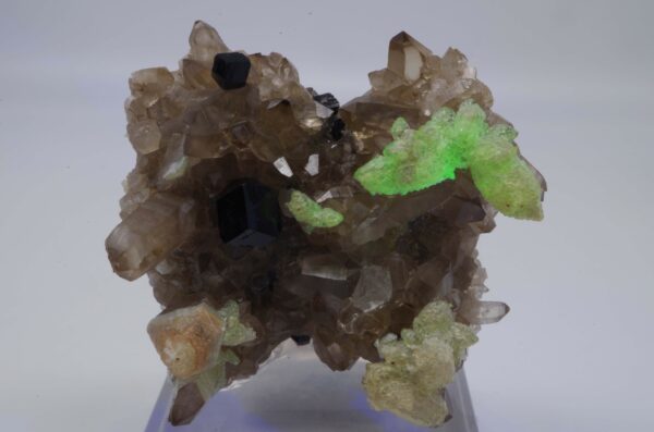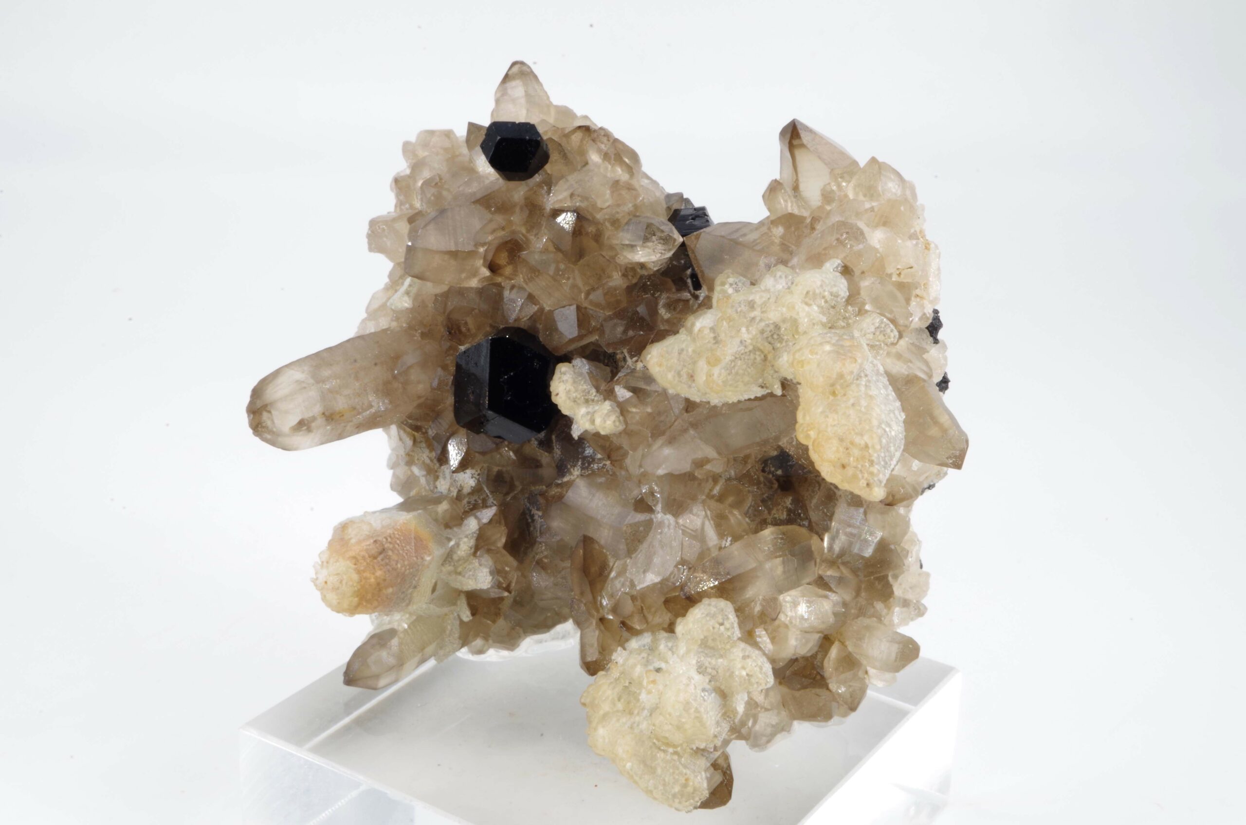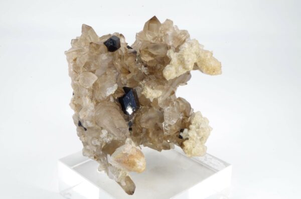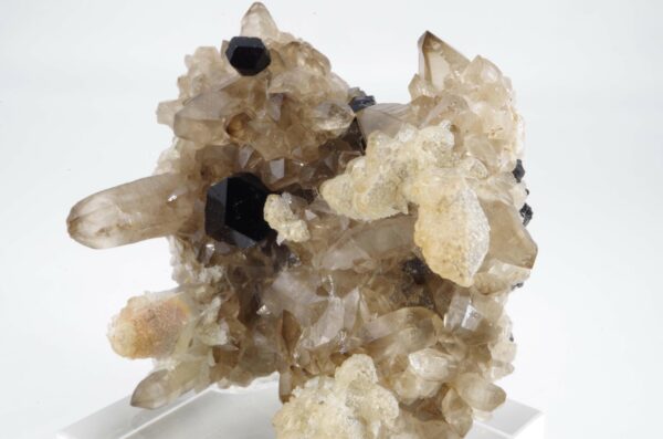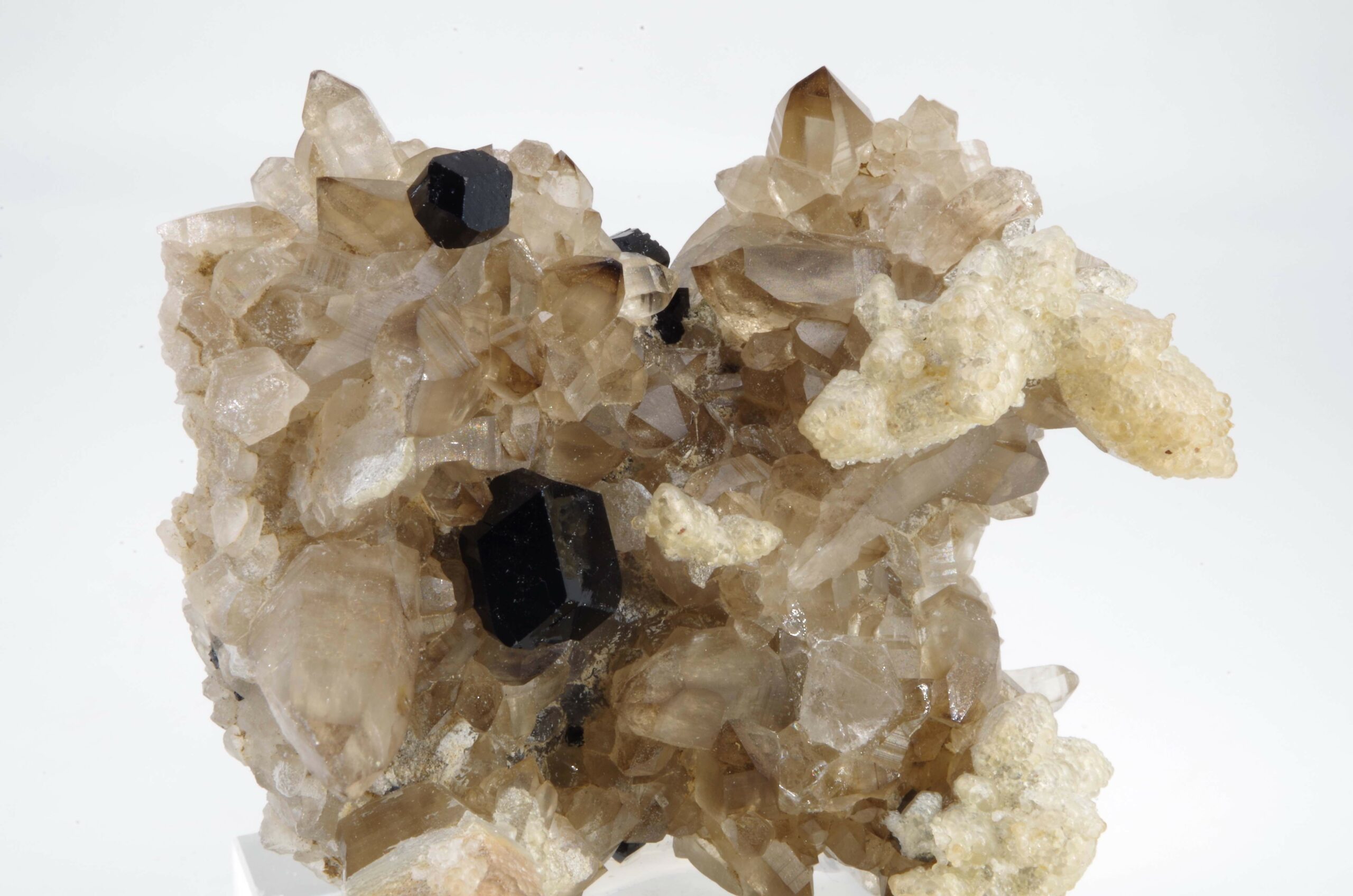 Magnifique ensemble de Quartz légèrement fumés parsemé de Tourmaline noire variété Schorl et partiellement recouvert d’Opale Hyalite.