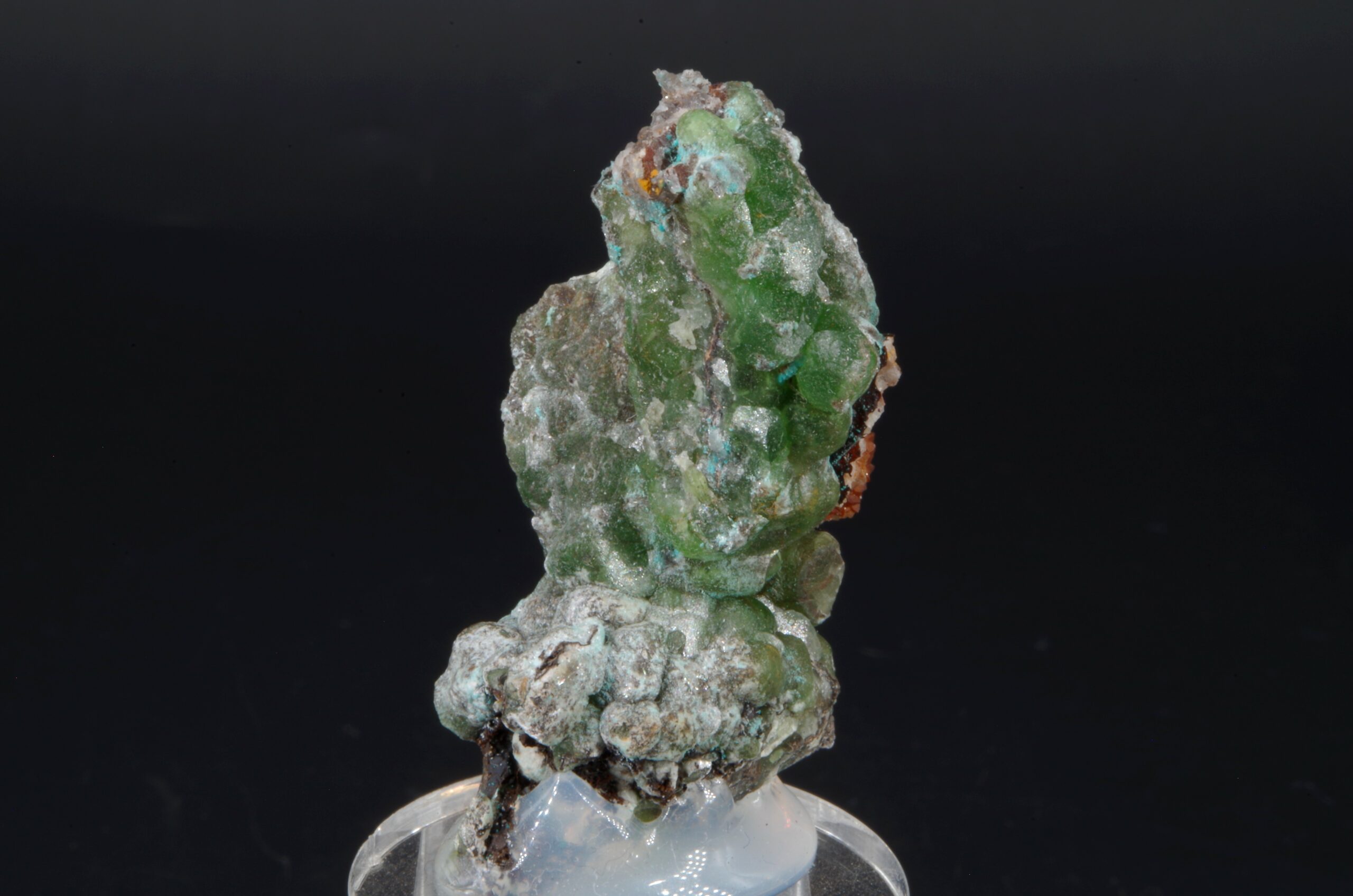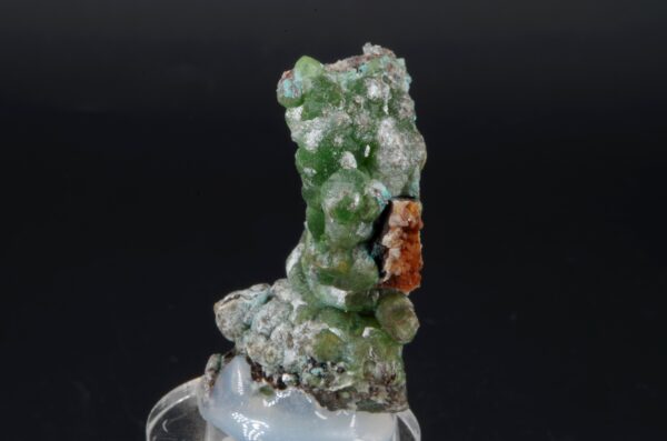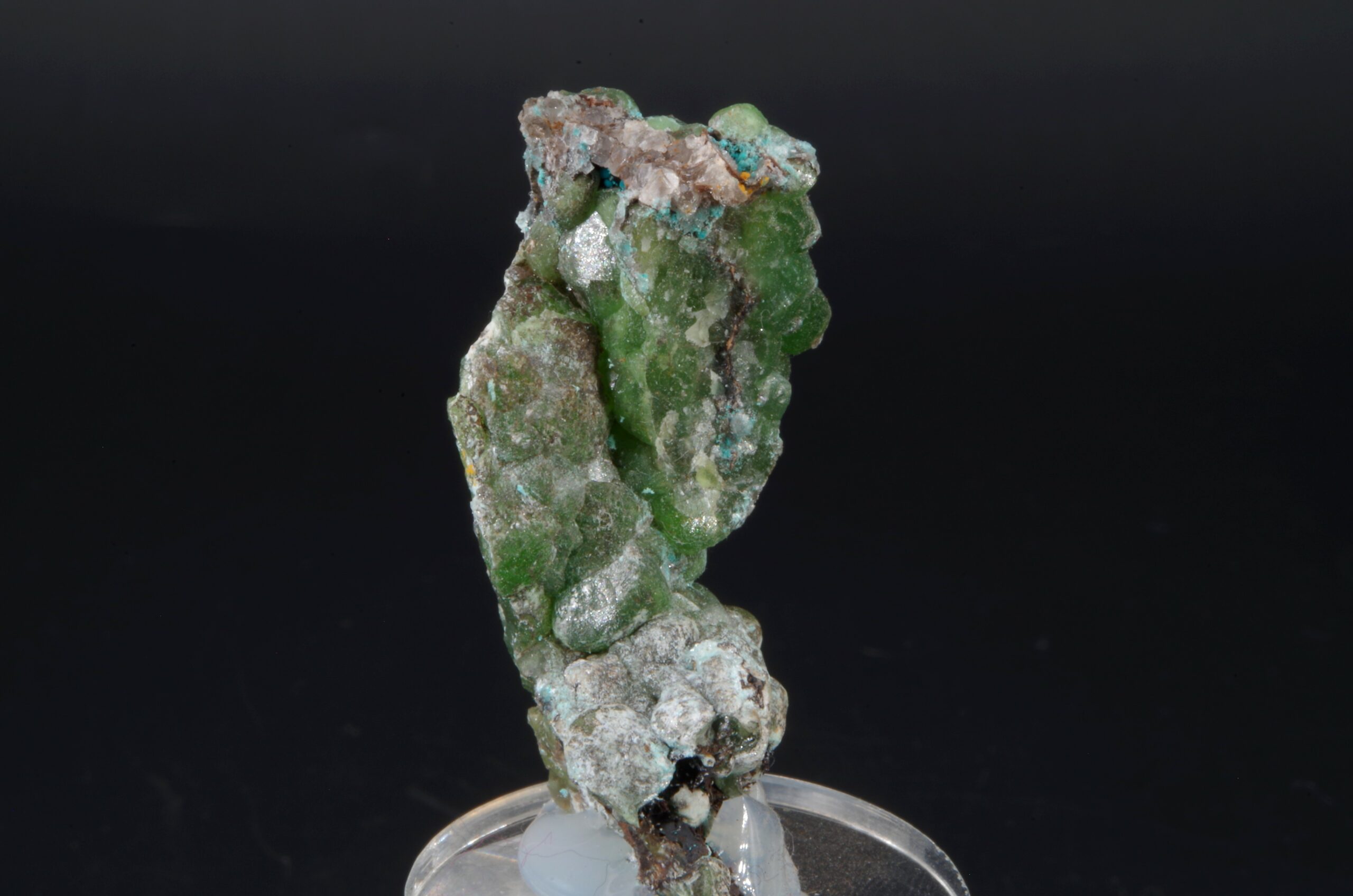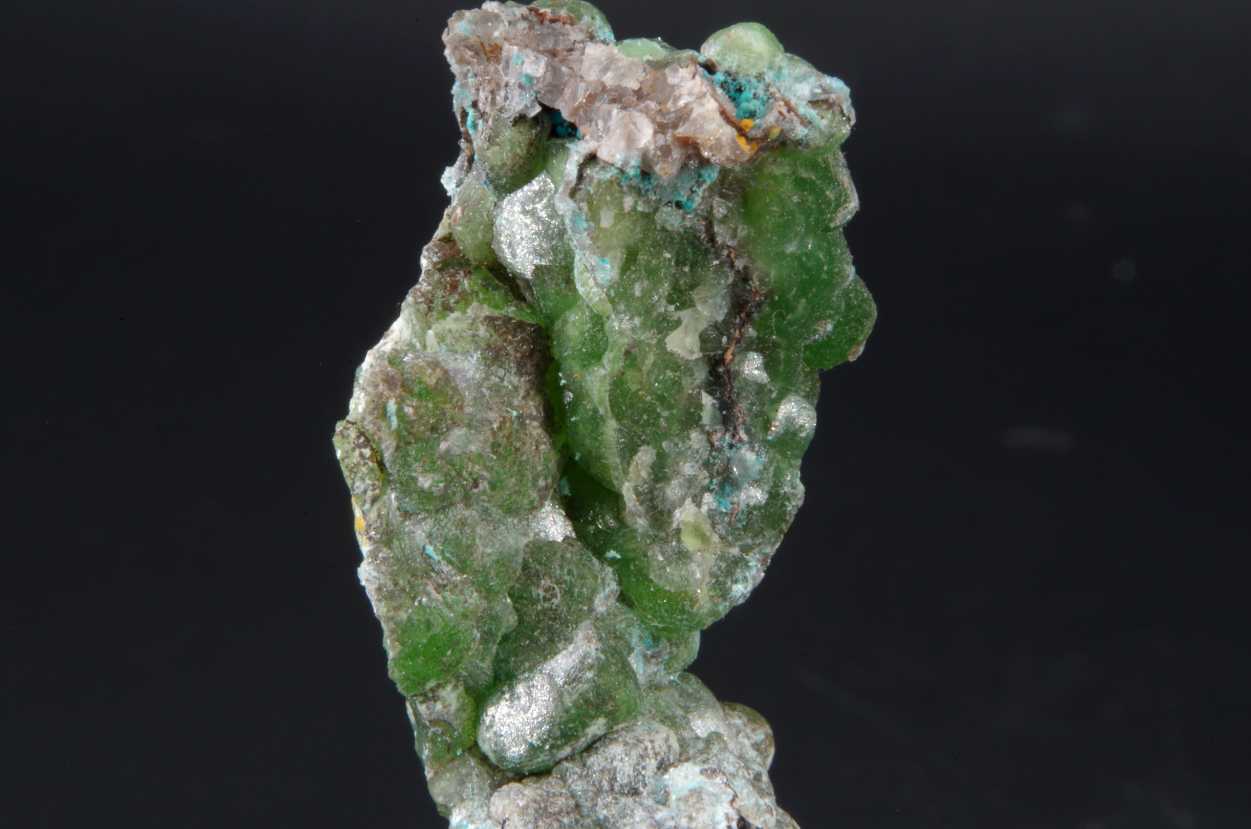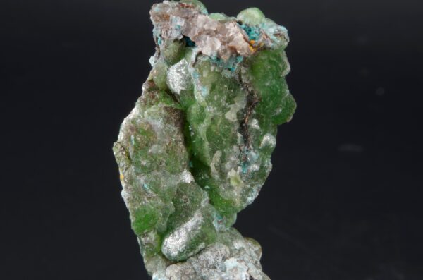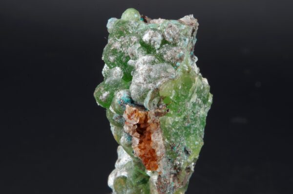 Cupro-Smithsonite d’aspect botryoïdal avec un voilage d’Aragonite et quelques traces de Rosasite.