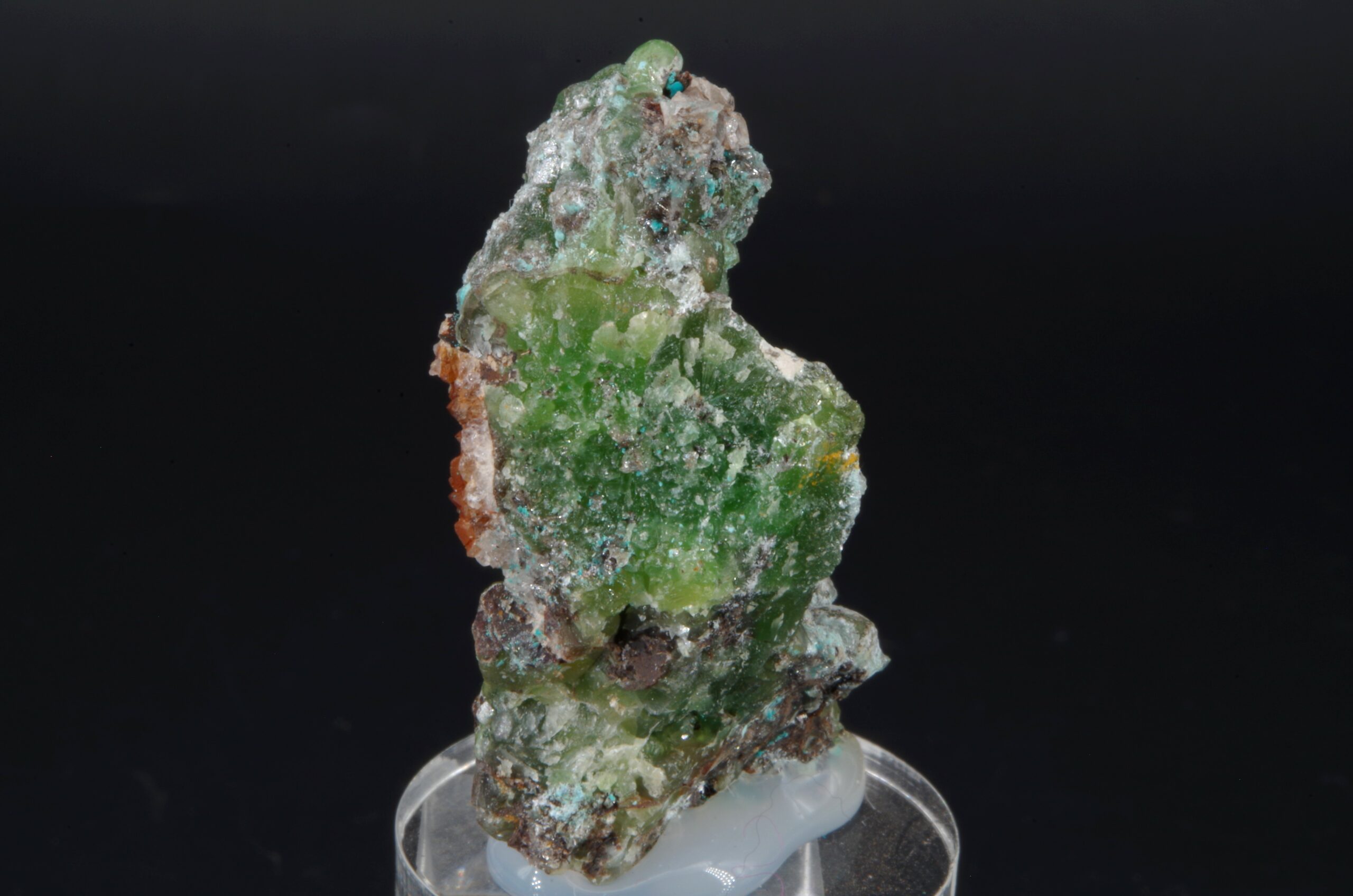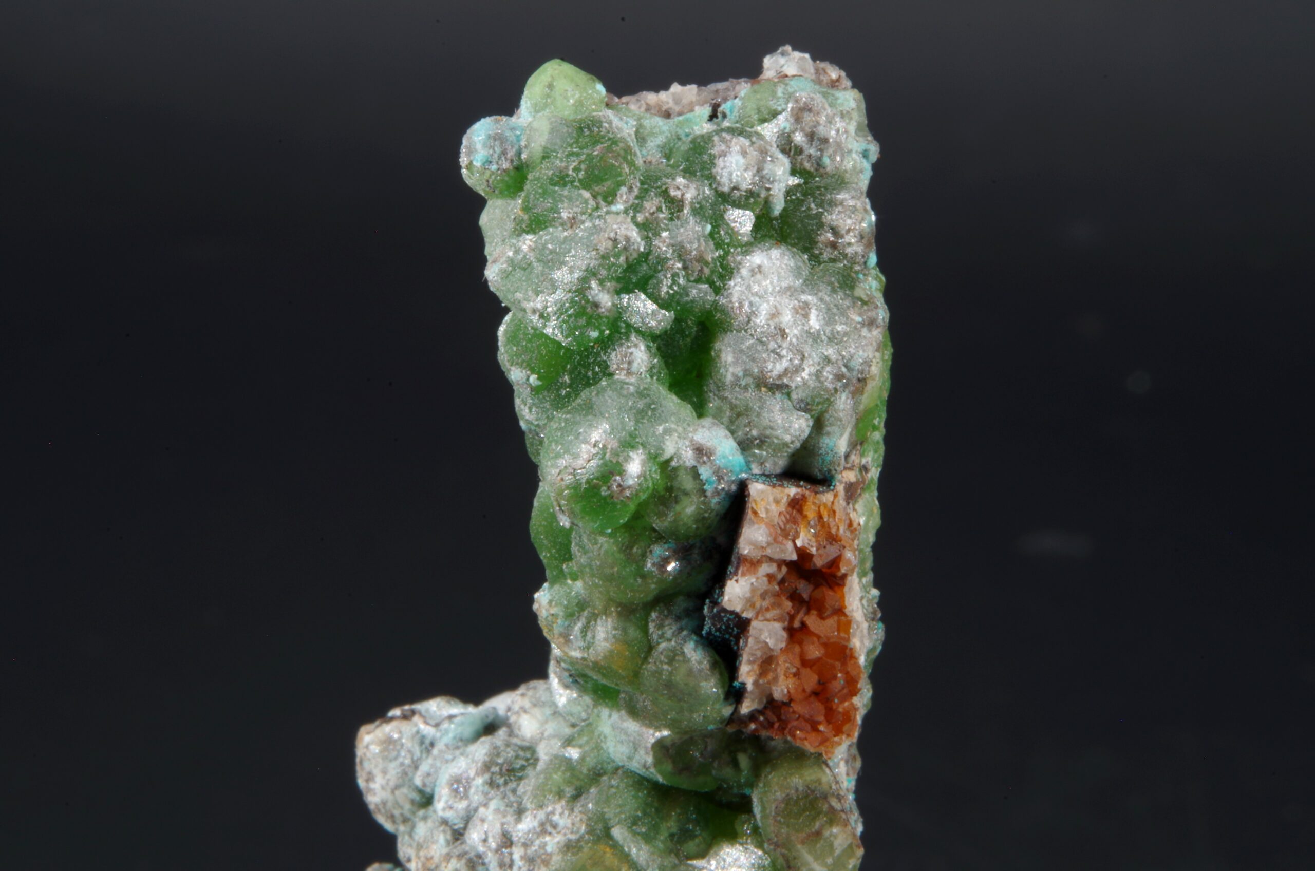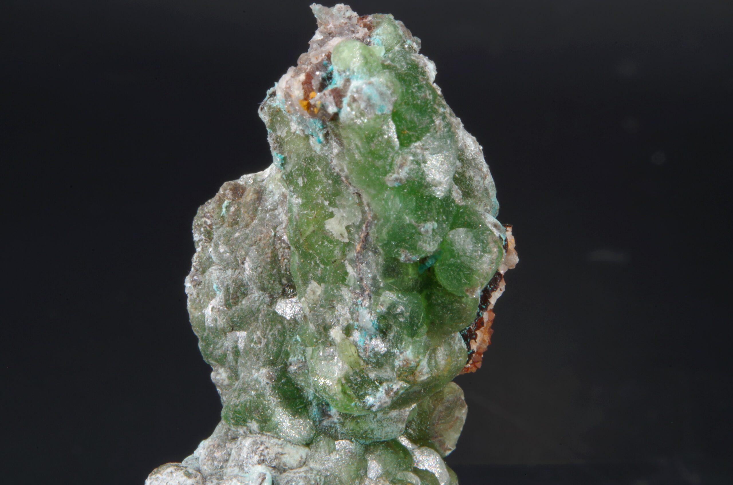 Cupro-Smithsonite d’aspect botryoïdal avec un voilage d’Aragonite et quelques traces de Rosasite.