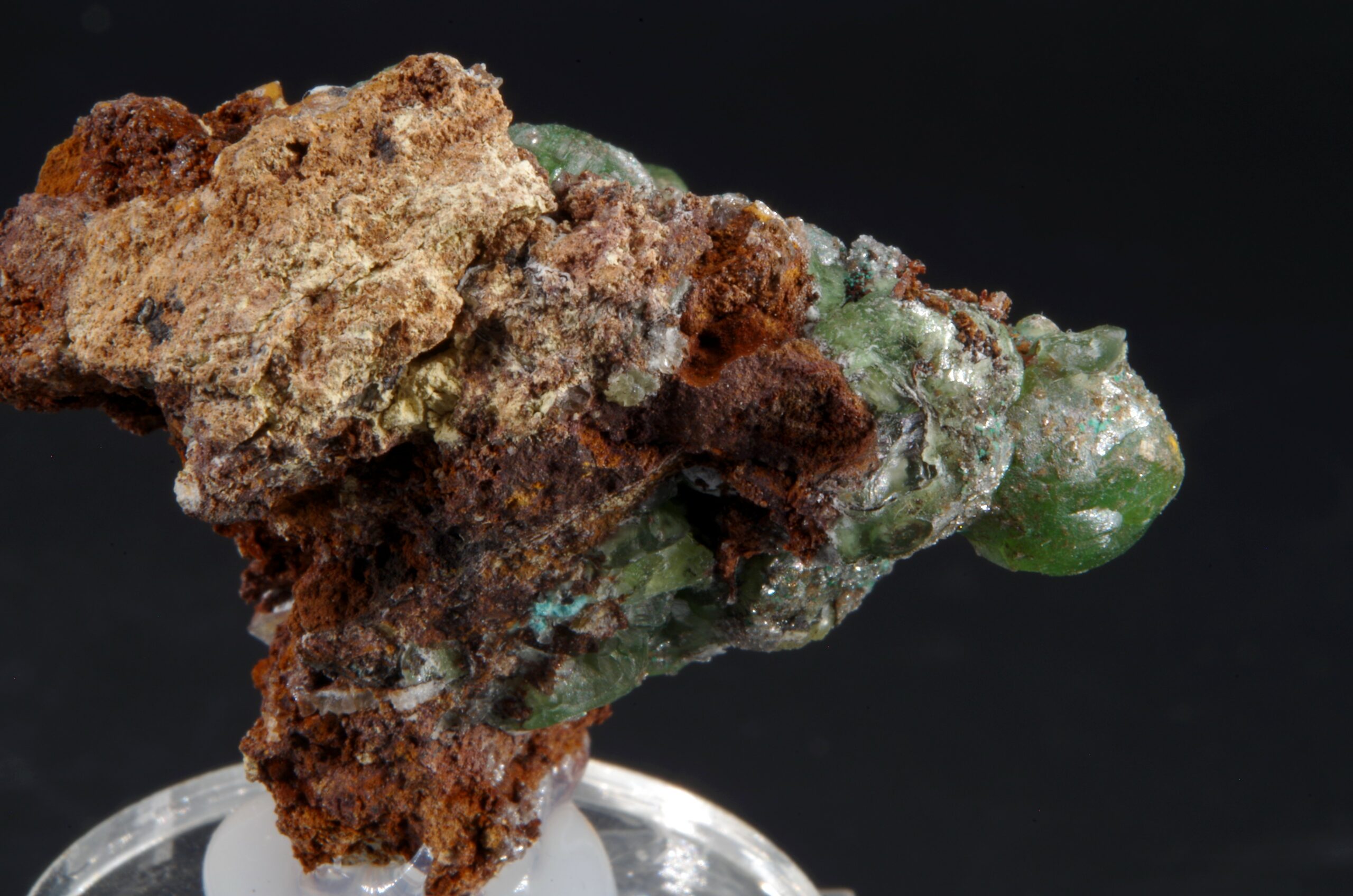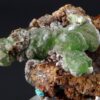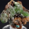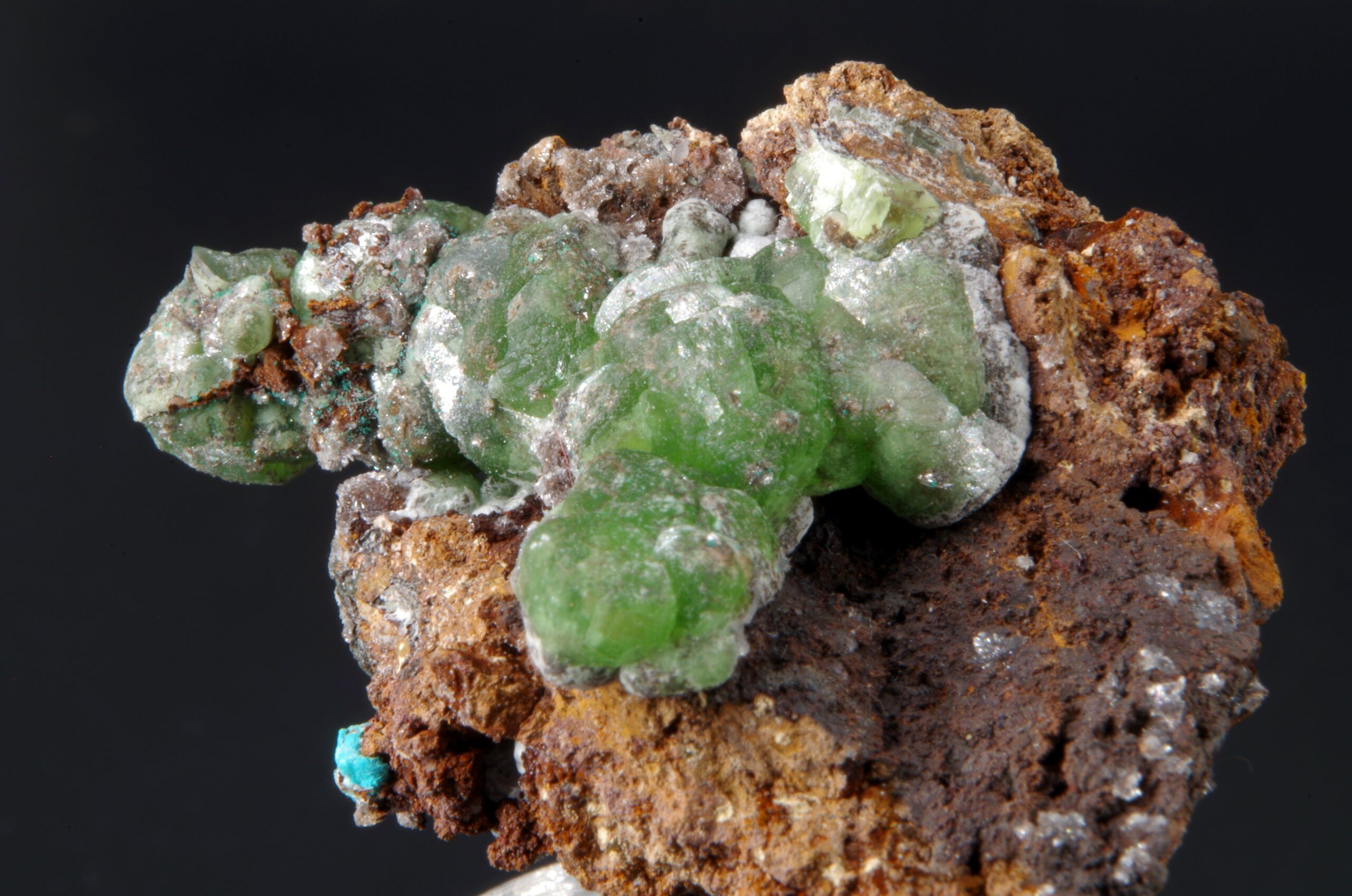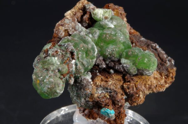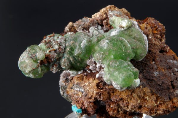 Agrégat de Cupro-Smithsonite d’aspect botryoïdal niché sur matrice de Gossan légèrement voilée par de l’Aragonite et de l’Hémimorphite complété par une sphérule de Rosasite.