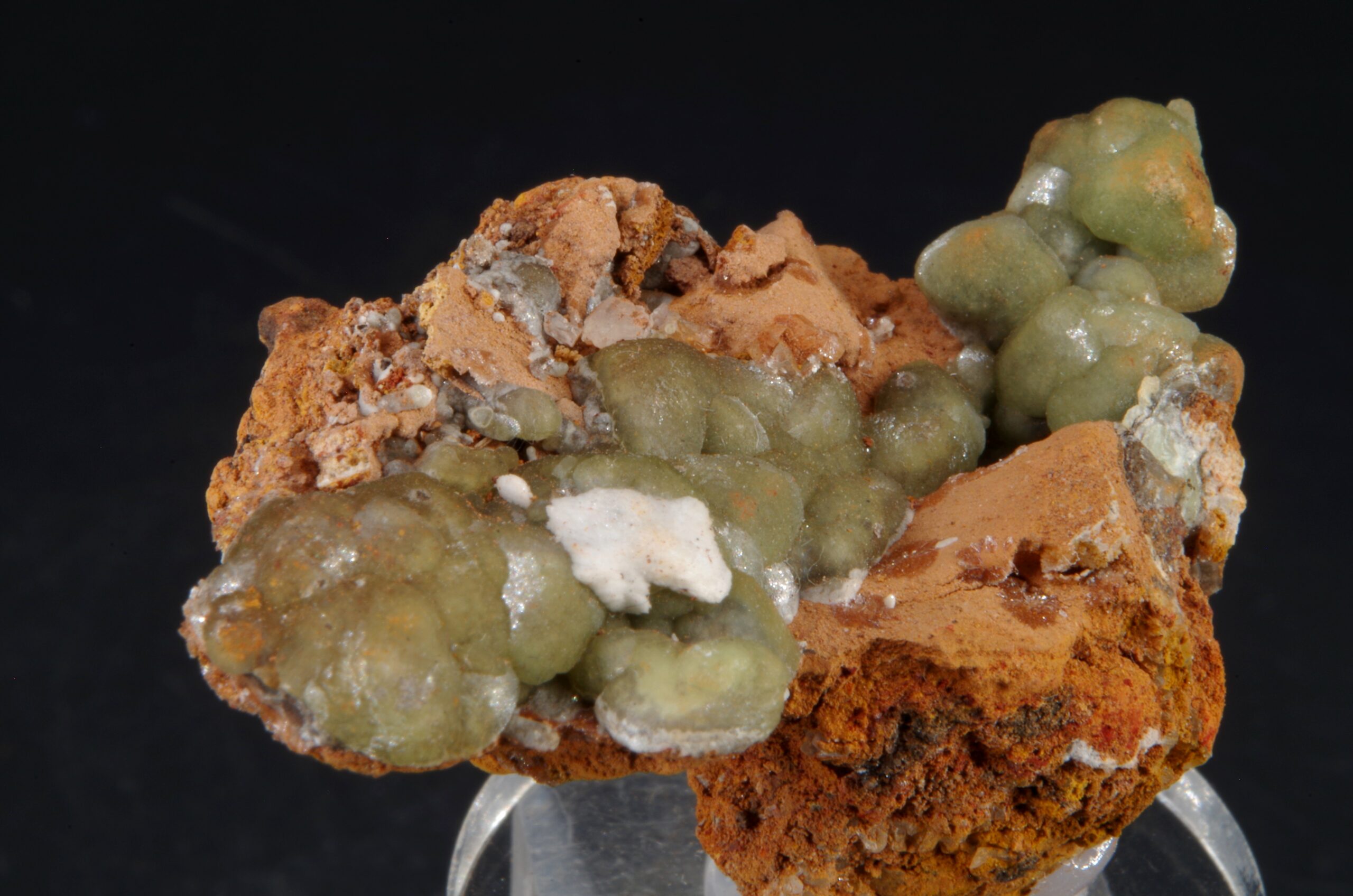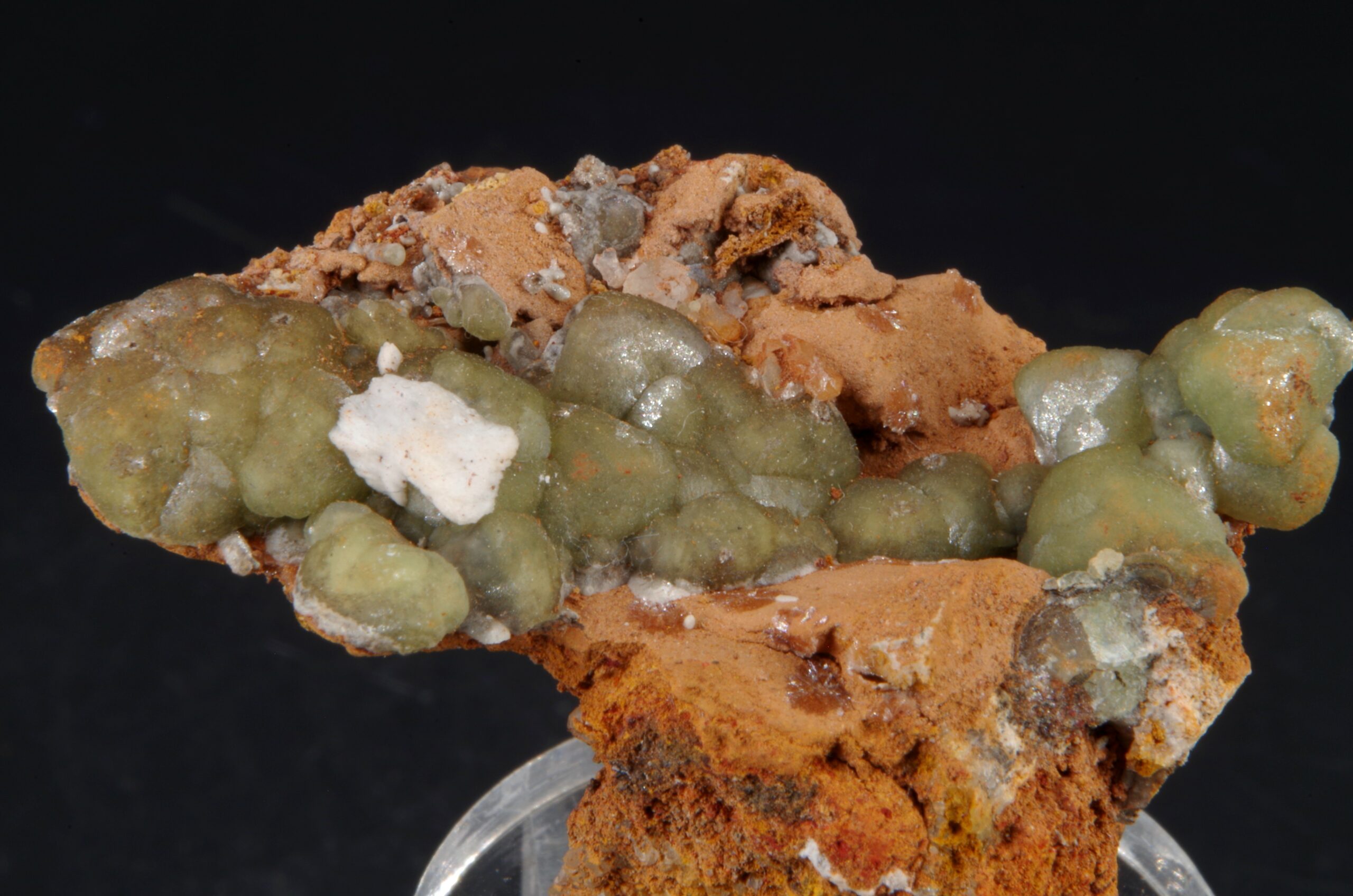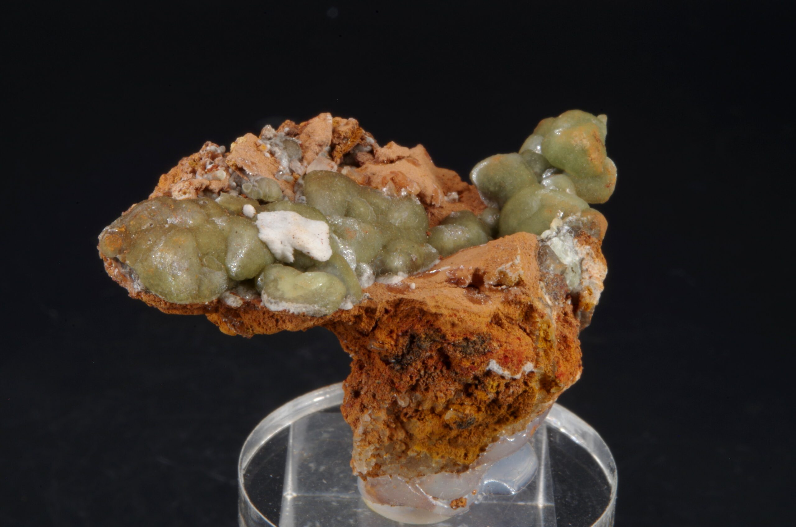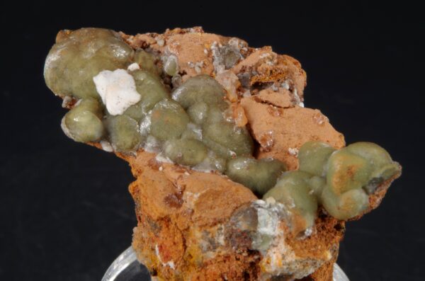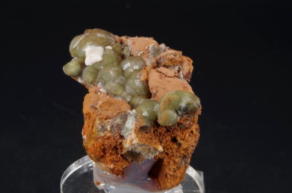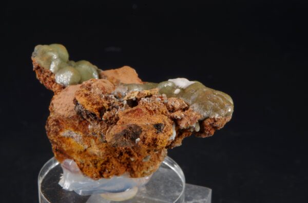 Agrégat de Cupro-Smithsonite d’aspect botryoïdal niché sur matrice de Gossan avec une petite formation d’Aragonite blanche offrant une belle présentation.