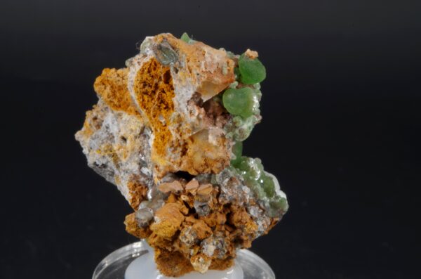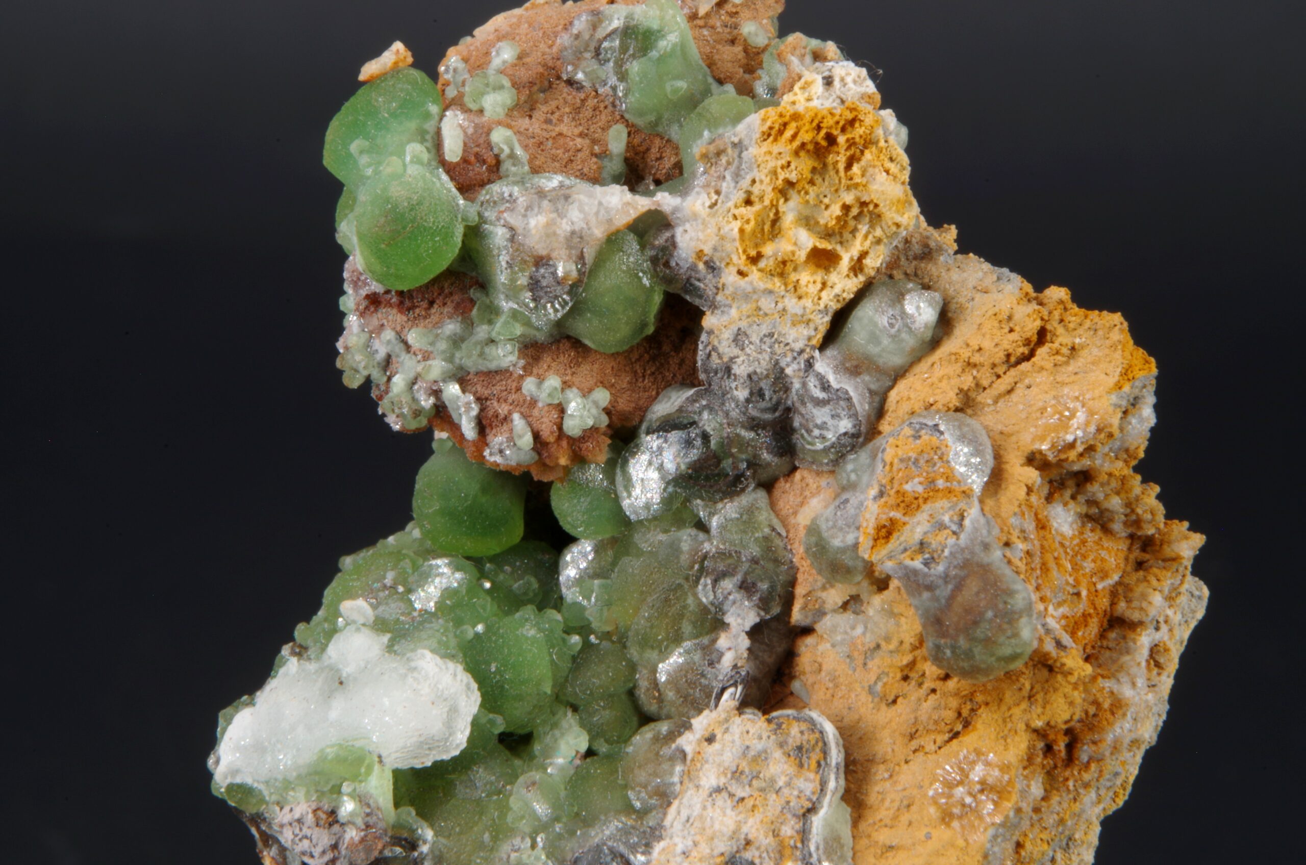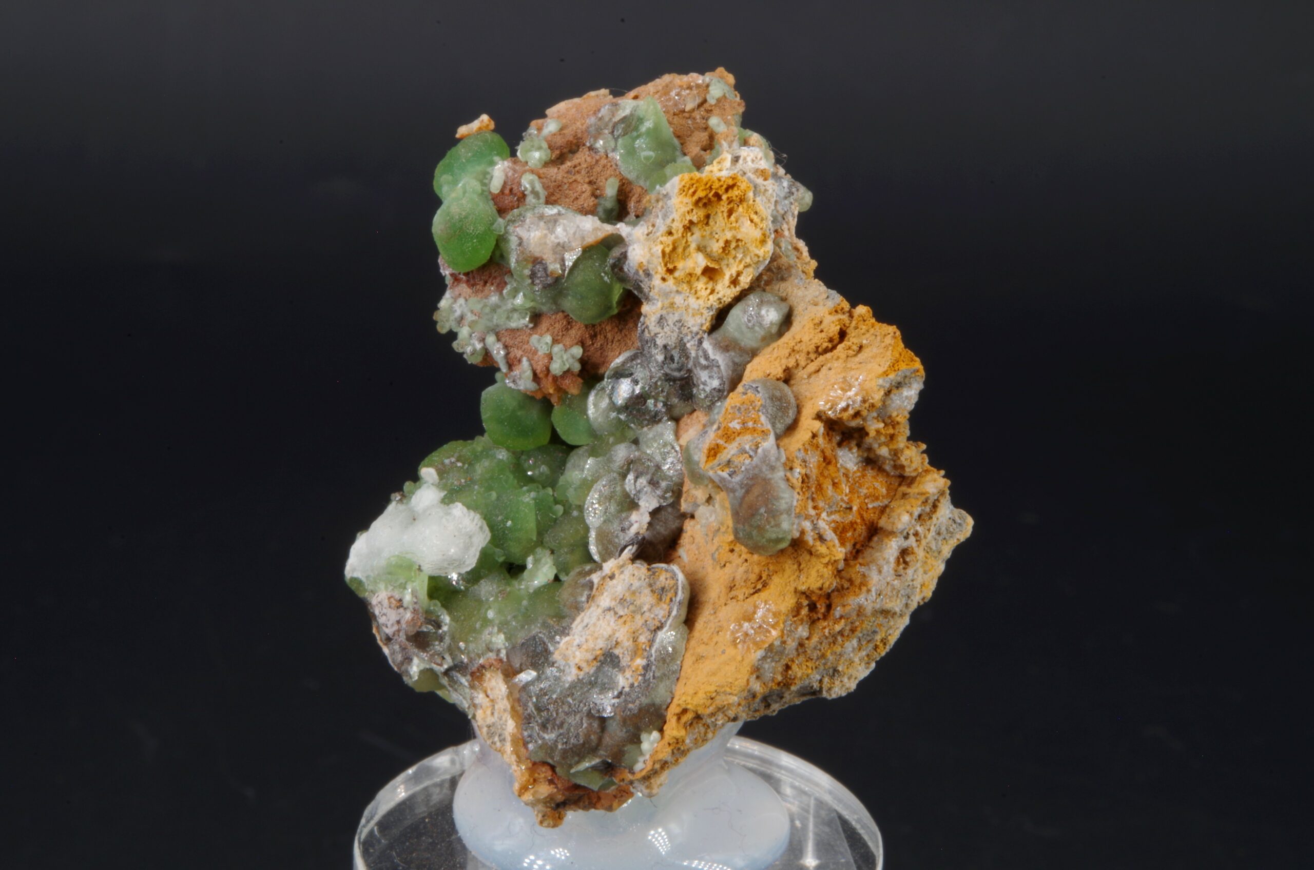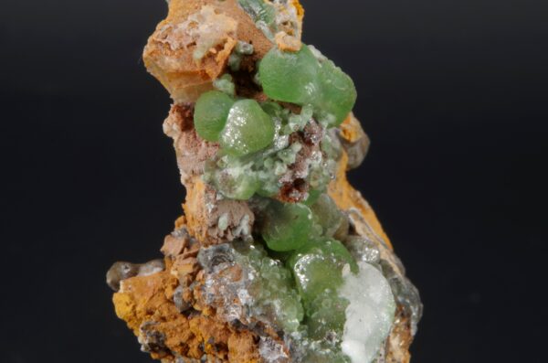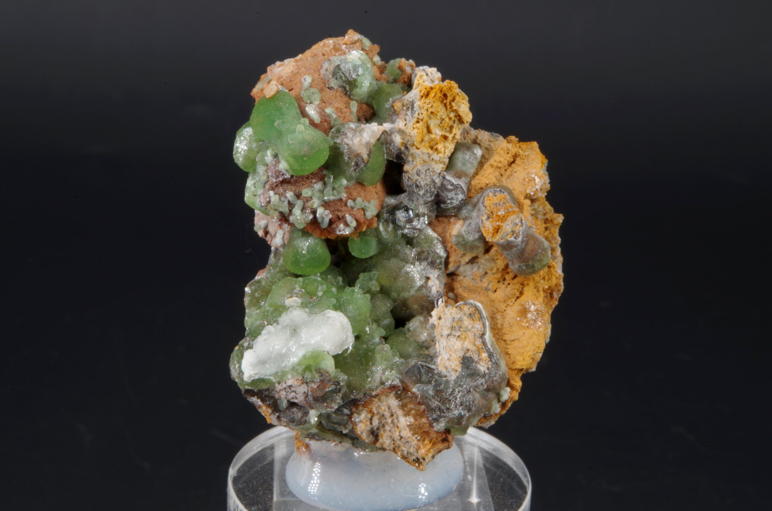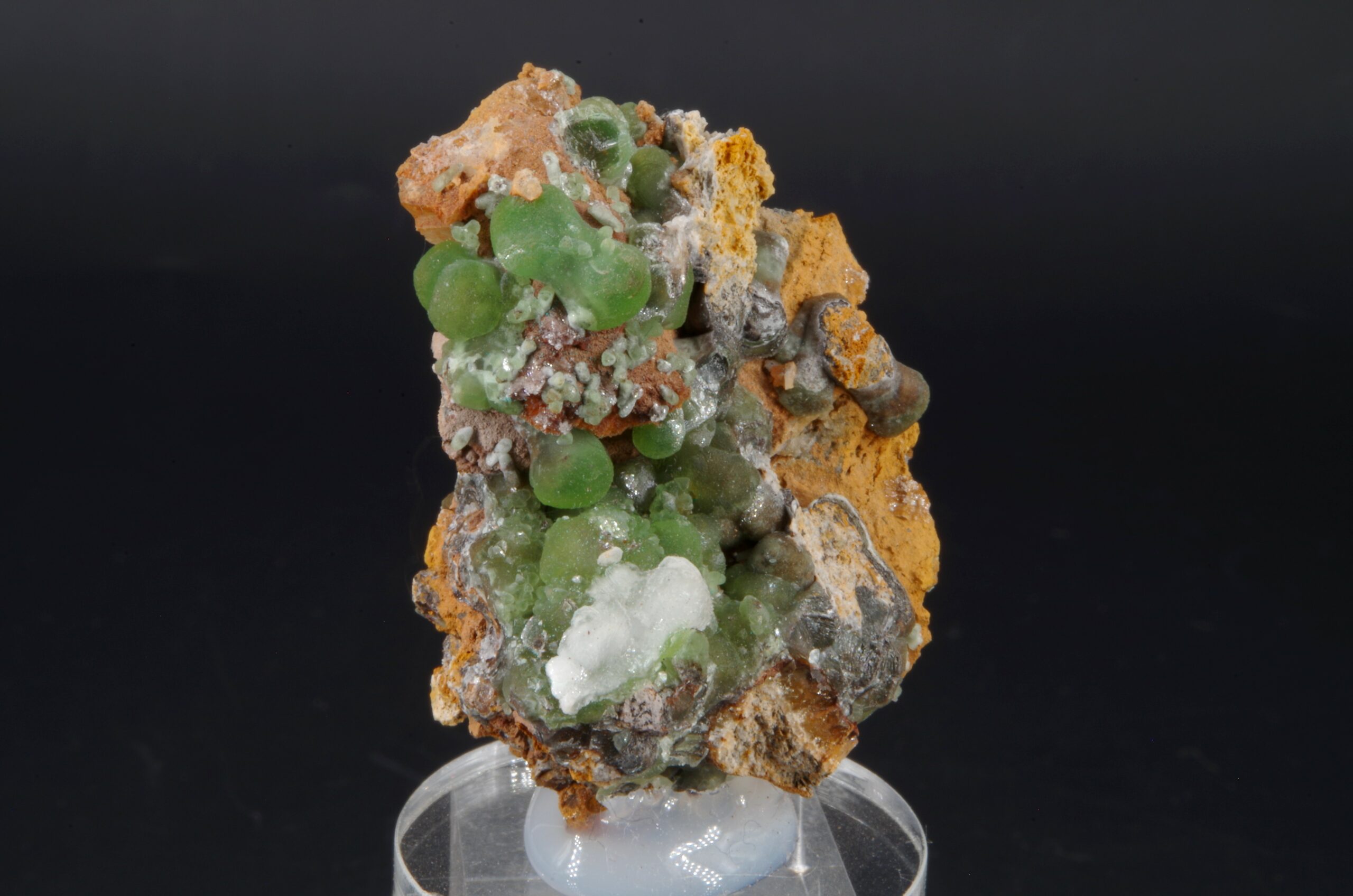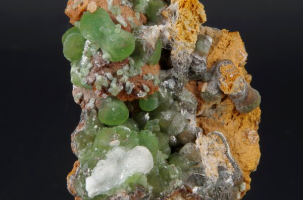 Jolie Cupro-Smithsonite d’aspect botryoïdal sur matrice de Gossan avec une petite couverture d’Aragonite laiteuse.