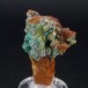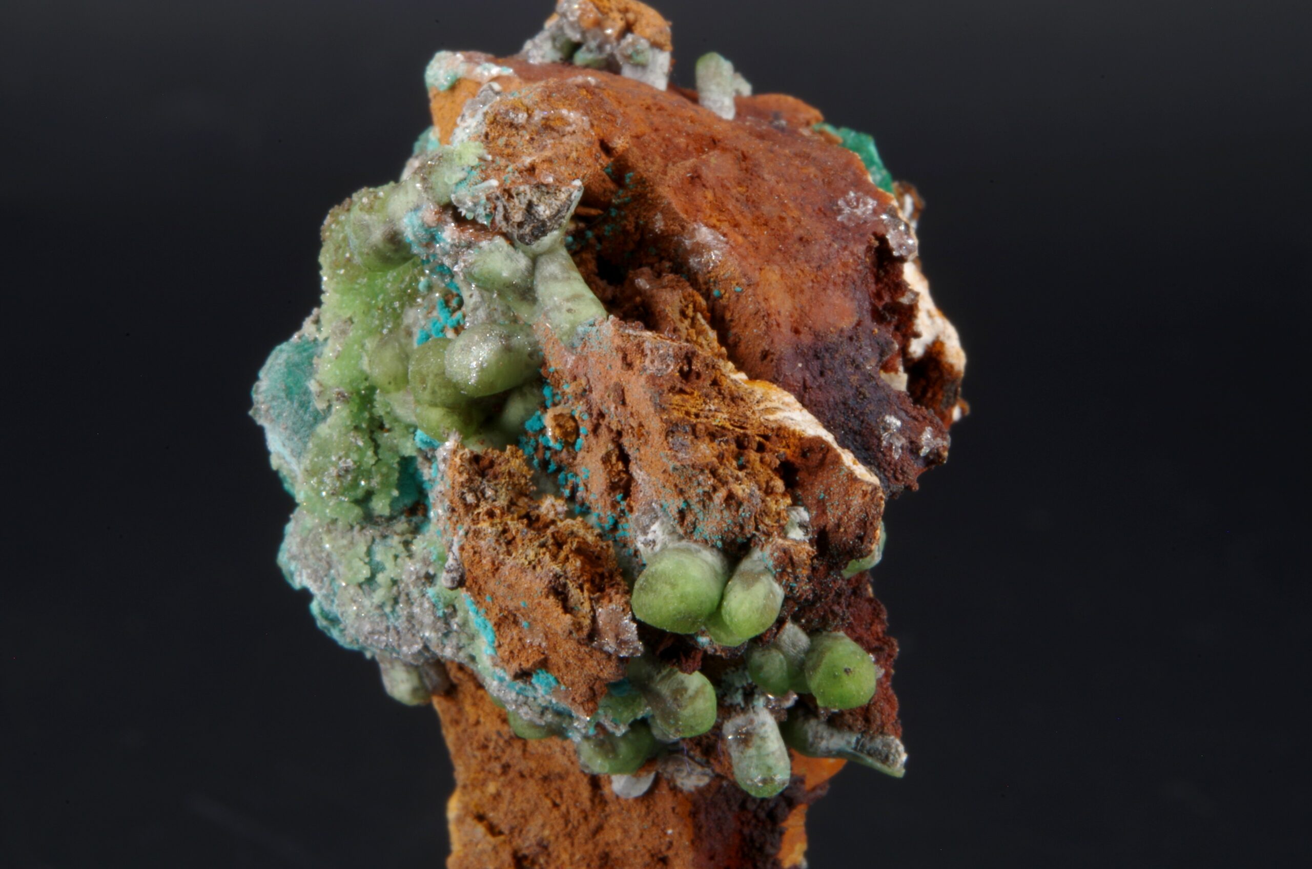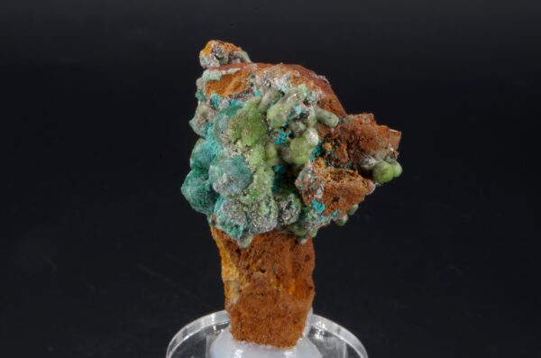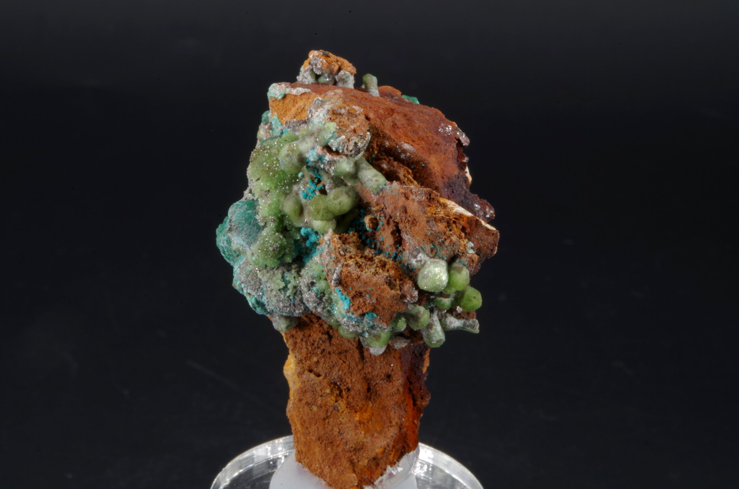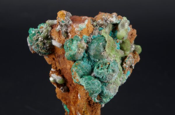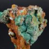 Joli spécimen Cupro-Smithsonite et Malachite botryoïdale cristallisées sur une matrice couverte de petites cristallisations de Rosasite bleue et d’Hémimorphite.