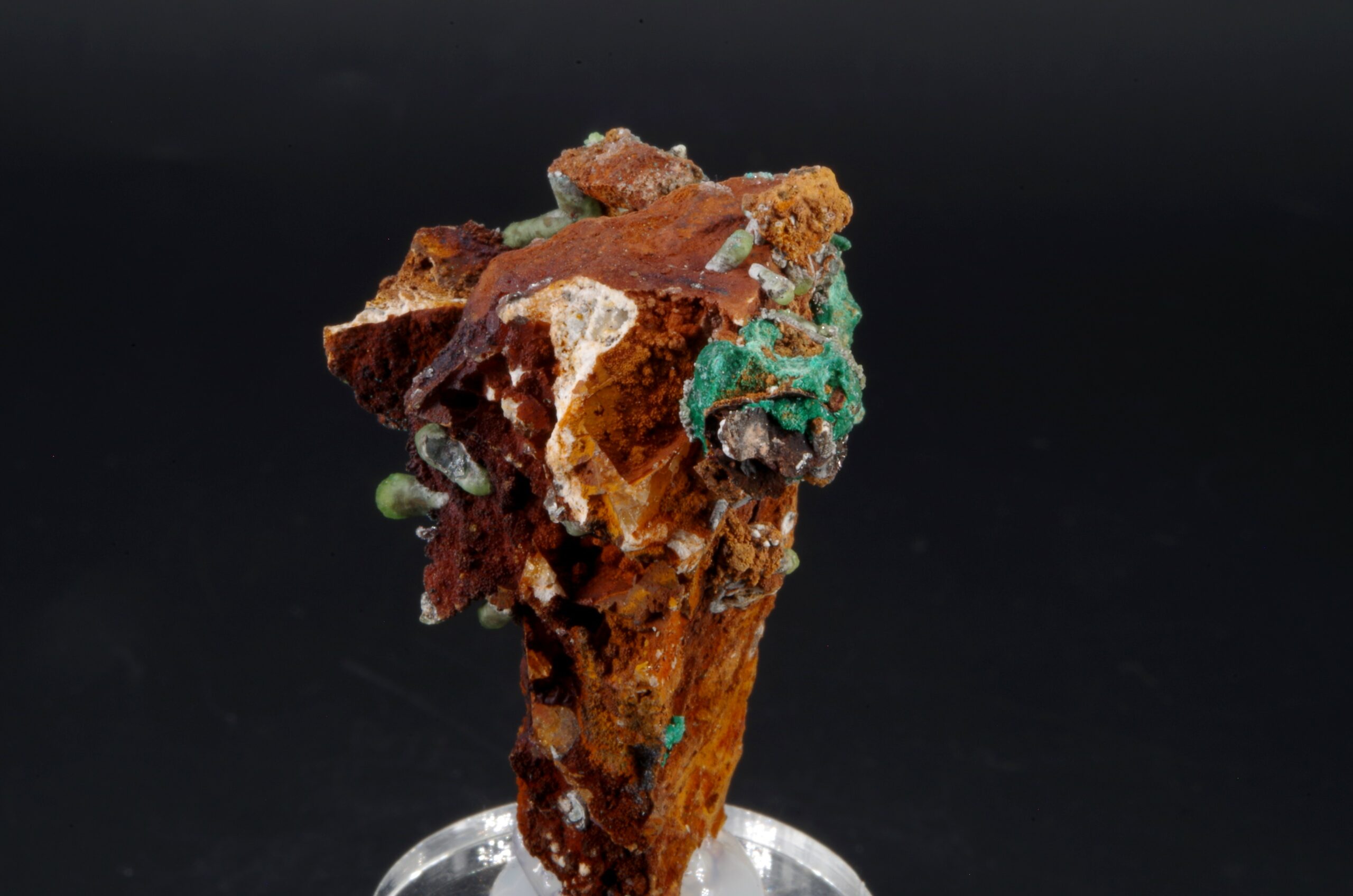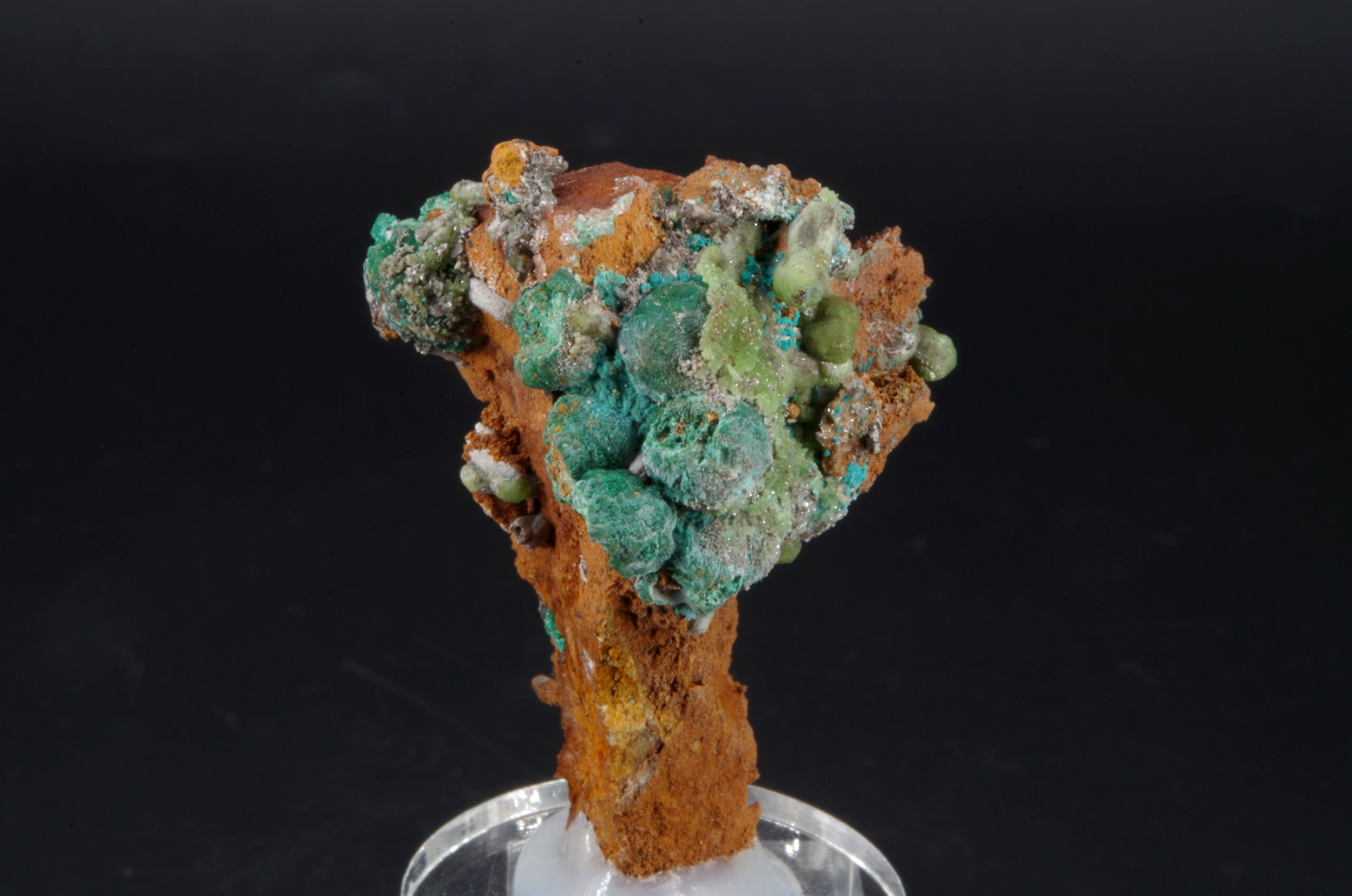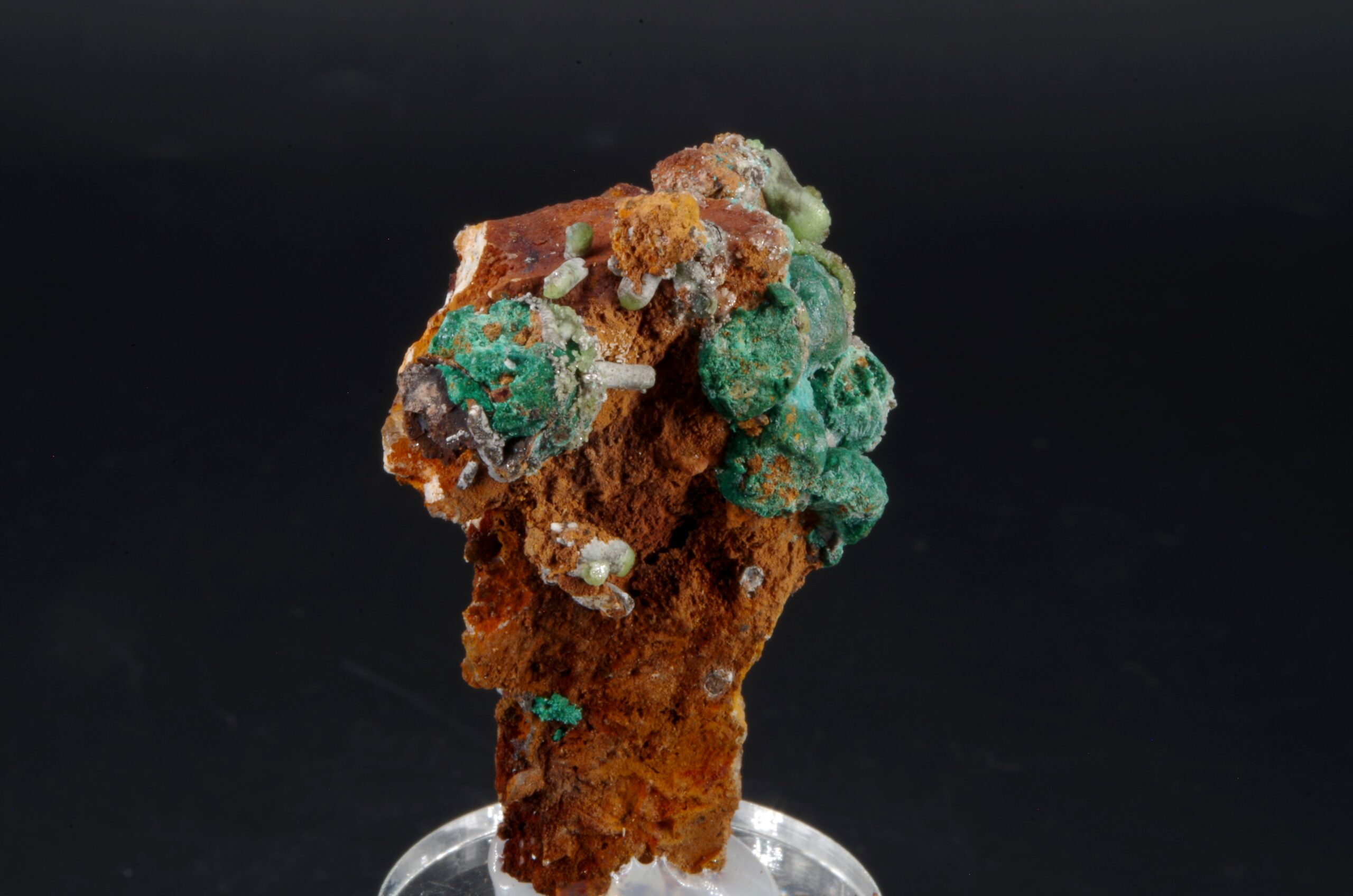Joli spécimen Cupro-Smithsonite et Malachite botryoïdale cristallisées sur une matrice couverte de petites cristallisations de Rosasite bleue et d’Hémimorphite.