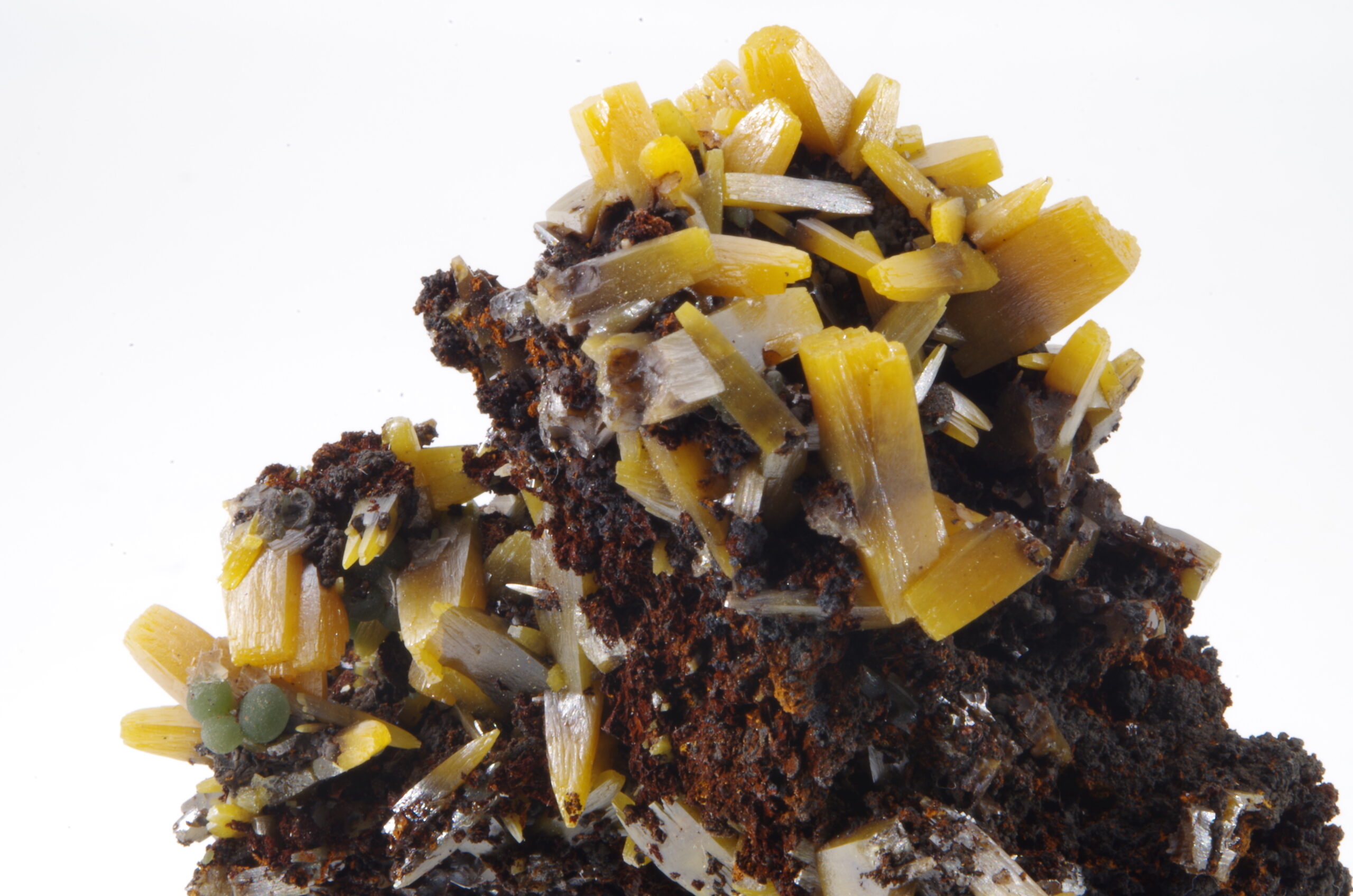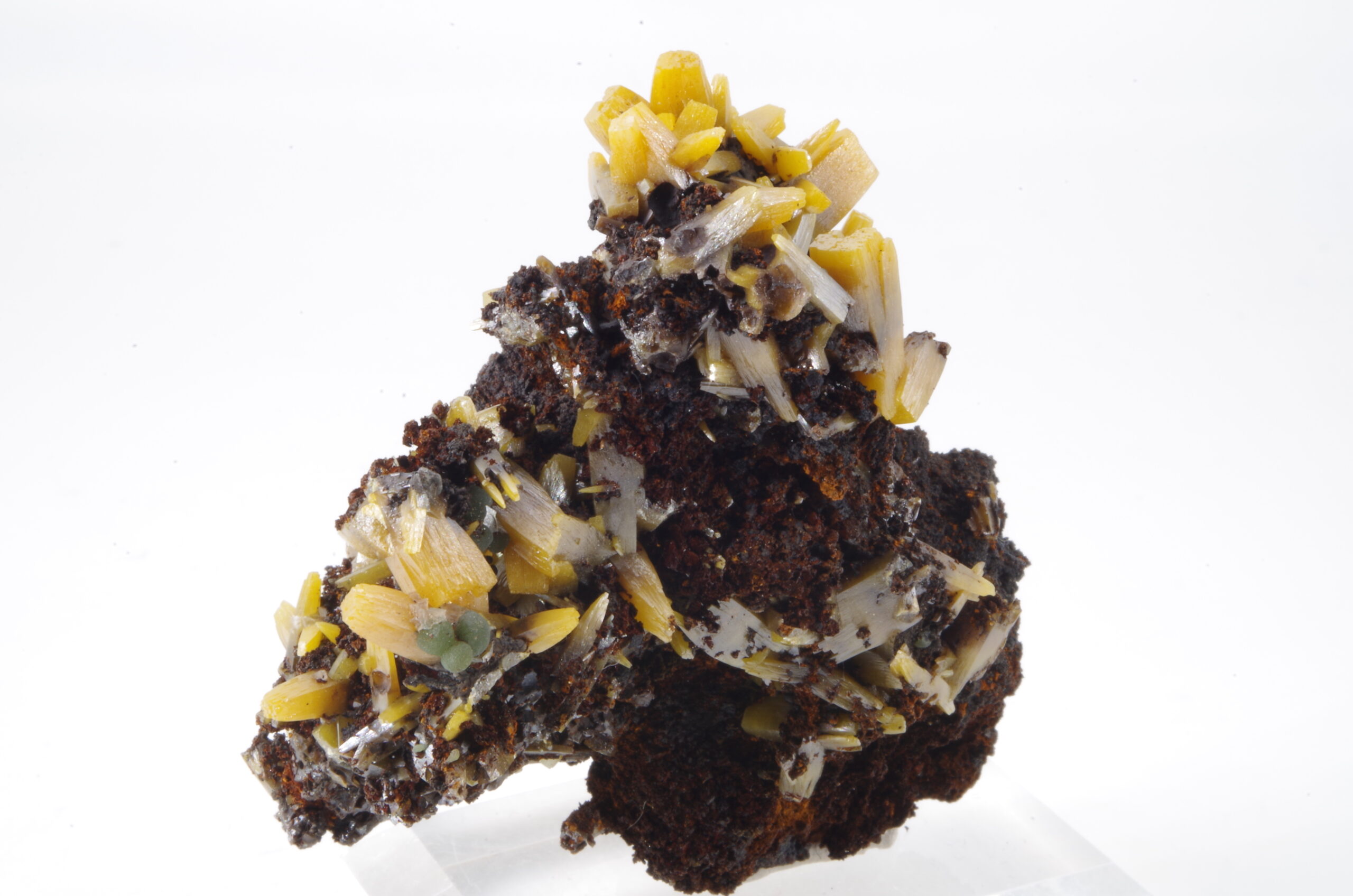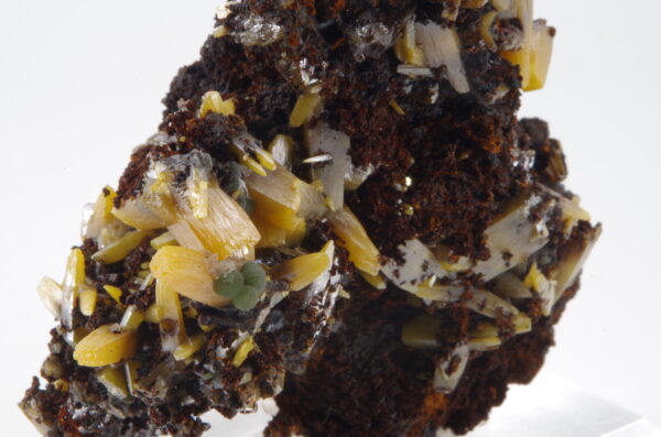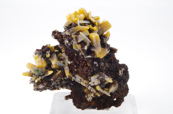 Superbe spécimen de Wulfénite sur matrice de Gossan présentant une cristallisation trapue idéalement positionnée et comportant quelques jolies sphérules de Mimétite.