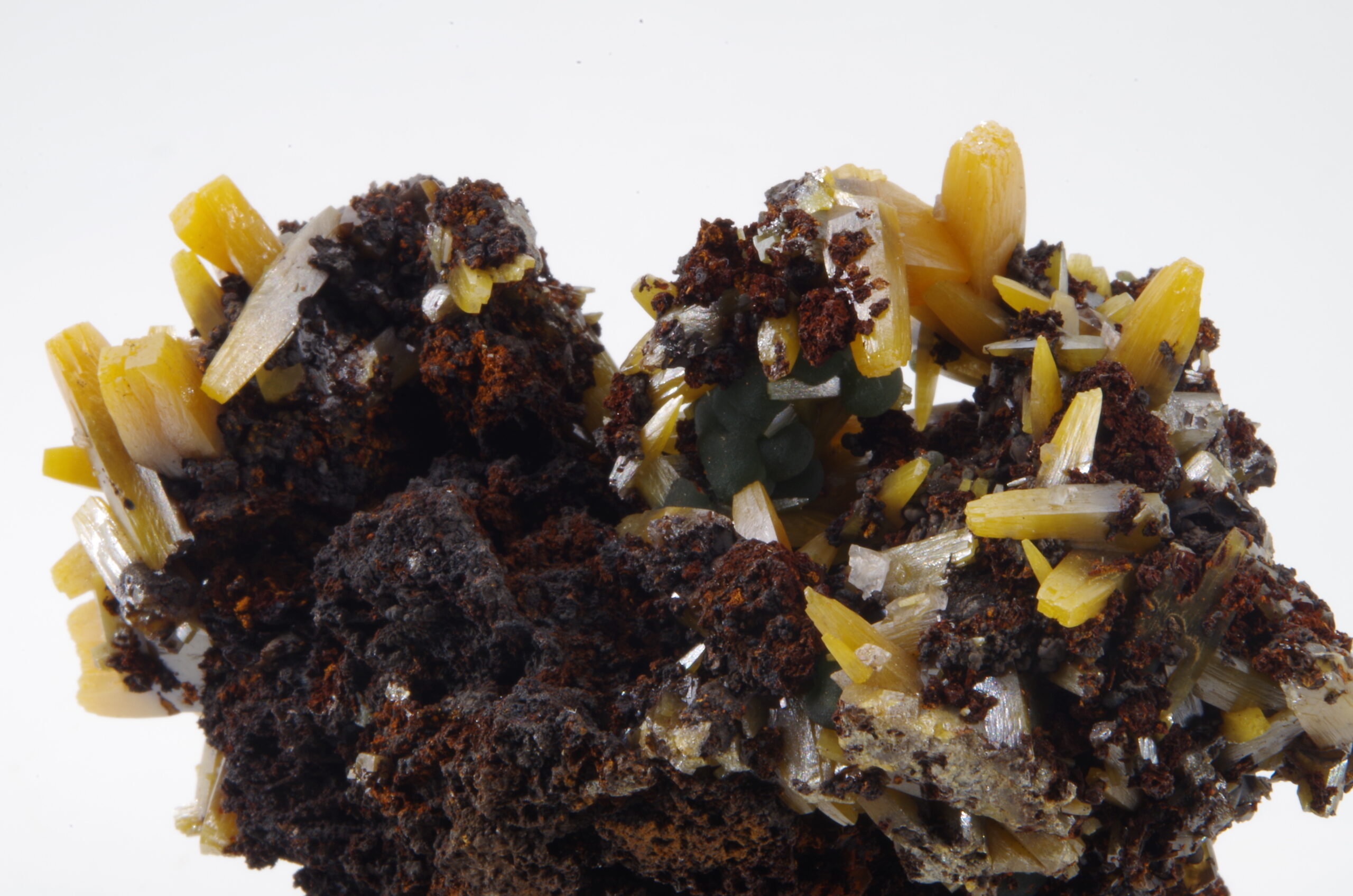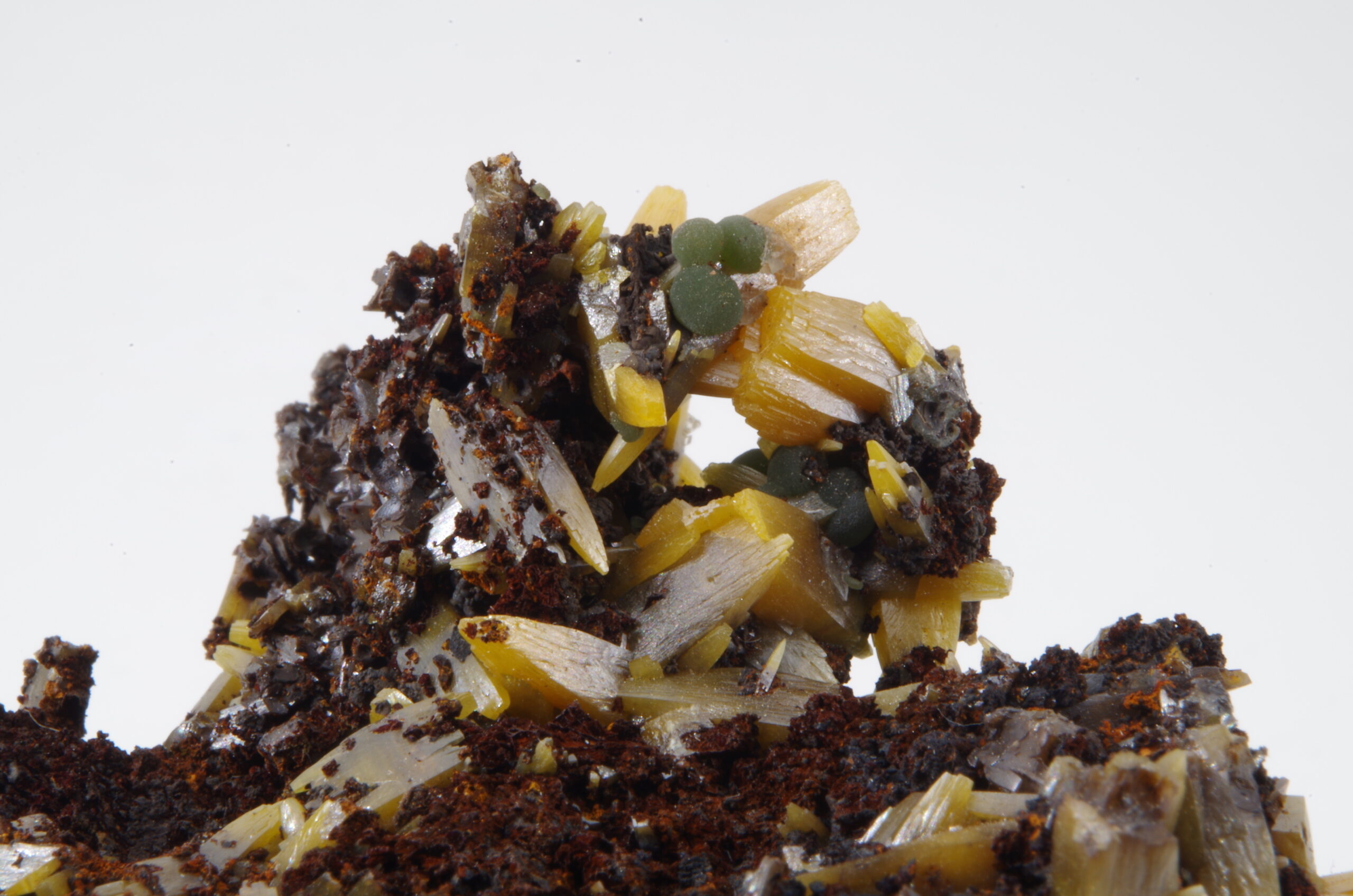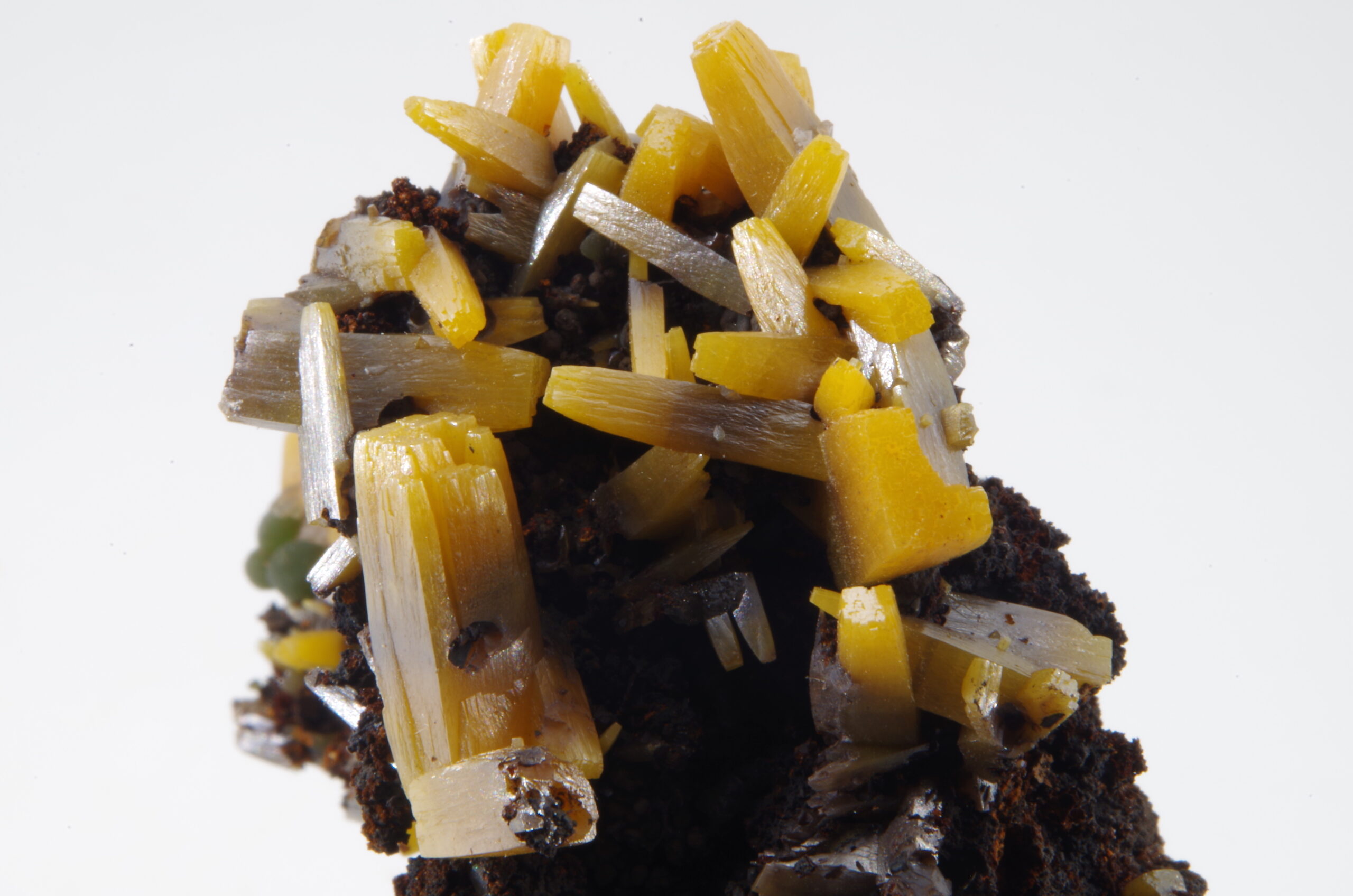 Superbe spécimen de Wulfénite sur matrice de Gossan présentant une cristallisation trapue idéalement positionnée et comportant quelques jolies sphérules de Mimétite.